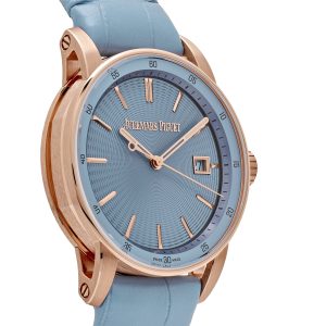 The Audemars Piguet Code 11.59, reference 77410OR.OO.A344CR.01, is a refined 38mm timepiece ideal for smaller wrists. It features an 18-carat pink gold case, a light blue dial with pink gold hour-markers and luminescent hands, and a pearly light blue alligator strap with an 18-carat pink gold pin buckle. With a selfwinding movement, double glareproofed sapphire crystal, and 30-meter water resistance, this watch combines elegance and functionality.