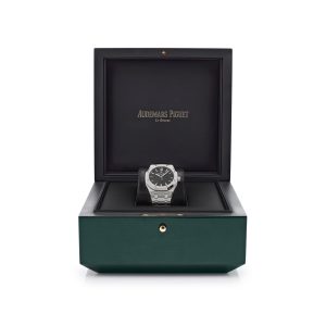 This Royal Oak Selfwinding is designed in a 41mm stainless steel case. It features the recognizable ‘Grand Tapisserie’ pattern on the black dial, white gold stick markers and hands, and a date set at 3 o’clock. The watch is complemented by a stainless steel bracelet and AP folding clasp.