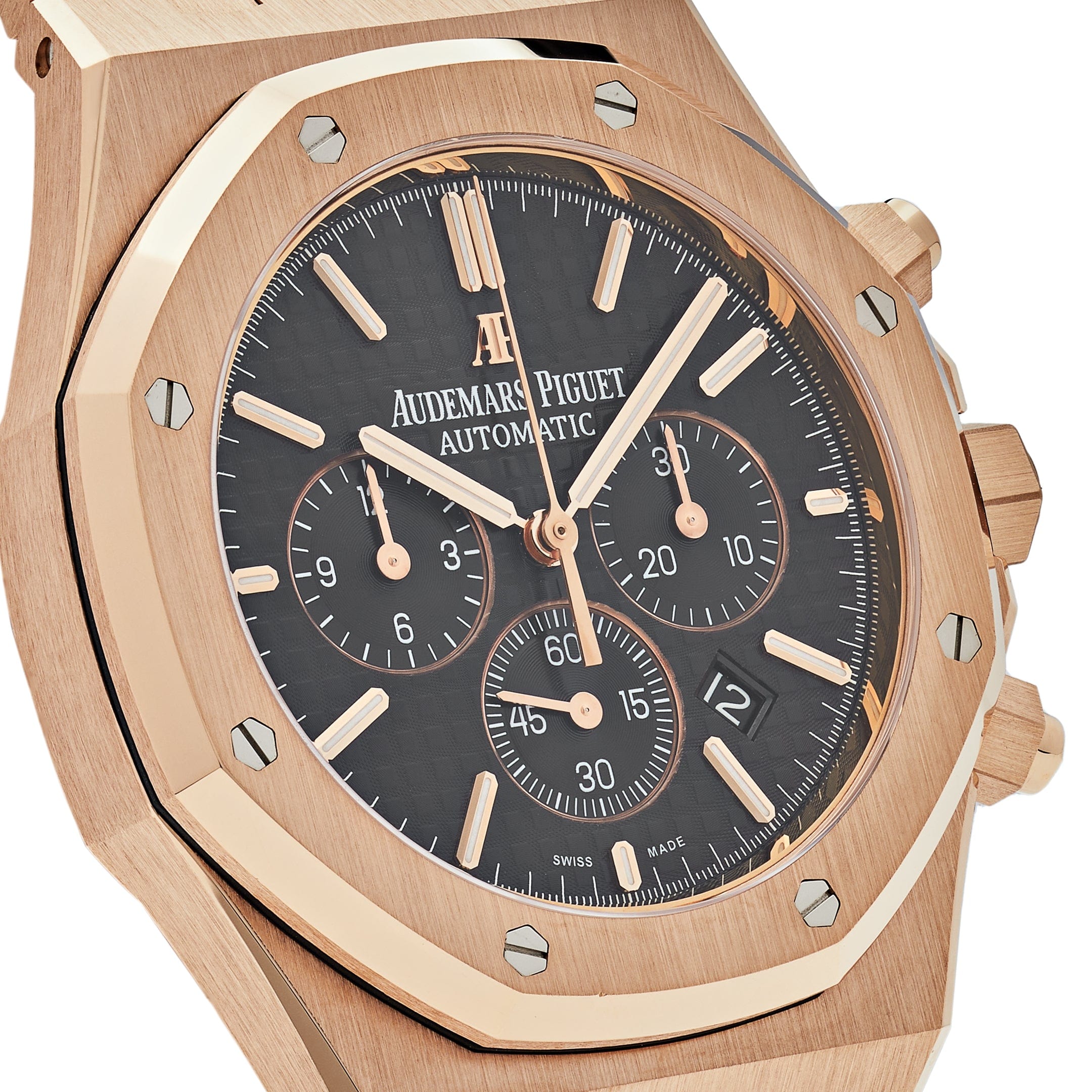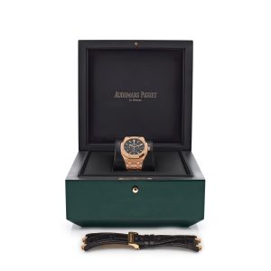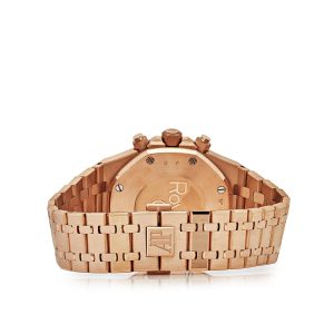 Introducing the Audemars Piguet Royal Oak Selfwinding Chronograph 26320OR.OO.D002CR.01. The 41mm case is made of 18k rose gold and complements the black Grande Tapisserie dial. Luminescent rose gold hand and hour markers work with the Sapphire glare-proofed crystal for optimal legibility in any condition. An exhibition case back gives a glimpse at the Calibre 4401 in action, powering all of the watch’s complications, including chronograph timekeeping and date features.