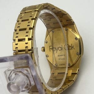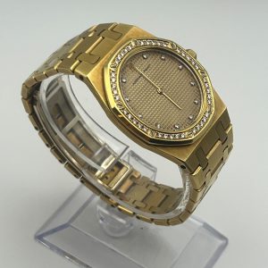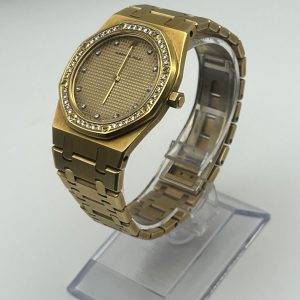 This vintage Audemars Piguet Royal Oak features a 34mm yellow gold case, champagne dial with diamond markers and diamond bezel. The watch has quartz movement and comes on a yellow gold bracelet with a fold-over clasp.