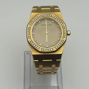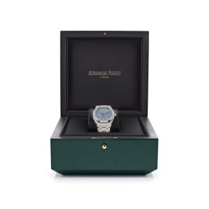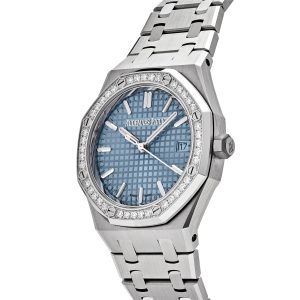 This Royal Oak Selfwinding ’50th Anniversary’ is crafted in a 34mm stainless steel case with a bezel set with brilliant-cut diamonds. The light blue dial features the ‘Grande Tapisserie’ pattern, white gold applied hour-markers and Royal Oak hands with luminescent coating. The watch comes on a stainless steel bracelet with AP folding clasp.