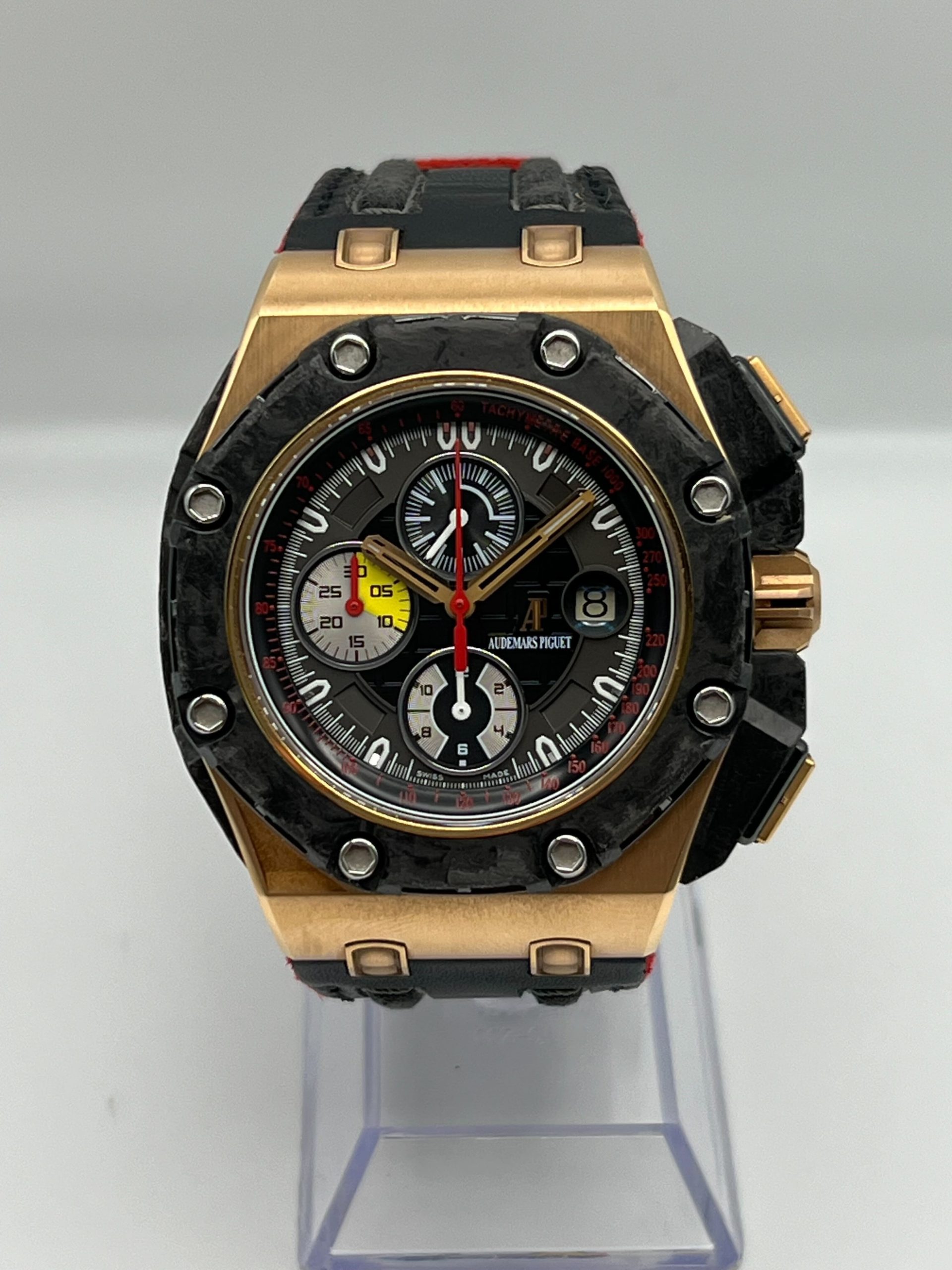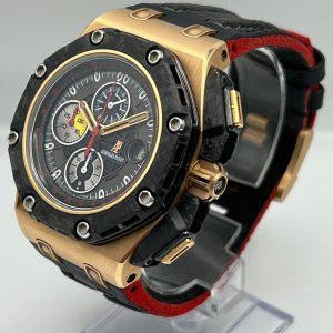 This limited edition Royal Oak Offshore ‘Grand Prix’ Chronograph timepiece is designed with a 44mm rose gold case and a forged carbon and black ceramic bezel. In the center inlays a red and black ‘Mega Tapisserie’ motif dial with eloxed aluminum, bi-color counters and luminous coated gold hands and hour markers. It has a glareproof sapphire-crystal and the caseback is engraved with ‘Royal Oak Offshore Grand Prix – Limited Edition’. It comes on a hand-stitched calf leather bracelet with 18-carat gold pin buckle.