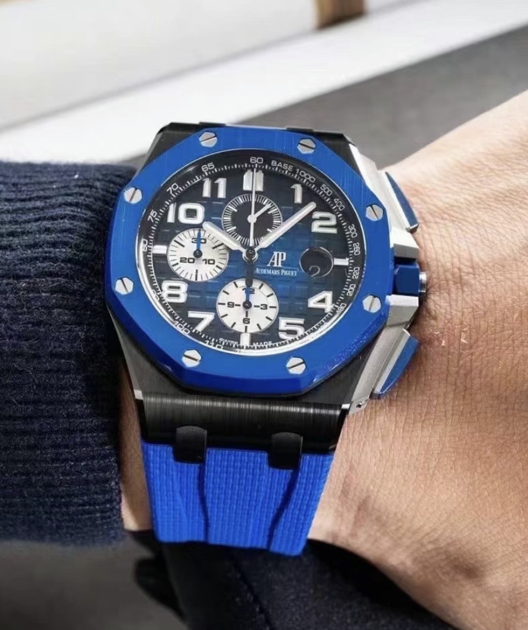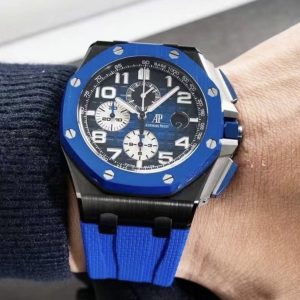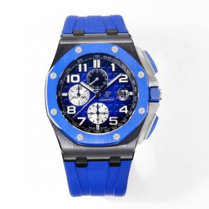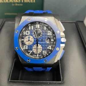 This Royal Oak Offshore is designed with a 44mm black ceramic case and blue ceramic bezel. In the center inlays a blue Mega Tapisserie dial with Arabic numerals. It comes on a blue textured rubber braceletwith a titanium pin buckle.