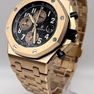 This Royal Oak Offshore Chronograph is designed with a 42mm 18-carat rose gold case and bezel with black ceramic push pieces and screw-locked crown. In the center inlays a stunning black ‘Tapisserie’ dial with rose gold-toned sub-dials.