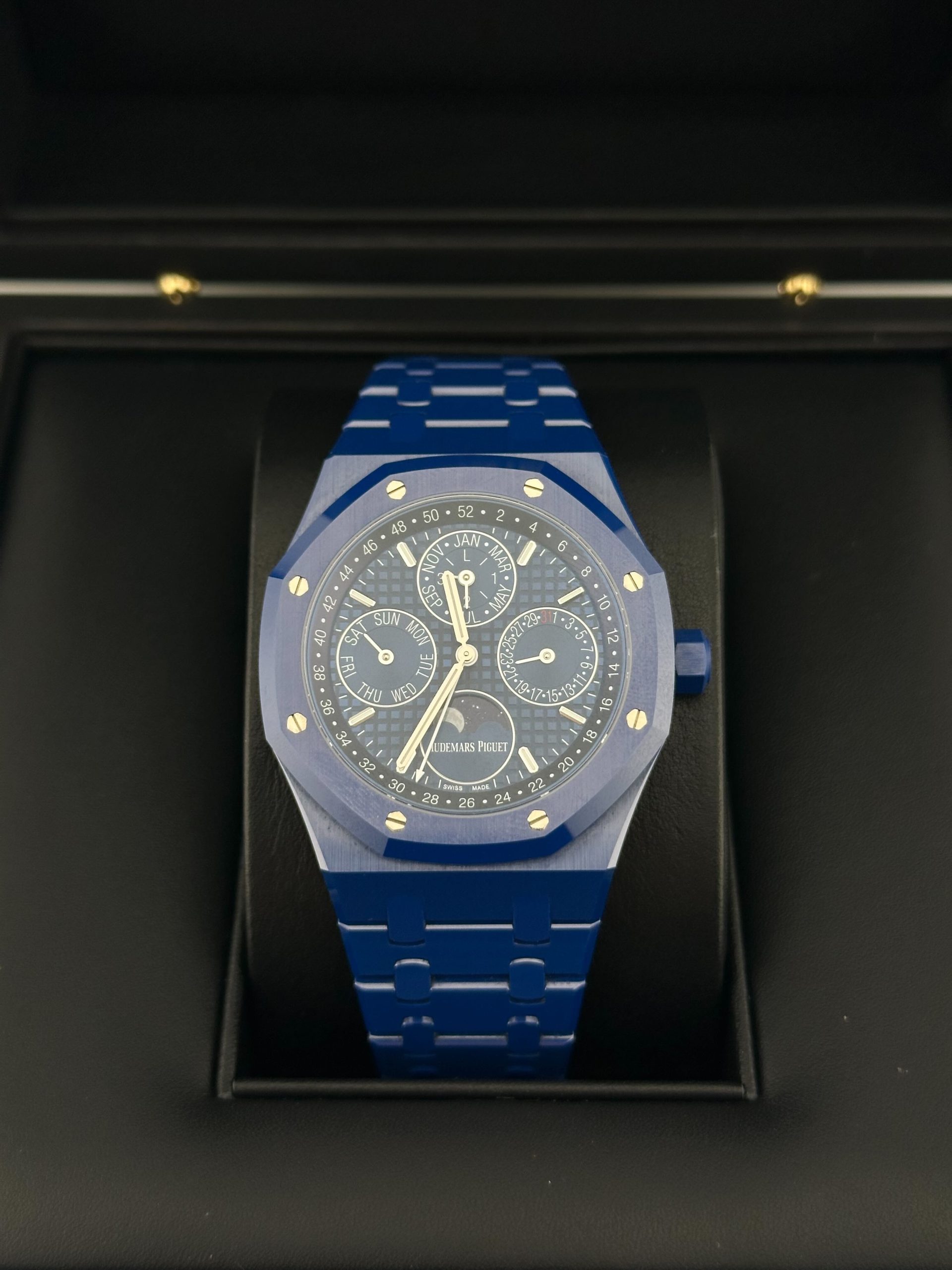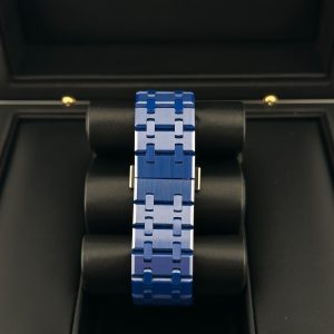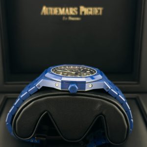 The new Royal Oak Perpetual Calendar in 41mm presents for the first time a case and bracelet fully crafted in blue ceramic. The matching blue Grande Tapisserie dial and subdials further bestow the timepiece with an air of starlit sky. The dial also features blue counters, white gold applied hour-markers and Royal Oak hands with luminescent coating, and a blue inner bezel. The watch comes on a blue ceramic bracelet with AP folding clasp in blackened polished steel.