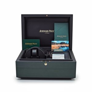 The Royal Oak Perpetual Calendar is designed in a 41mm black ceramic case. The openwork dial features the day, date, month and moon phases within it’s four rose gold sub-dials. The watch comes on a black ceramic bracelet with an AP folding clasp.