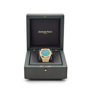 This Audemars Piguet Royal Oak Selfwinding is crafted in a 37mm yellow gold case and styled on a matching gold bracelet. The turquoise dial hosts yellow gold stick hour markers and hosts a date window at 3 o’clock. Composed of the finest materials, AP has revived natural elements of the earth and transcended them onto the wrist.