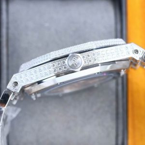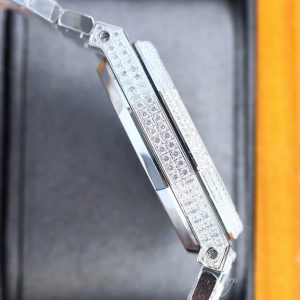 Fully iced out with VS clarity diamonds in F color. Stainless steel case with a stainless steel bracelet