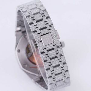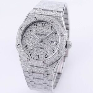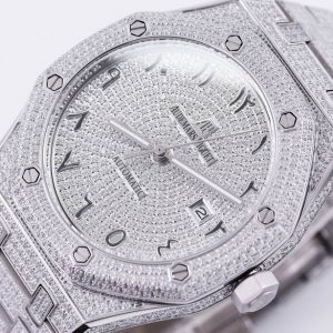Audemars Piguet Royal Oak in 41mm is an exquisite timepiece that merges the iconic design of Audemars Piguet with bespoke luxury. Featuring a striking Arabic dial, this watch is encrusted with moissanites, providing a dazzling brilliance comparable to diamonds. Despite incorporating aftermarket components, these enhancements are meticulously crafted to elevate the watch’s aesthetic appeal while maintaining its original sophistication. The “Iced Out” model is powered by a flawless Swiss movement, ensuring exceptional precision and reliability. This custom creation is perfect for collectors who value the fusion of traditional Swiss watchmaking excellence with modern, personalized elegance.