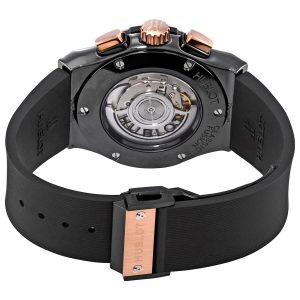 Polished black ceramic case with a black (lined) rubber strap. Fixed 18kt rose gold bezel with 6 polished “h” style titanium screws. Black dial with rose gold hands and index hour markers. Minute markers around the outer rim. Dial Type: Analog. Date display at the 6 o’clock position. Chronograph – two sub-dials displaying: 60 second and 30 minute. Hublot calibre HUB1143 automatic movement, based upon ETA 2892-A2, containing 59 Jewels, bitting at 28800 vph, and has a power reserve of approximately 42 hours. Scratch resistant sapphire crystal. Pull / push crown. Transparent see through case back. Round case shape. Case size: 45 mm. 18kt king gold and black stainless steel deployant clasp. Water resistant at 50 meters / 165 feet. Functions: chronograph, date, hour, minute, second. Classic Fusion Series. Luxury watch style. Watch label: Swiss Made. Hublot Classic Fusion Chronograph Automatic Black Dial Men’s Watch 521.CO.1181.RX.