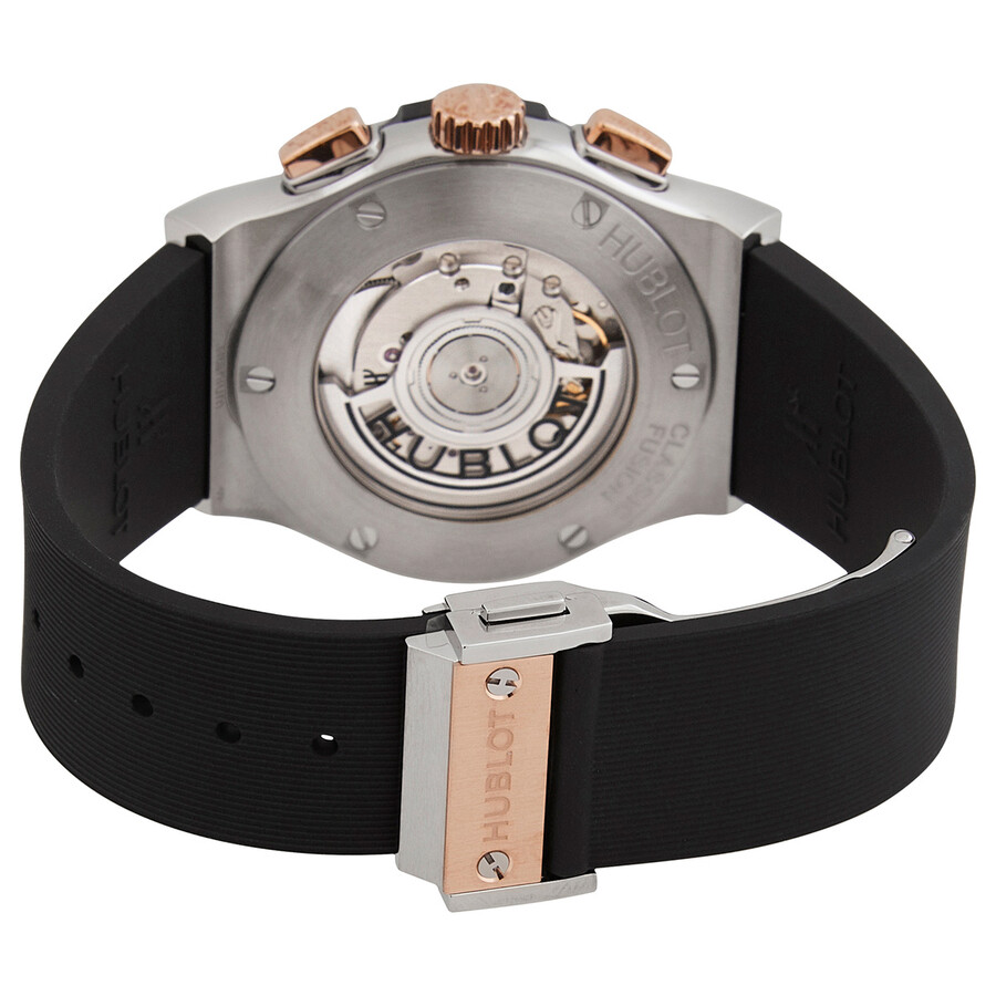 Grey titanium case with a black rubber strap. Fixed 18kt rose gold bezel. Matte black dial with rose gold-tone hands and index hour markers. Minute markers around the outer rim. Dial Type: Analog. Date display at the 6 o’clock position. Chronograph – two sub-dials displaying: 60 second and 30 minute. Hublot calibre HUB1153 automatic movement, containing 35 Jewels, composed of 155 parts, bitting at 28800 vph, and has a power reserve of approximately 42 hours. Scratch resistant sapphire crystal. Pull / push crown. Transparent case back. Round case shape. Case size: 42 mm. Deployant clasp. Water resistant at 50 meters / 165 feet. Functions: chronograph, date, hour, minute, second. Classic Fusion Series. Luxury watch style. Watch label: Swiss Made. Hublot Classic Fusion Chronograph Automatic Matte Black Dial Men’s Watch 541.NO.1181.RX.