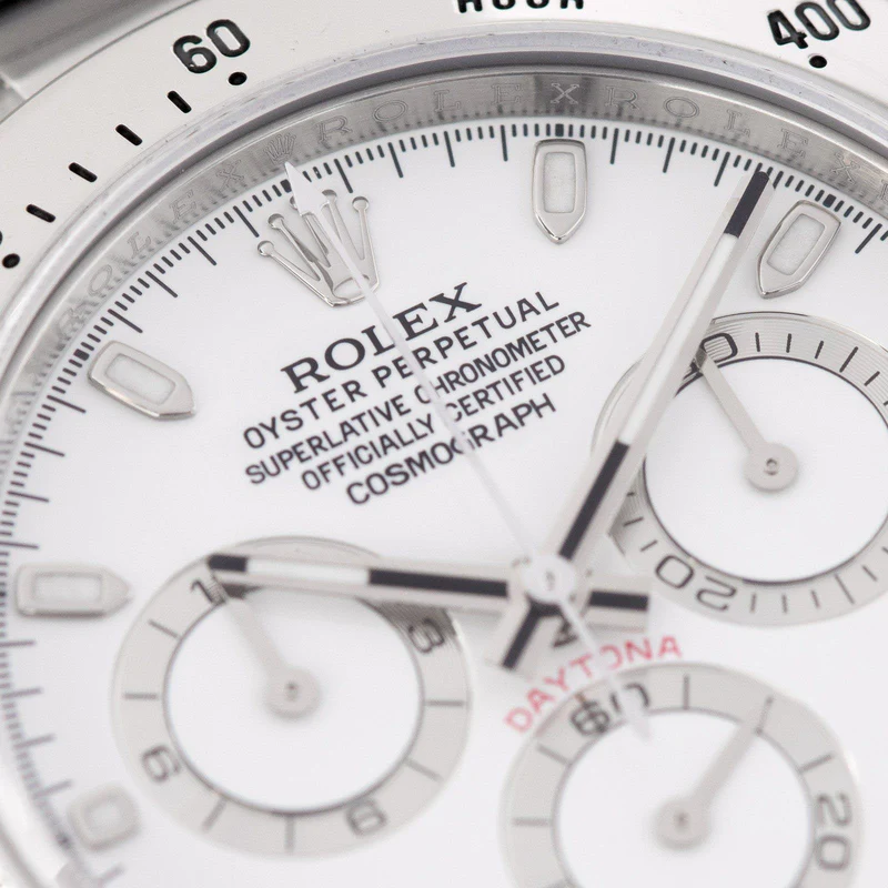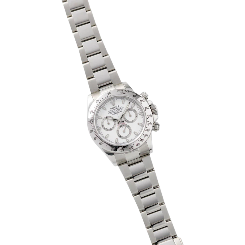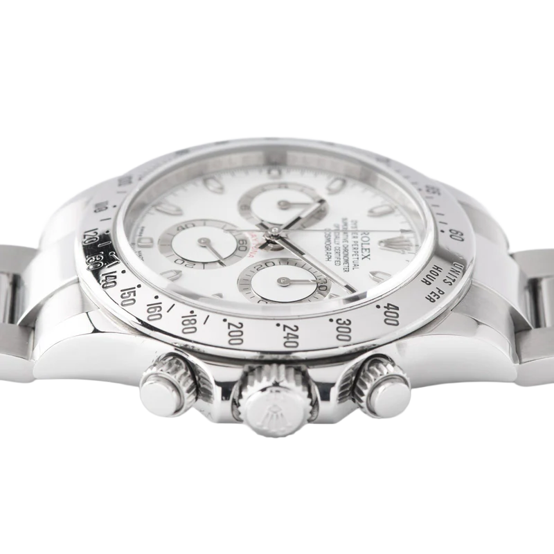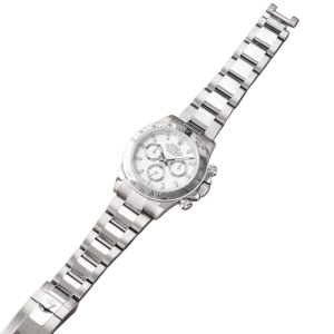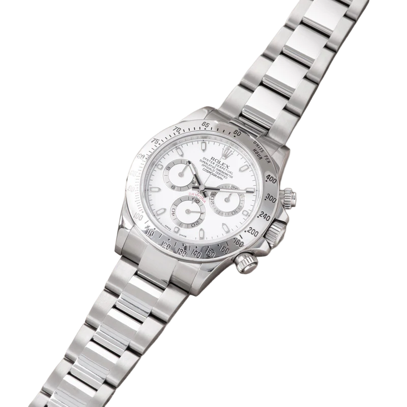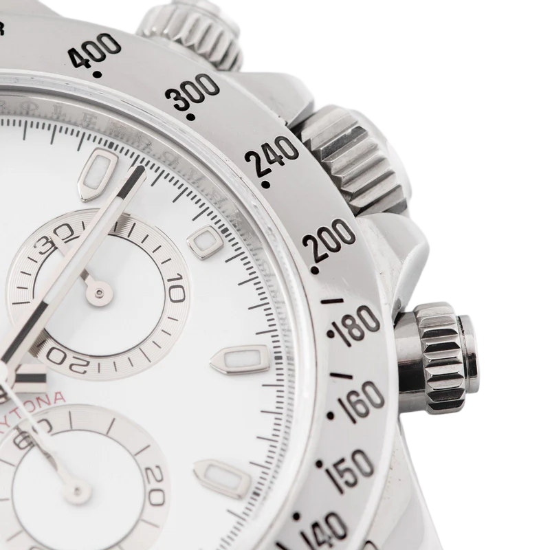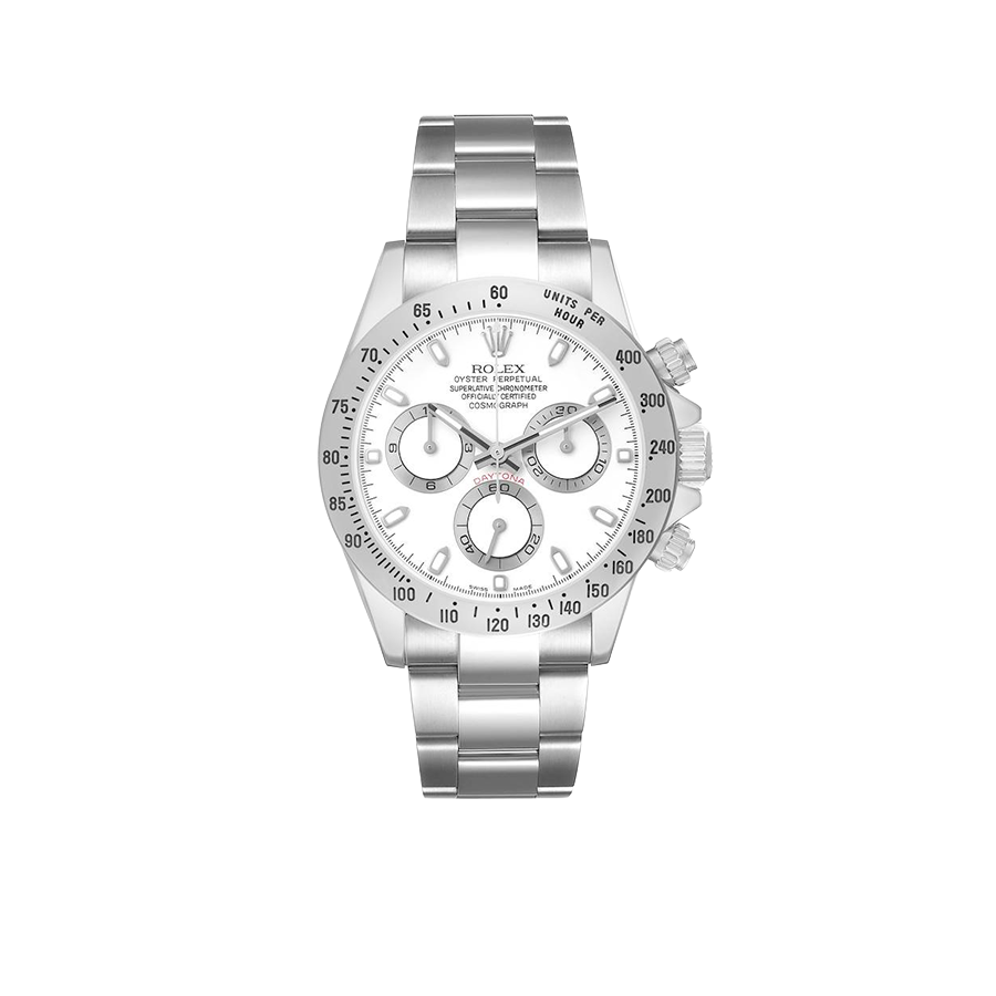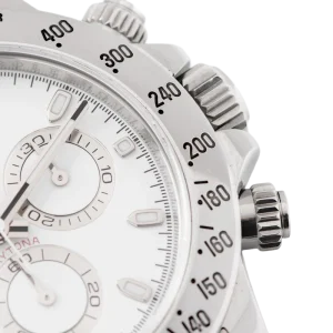 Shortly after it came to market in the 1960’s, the Rolex Cosmograph Daytona found its place in the fast-paced world of professional racecar driving. With a highly precise movement, chronograph functions, and a Tachymeter bezel, it’s no surprise that the Daytona would be the top choice of professional drivers all over the world. The reference 116520 that is offered here today is a highly coveted variation of the iconic driver’s watch. Noticeably more modern and exquisitely made, the Rolex 116520 features a satin and polished 904L stainless steel finish, a scratch-resistant sapphire crystal, a triple-sealed waterproof Triplock screw-down crown, and a secure Oysterlock clasp. The side pushers give this men’s sports watch an aesthetically pleasing design and can be used to engage the counters and chronograph hand.