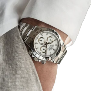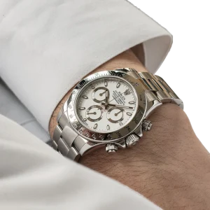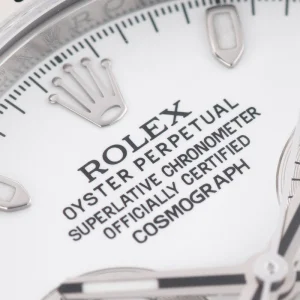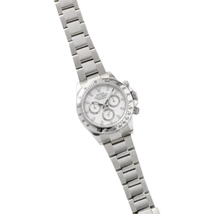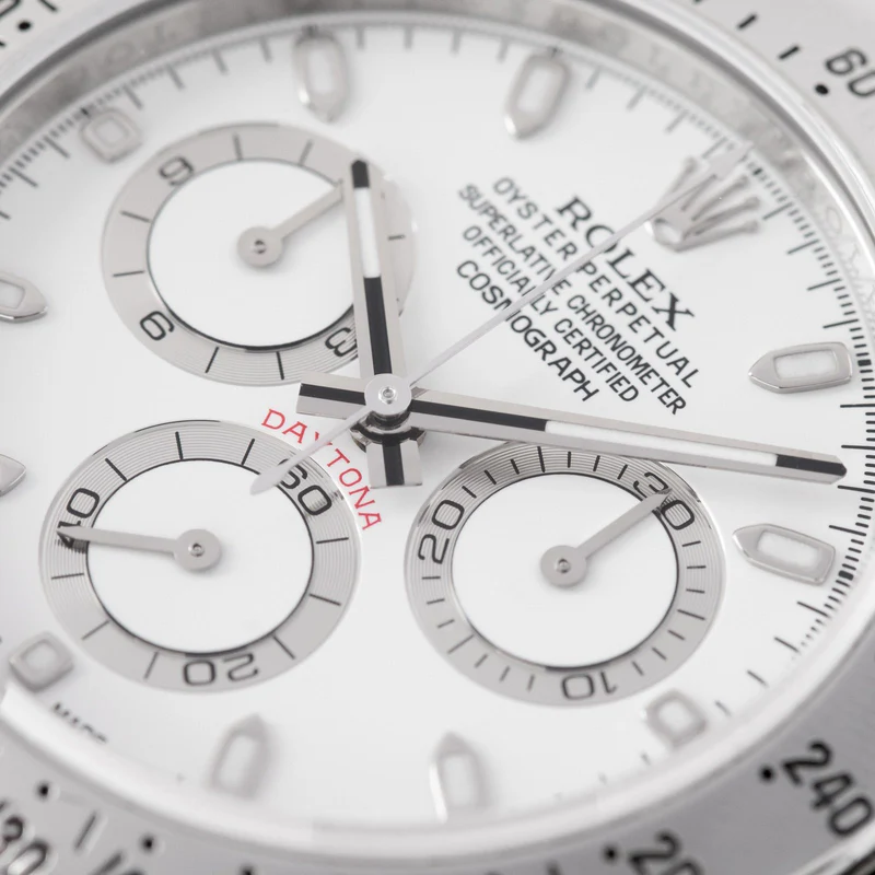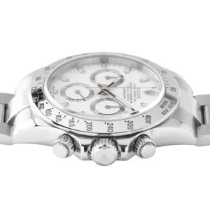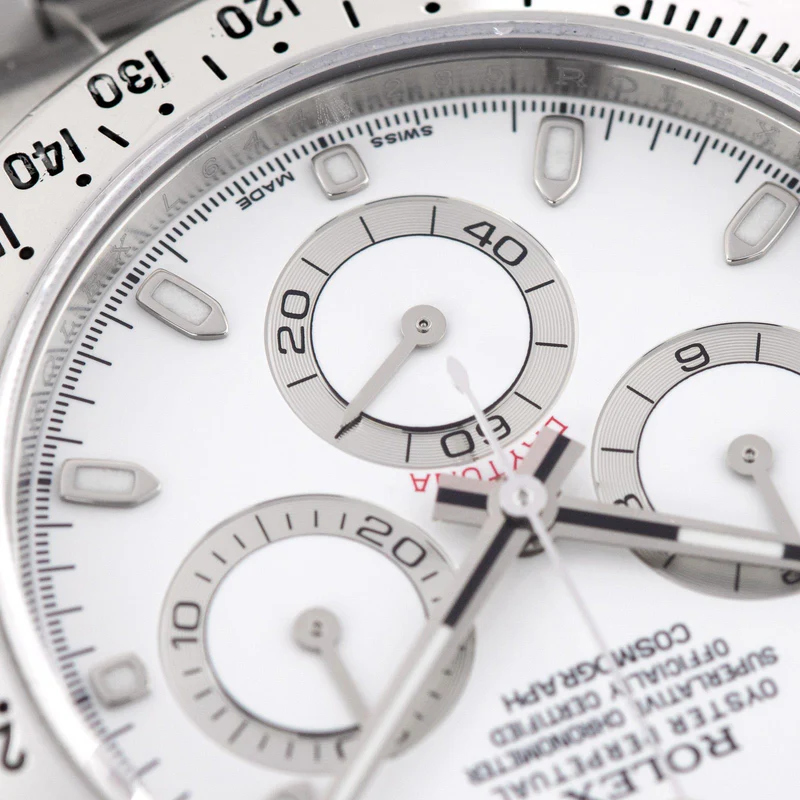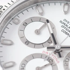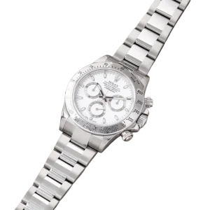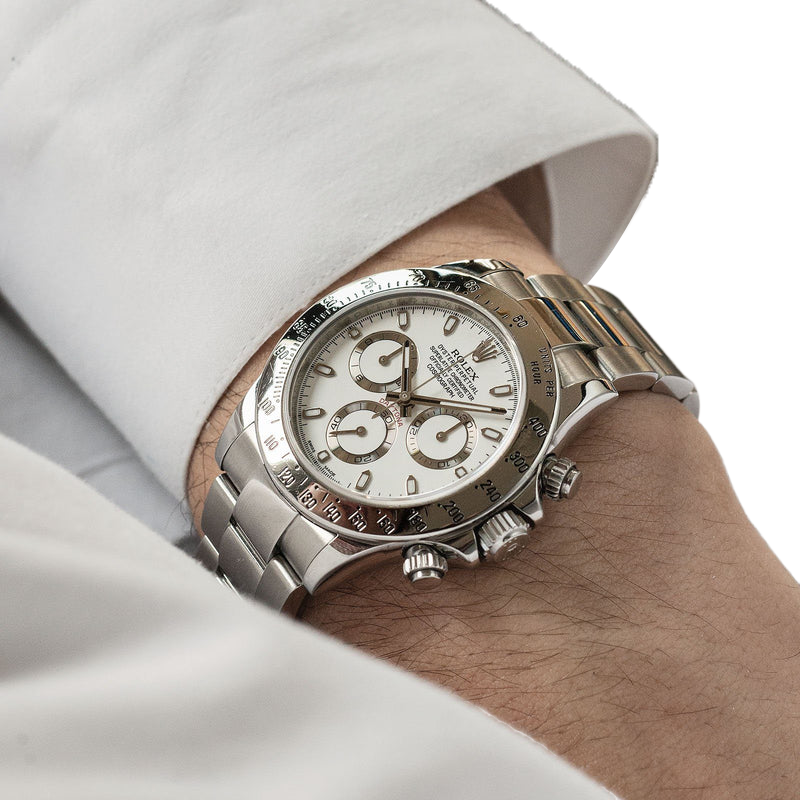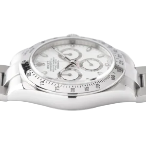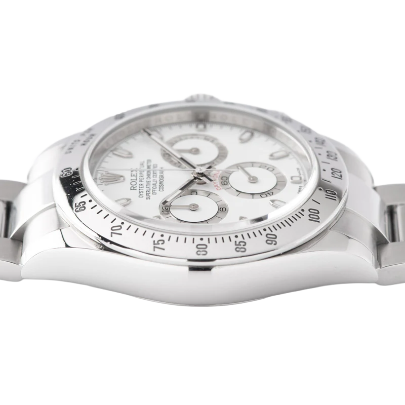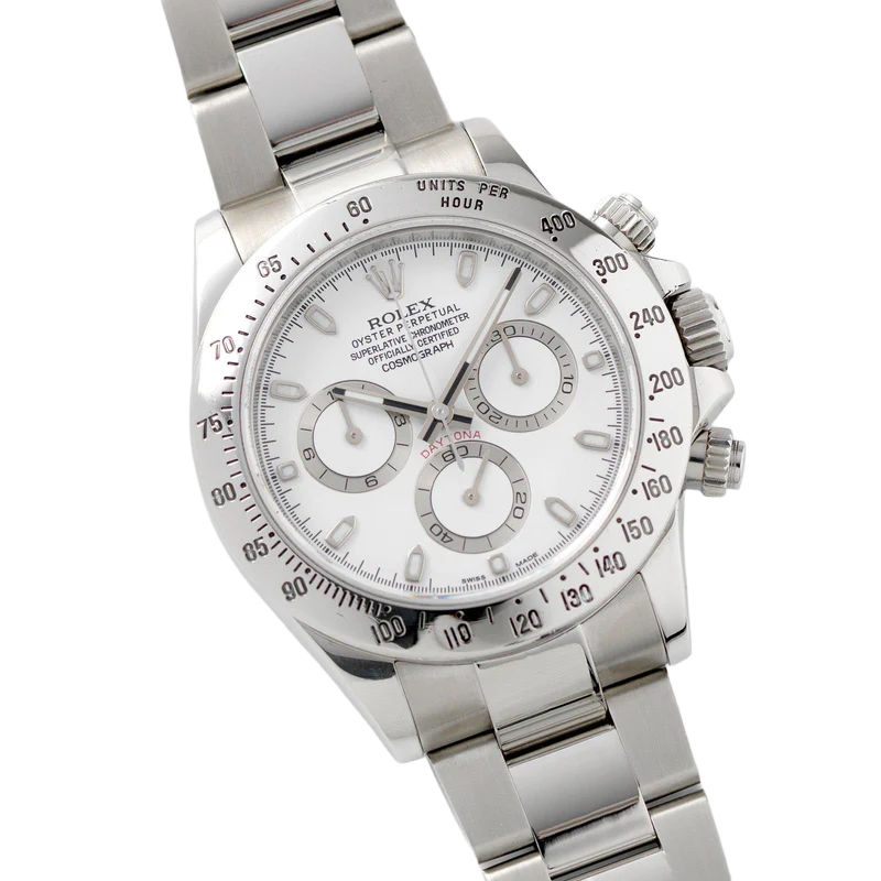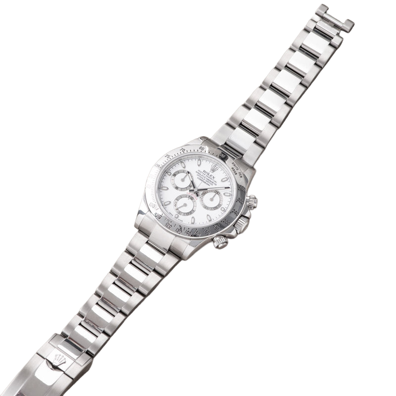 Shortly after it came to market in the 1960’s, the Rolex Cosmograph Daytona found its place in the fast-paced world of professional racecar driving. With a highly precise movement, chronograph functions, and a Tachymeter bezel, it’s no surprise that the Daytona would be the top choice of professional drivers all over the world. The reference 116520 that is offered here today is a highly coveted variation of the iconic driver’s watch. Noticeably more modern and exquisitely made, the Rolex 116520 features a satin and polished 904L stainless steel finish, a scratch-resistant sapphire crystal, a triple-sealed waterproof Triplock screw-down crown, and a secure Oysterlock clasp. The side pushers give this men’s sports watch an aesthetically pleasing design and can be used to engage the counters and chronograph hand.