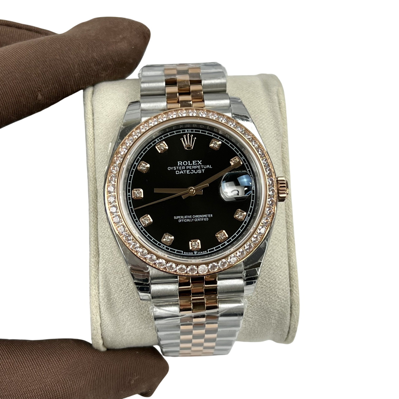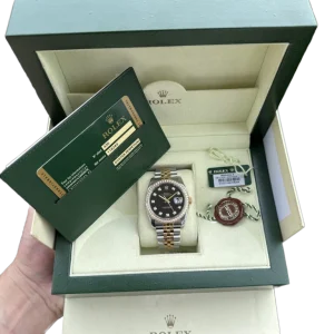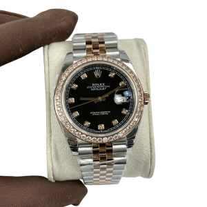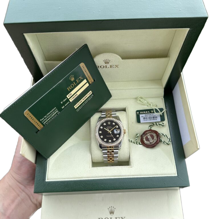 Dial: Black dial with original Rolex factory diamond hour markers and yellow gold baton hands. Date window at the 3 o’clock aperture.