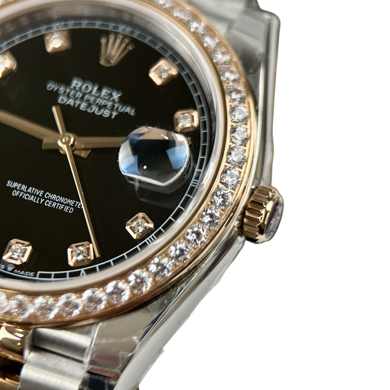 Bezel: 18k yellow gold original Rolex factory diamond set bezel.