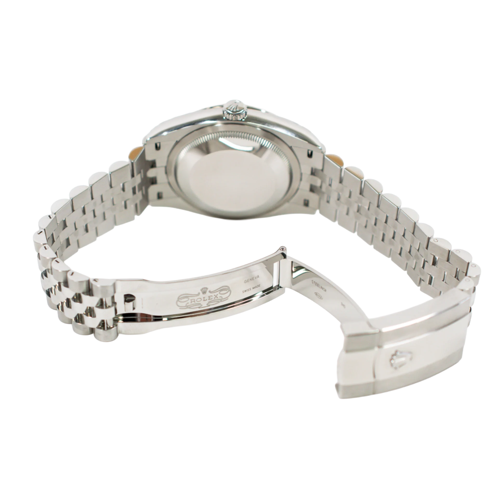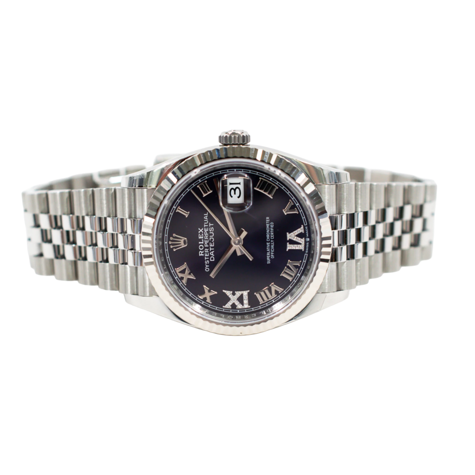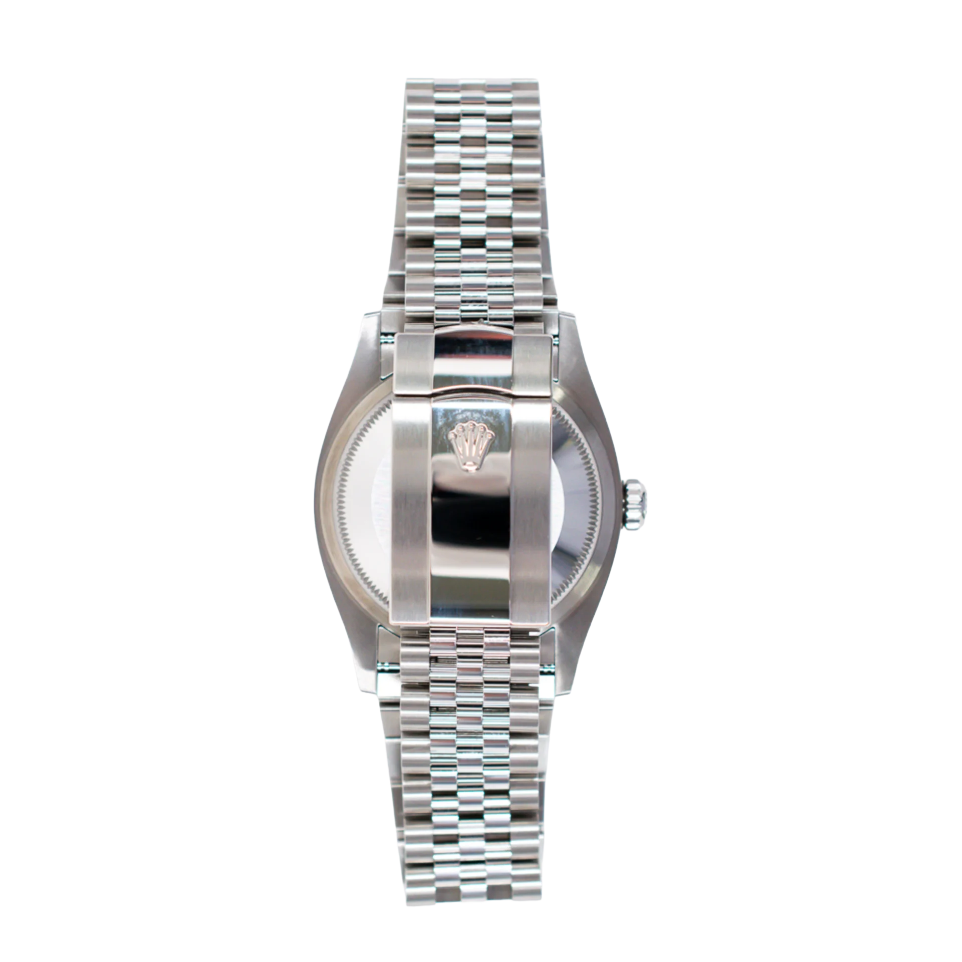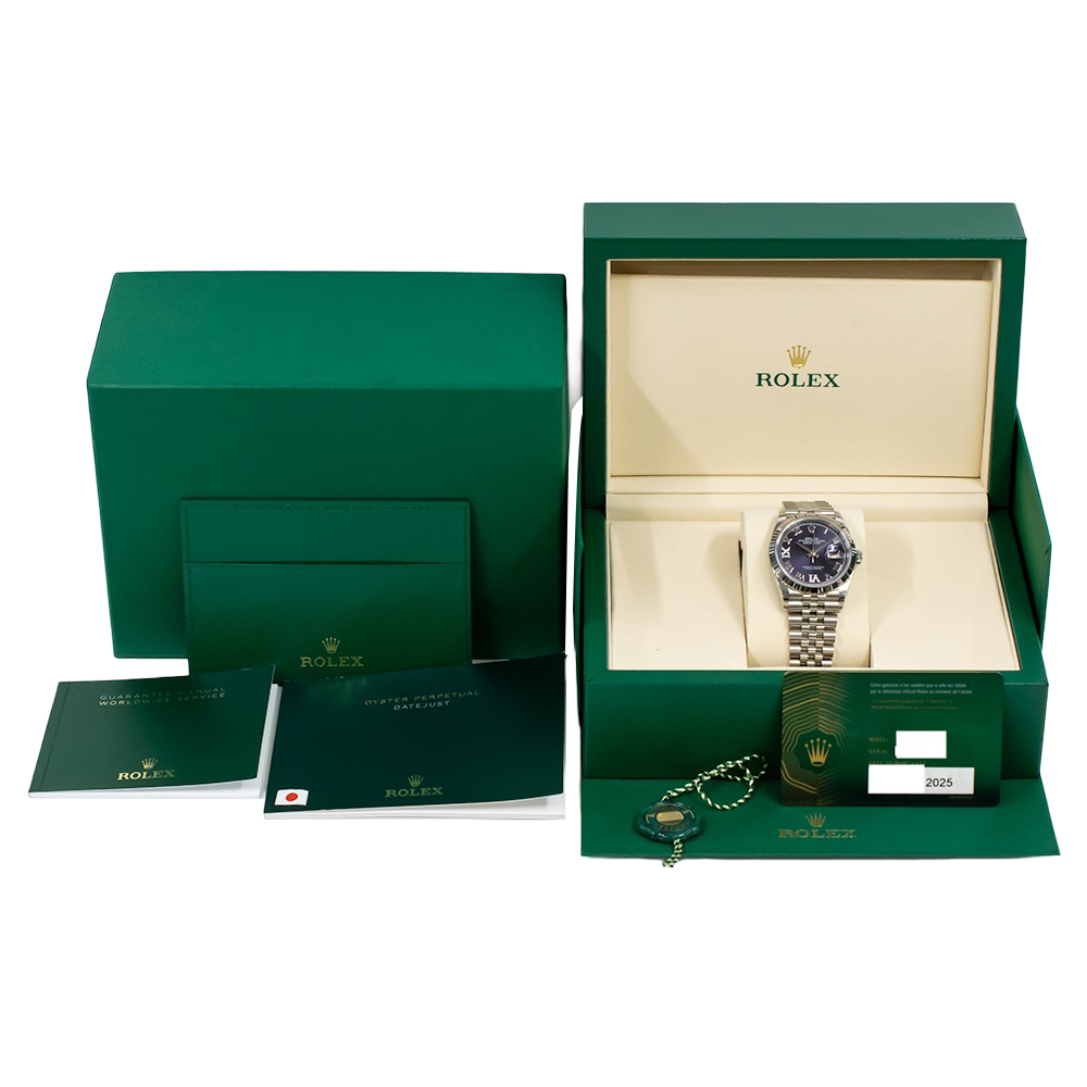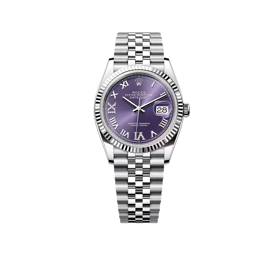The quintessential Rolex Datejust 36 Stainless Steel Jubilee Purple Dial ref. 126234 combines understated elegance with craftsmanship of the highest order. Created from white gold, a fluted bezel encases a sophisticated striking purple hue. Embellished with applied Roman numerals and smooth sweeping hands, the timepiece boasts legibility while the diamond adorn at 6 and 9 elevates its aesthetic allure. The stainless steel jubilee bracelet exudes heirloom quality. This standout piece also possesses high-level performance. Assuring legibility and timeless style with every tick, this versatile timepiece will accompany you through life’s most cherished milestones and be treasured through generations.
