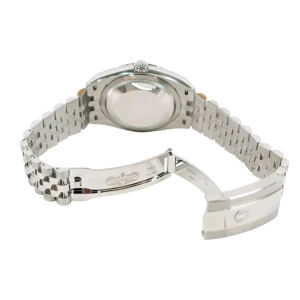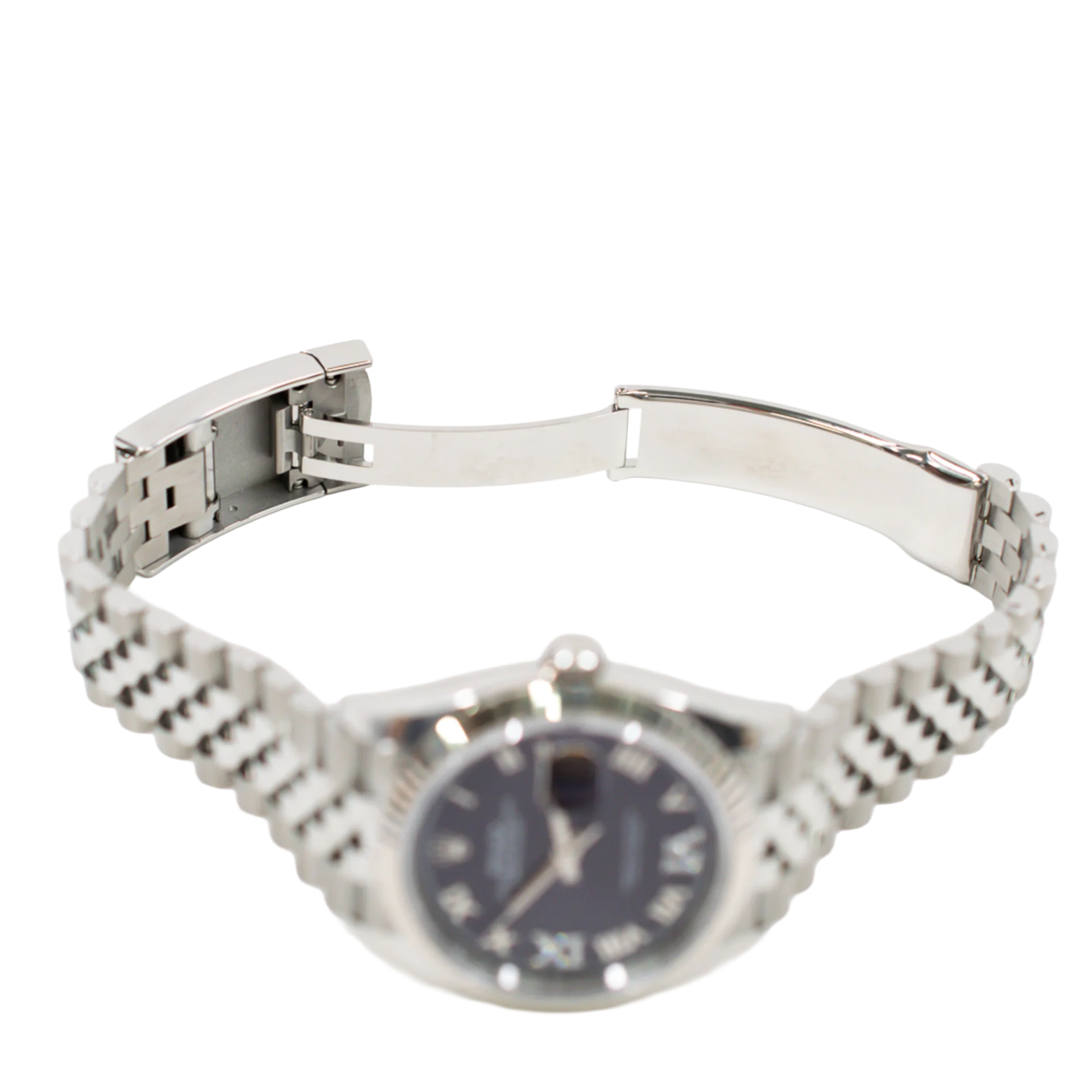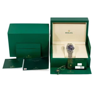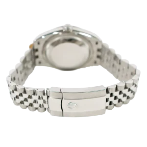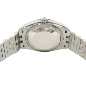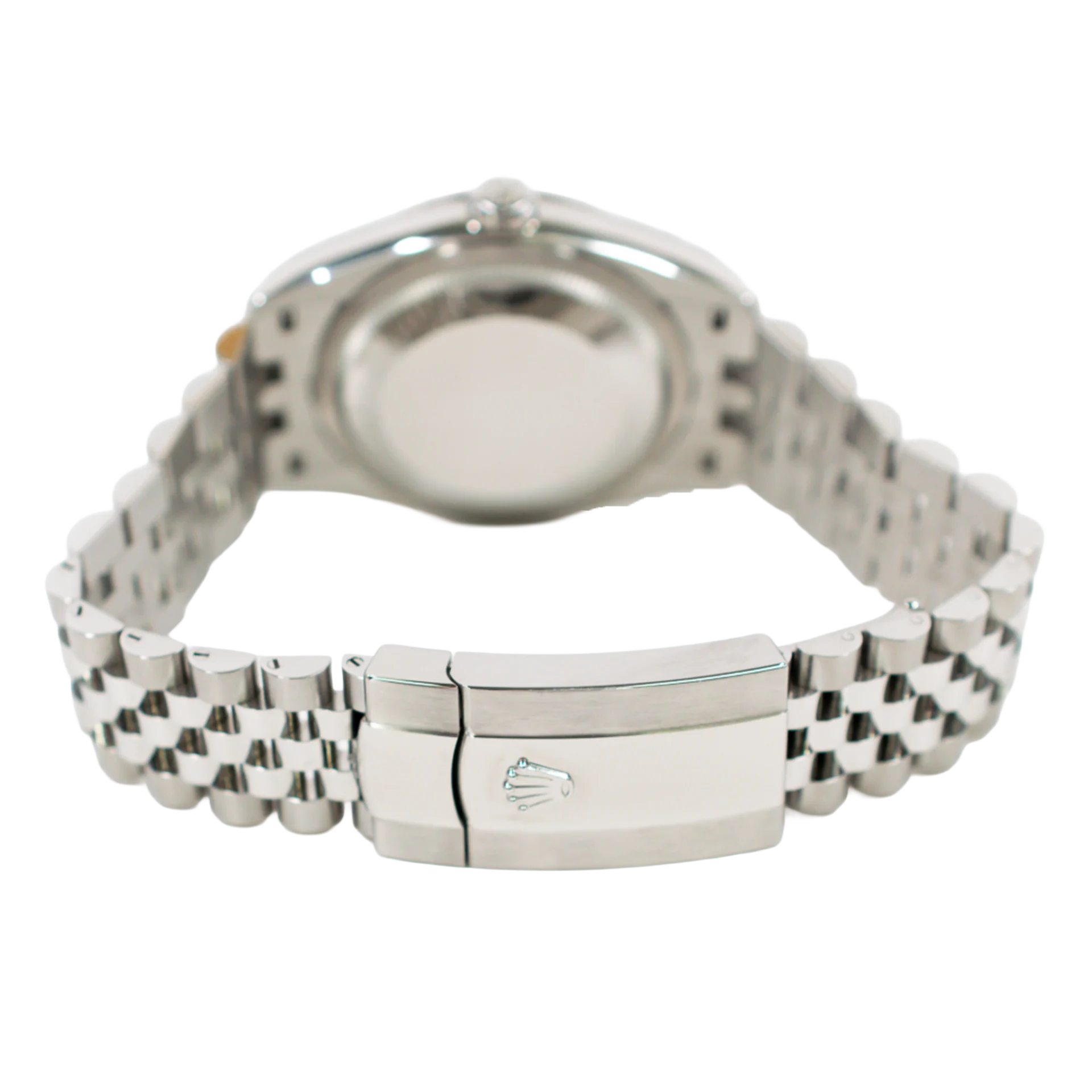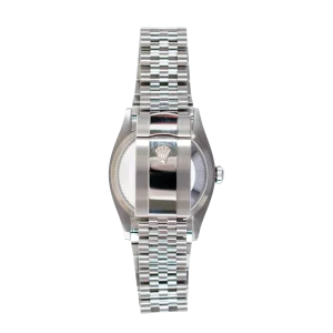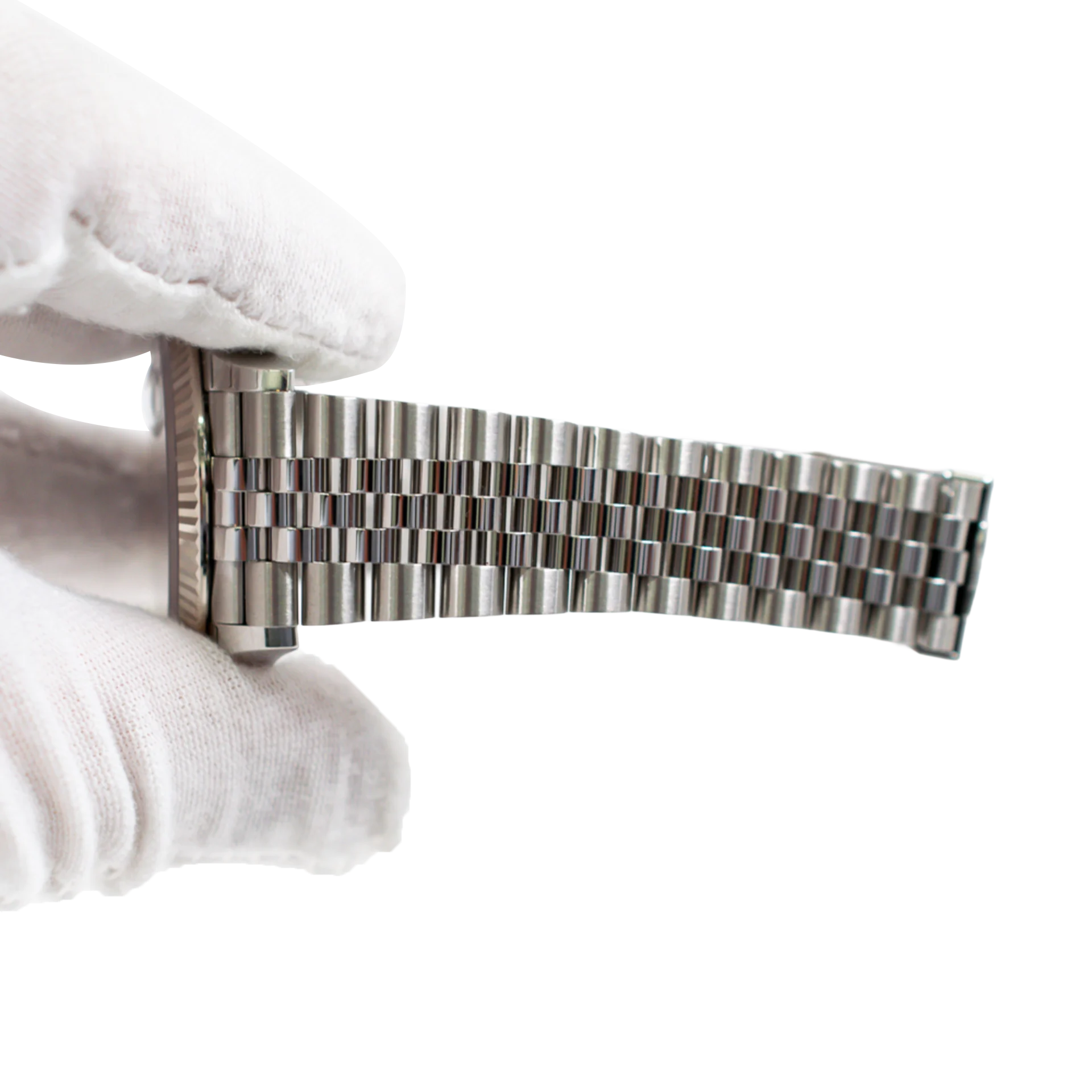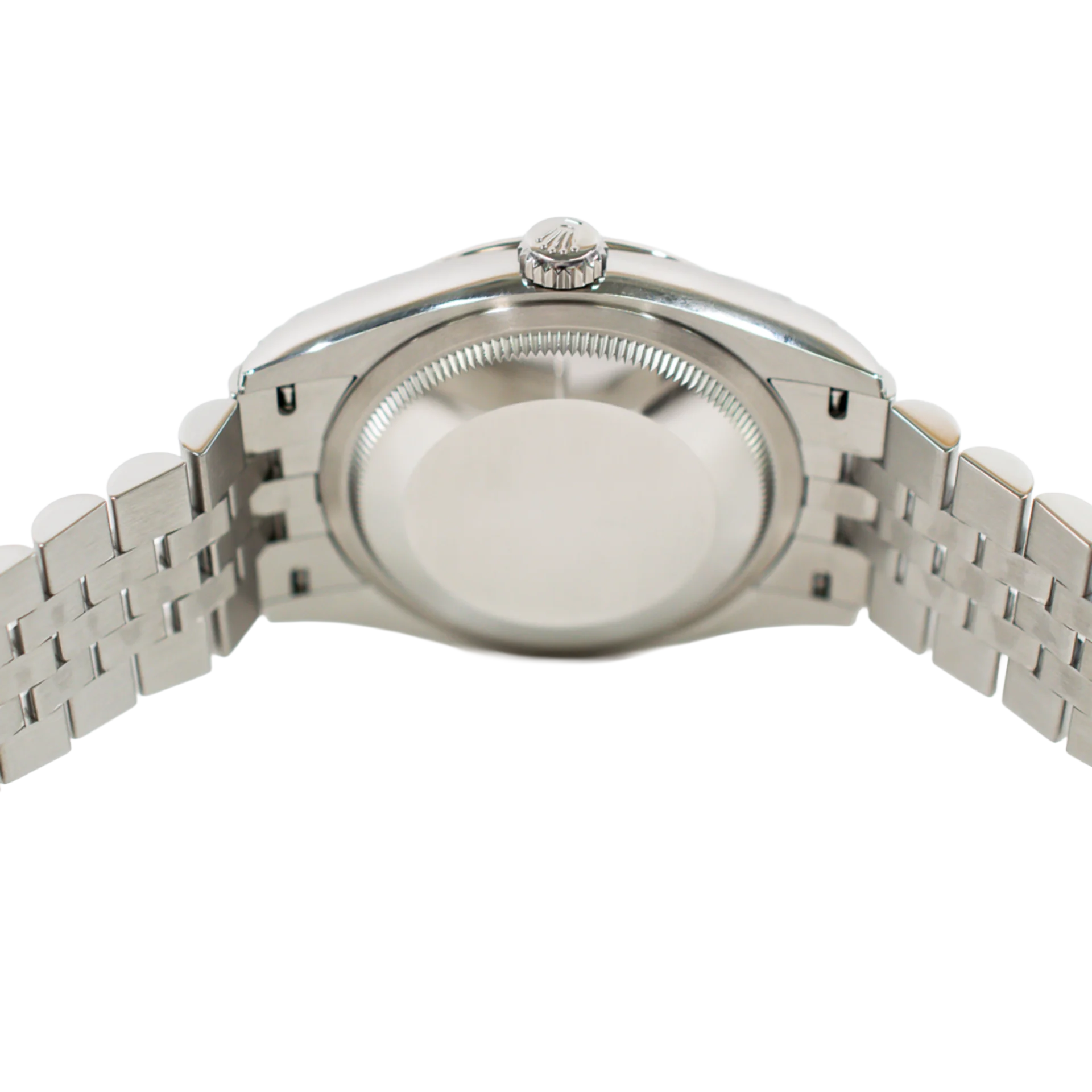 The quintessential Rolex Datejust 36 Stainless Steel Jubilee Purple Dial ref. 126234 combines understated elegance with craftsmanship of the highest order. Created from white gold, a fluted bezel encases a sophisticated striking purple hue. Embellished with applied Roman numerals and smooth sweeping hands, the timepiece boasts legibility while the diamond adorn at 6 and 9 elevates its aesthetic allure. The stainless steel jubilee bracelet exudes heirloom quality. This standout piece also possesses high-level performance. Assuring legibility and timeless style with every tick, this versatile timepiece will accompany you through life’s most cherished milestones and be treasured through generations.
