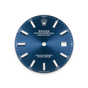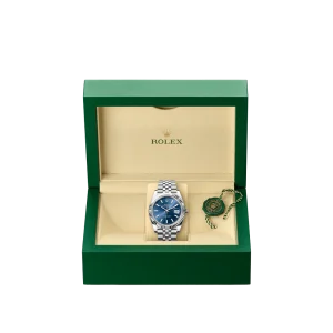 Rolex Datejust 41 Blue Dial presents a classic yet modern expression of Rolex’s signature aesthetic, centered around a refined 41mm case with a polished steel-tone finish. The vibrant blue dial adds a sophisticated and versatile character, making the watch suitable for both professional and casual settings.