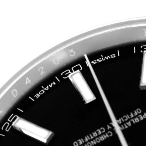 Dial: Bright black dial with luminescent baton hands and hour markers. Central sweeping seconds hand. Minute marker track around the outer rim. Date calendar at the 3 o’clock aperture.
