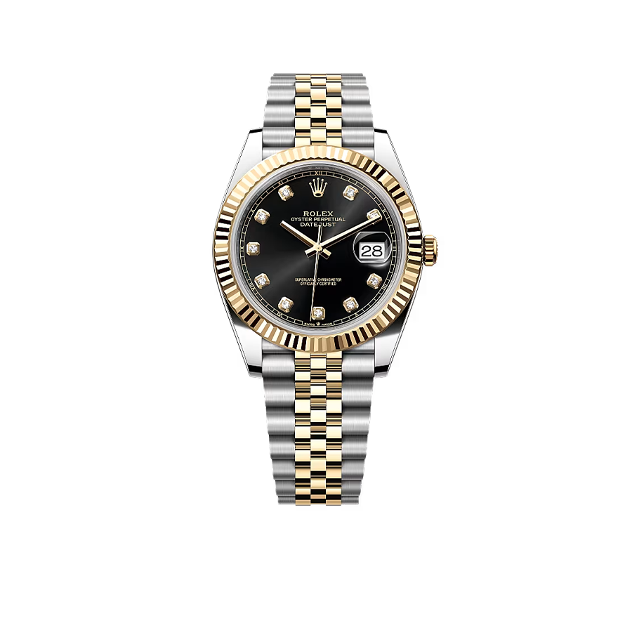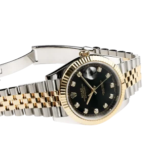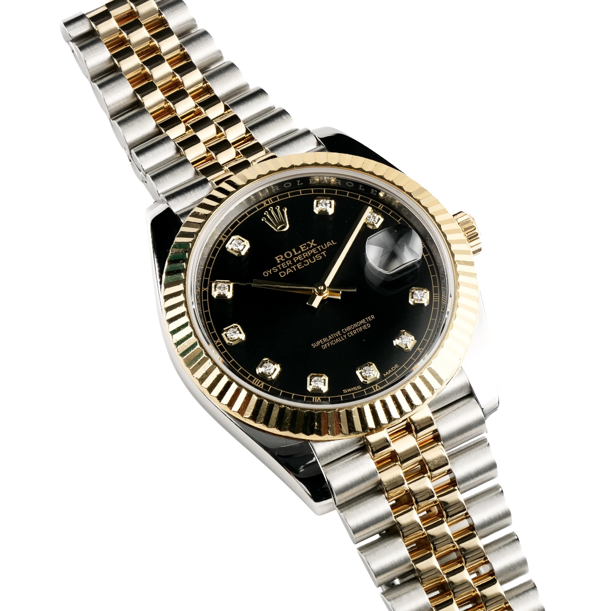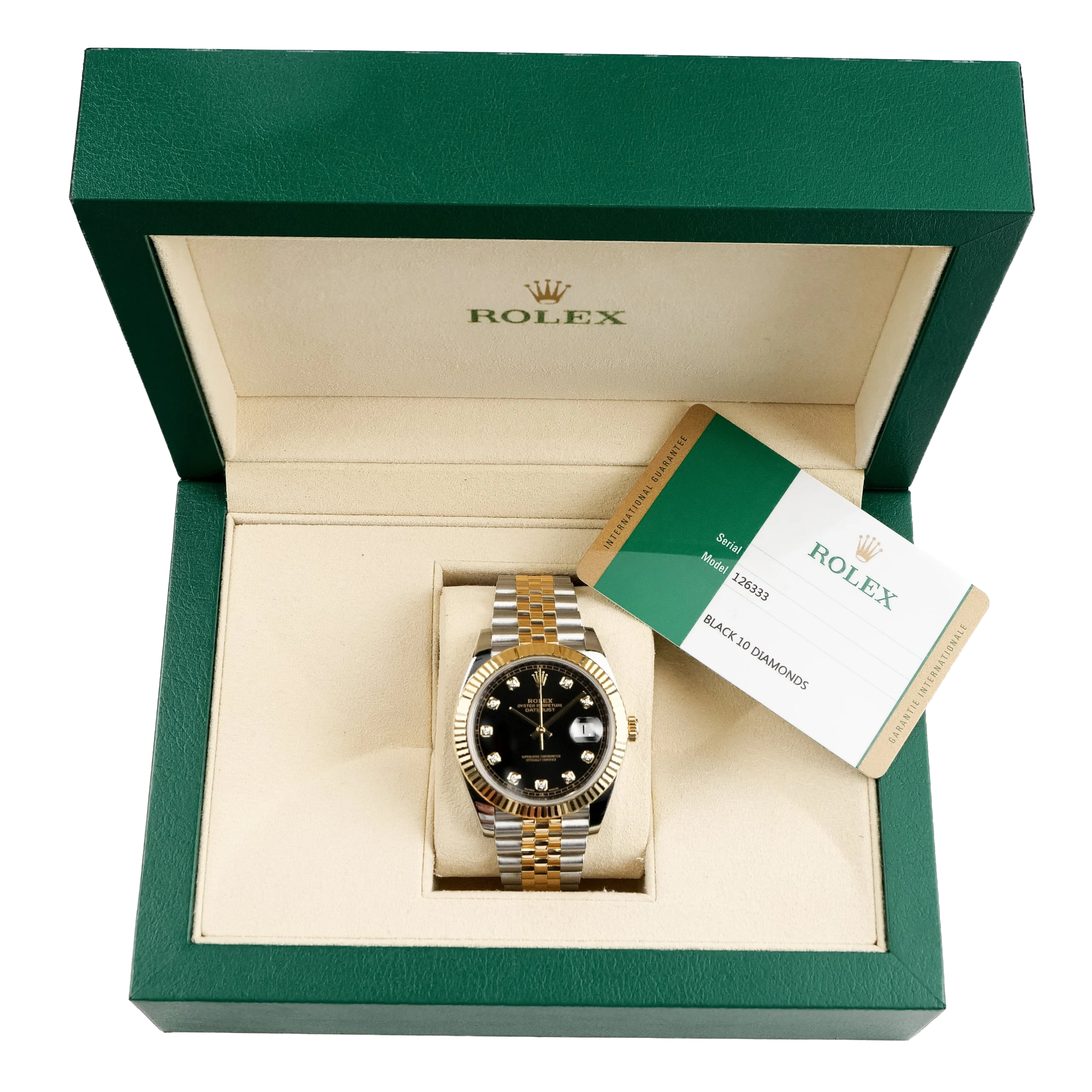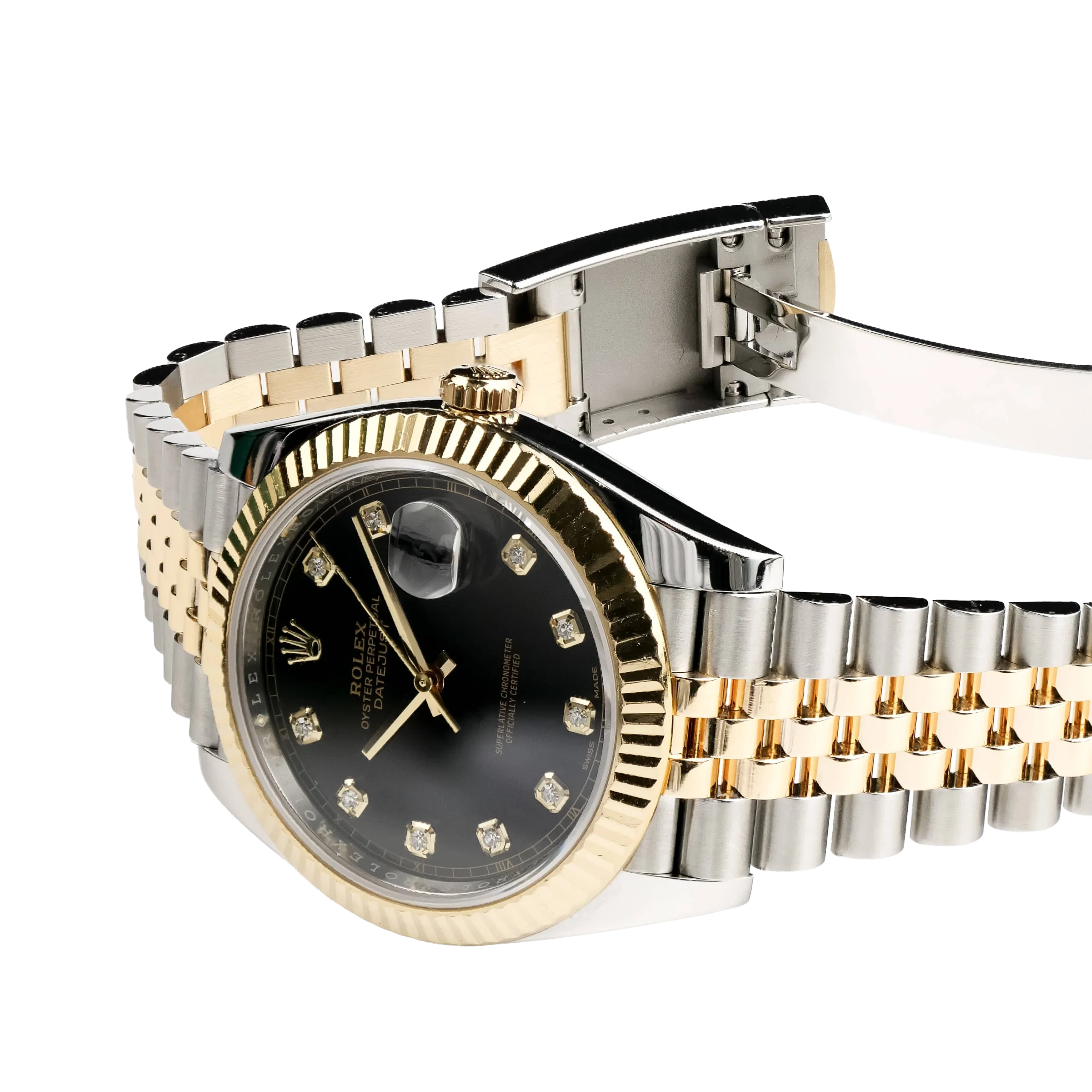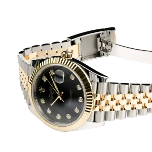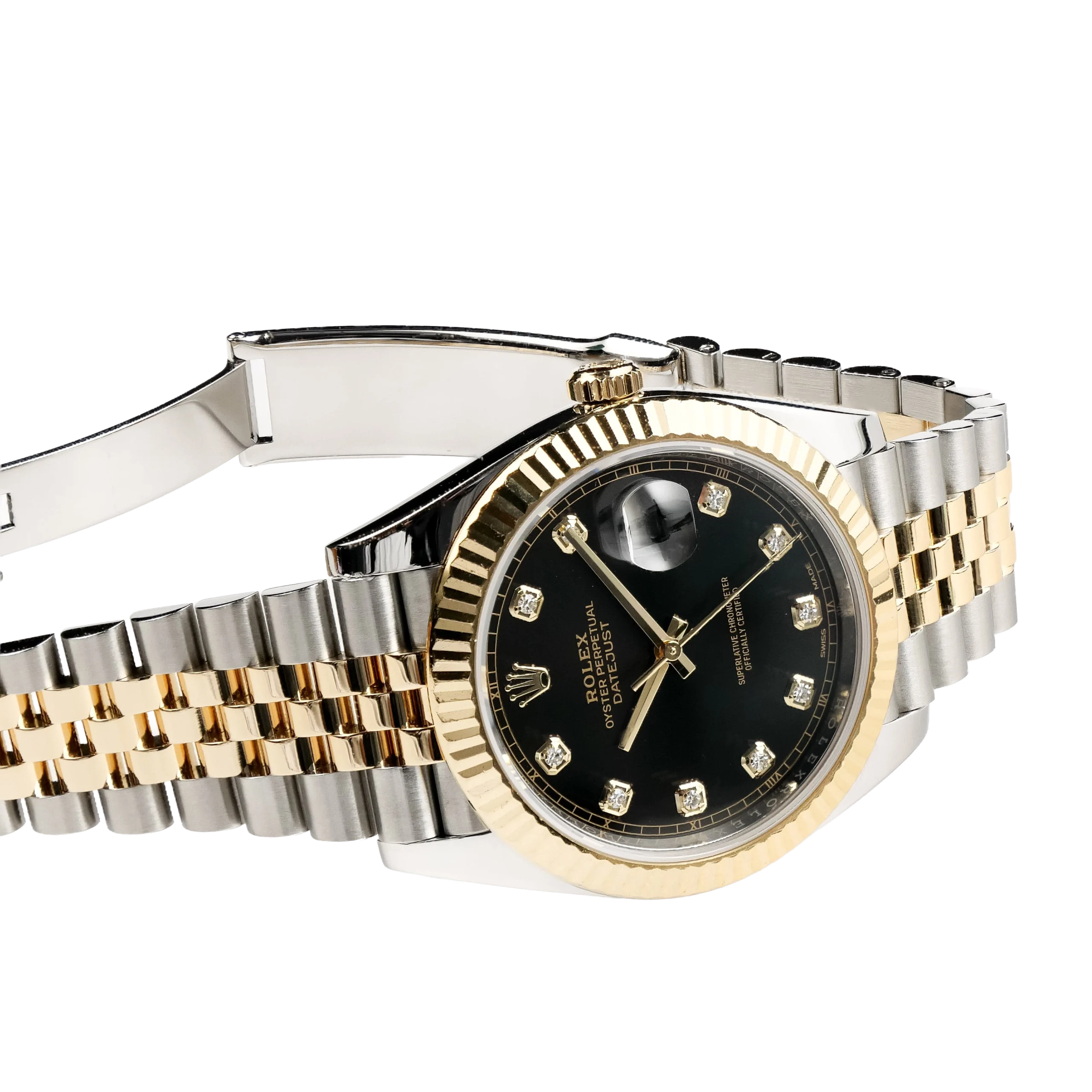 The Rolex Datejust 126333 in its 41 mm stainless steel case features a faceted yellow gold fluted bezel that frames a deep black dial set with brilliant-cut diamond hour markers. The Cyclops lens magnifies the date at 3 o’clock for practicality, while gold hands and accents maintain seamless visual symmetry. Affixed to the Jubilee bracelet—known for its blend of comfort and polish—this reference marries everyday reliability with elevated aesthetics.
