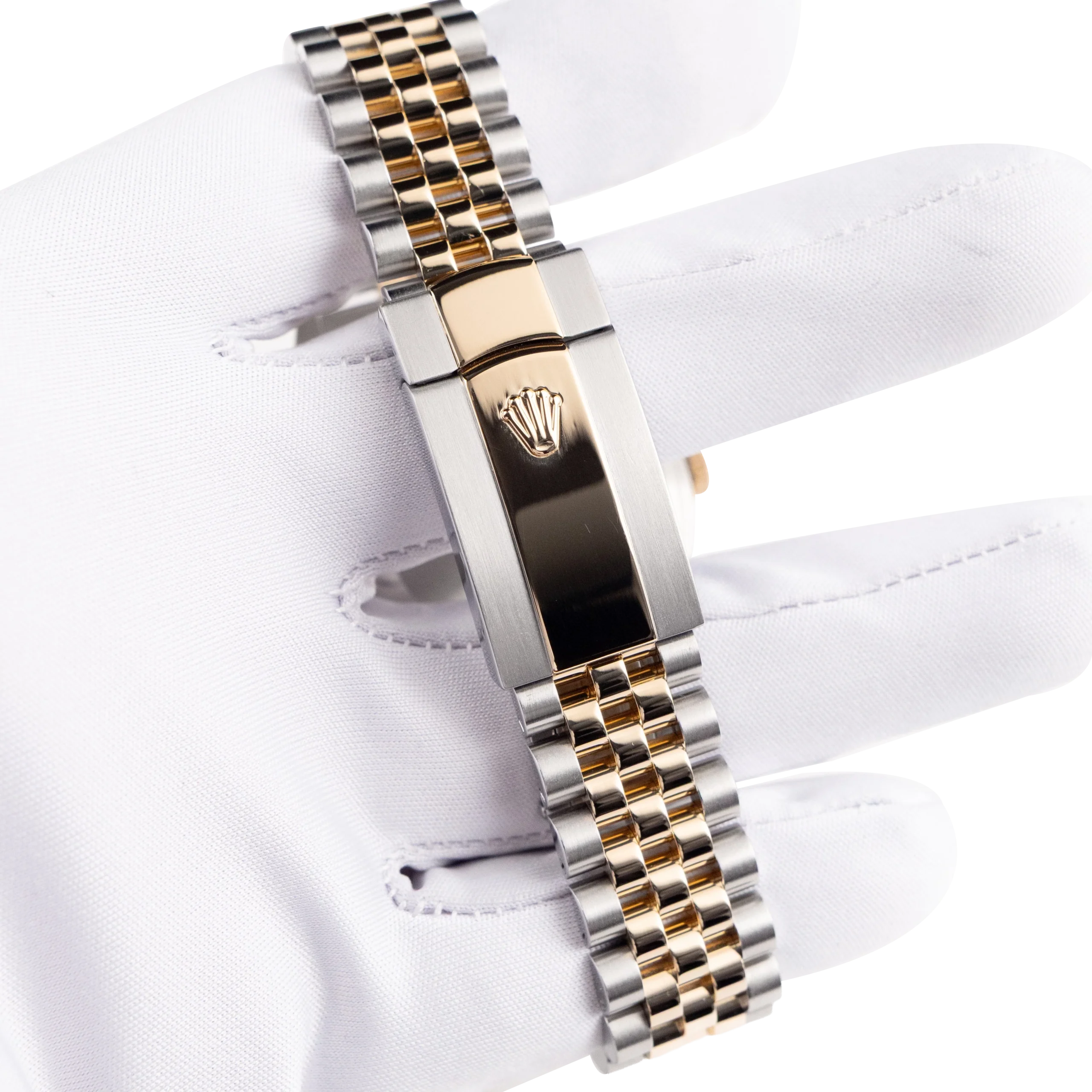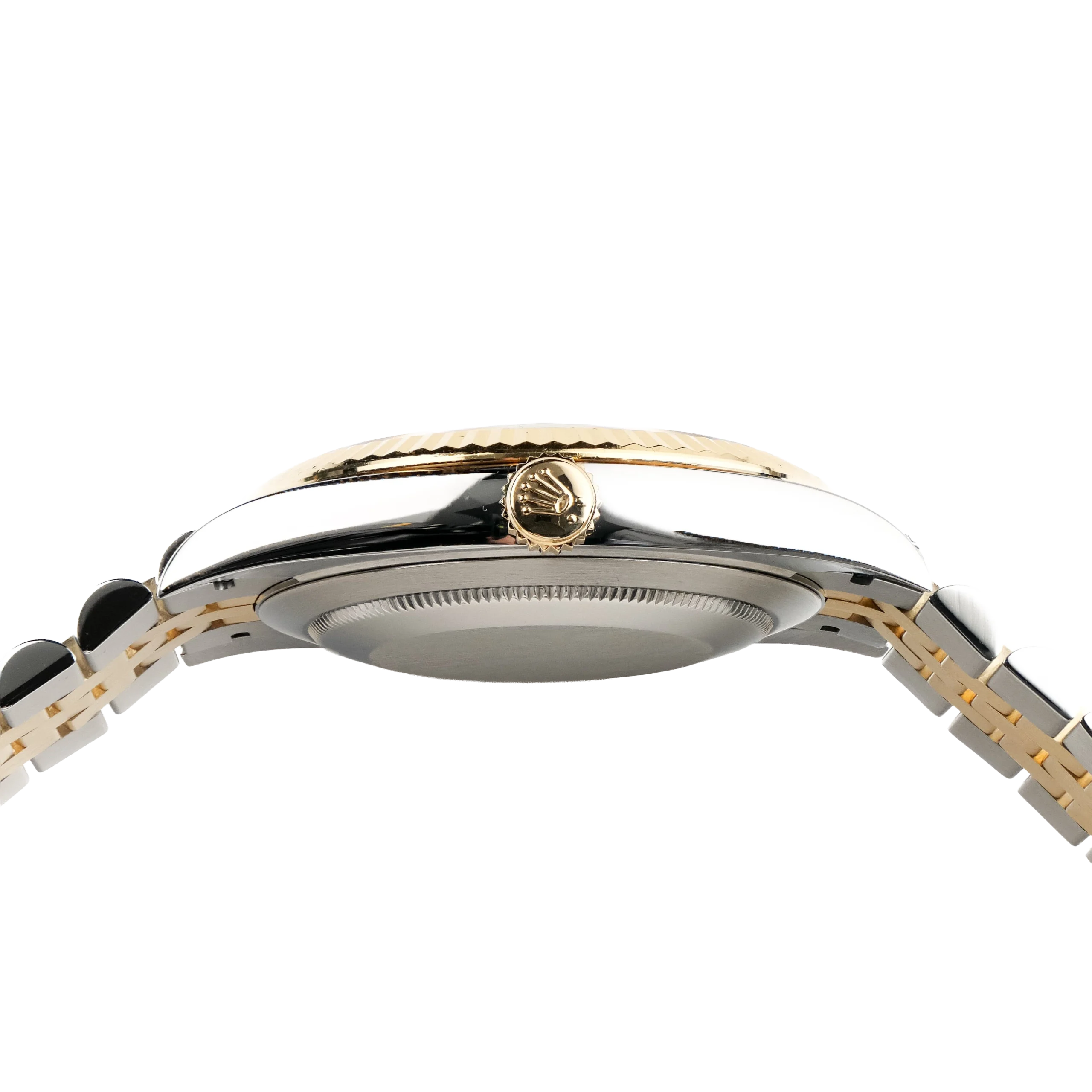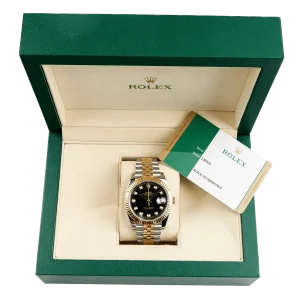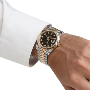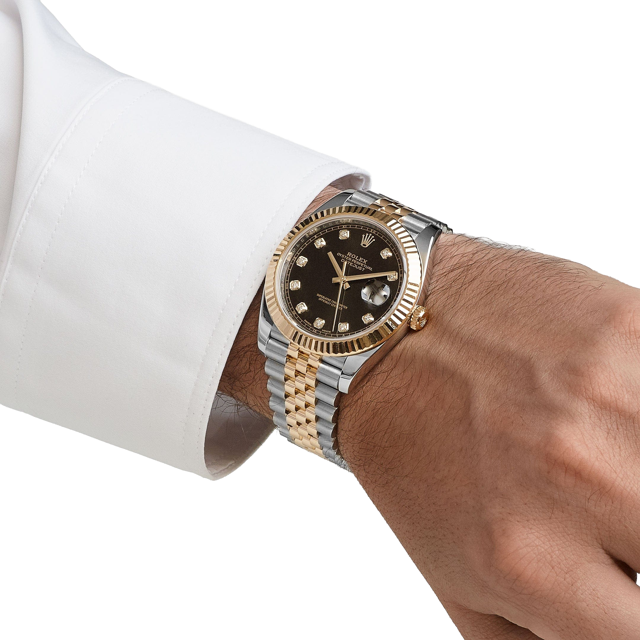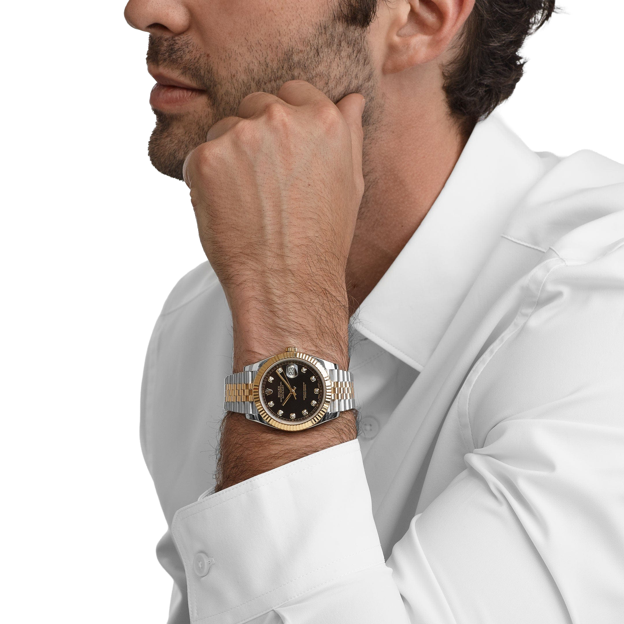 The Rolex Datejust 126333 in its 41 mm stainless steel case features a faceted yellow gold fluted bezel that frames a deep black dial set with brilliant-cut diamond hour markers. The Cyclops lens magnifies the date at 3 o’clock for practicality, while gold hands and accents maintain seamless visual symmetry. Affixed to the Jubilee bracelet—known for its blend of comfort and polish—this reference marries everyday reliability with elevated aesthetics.