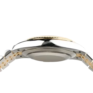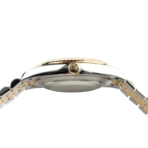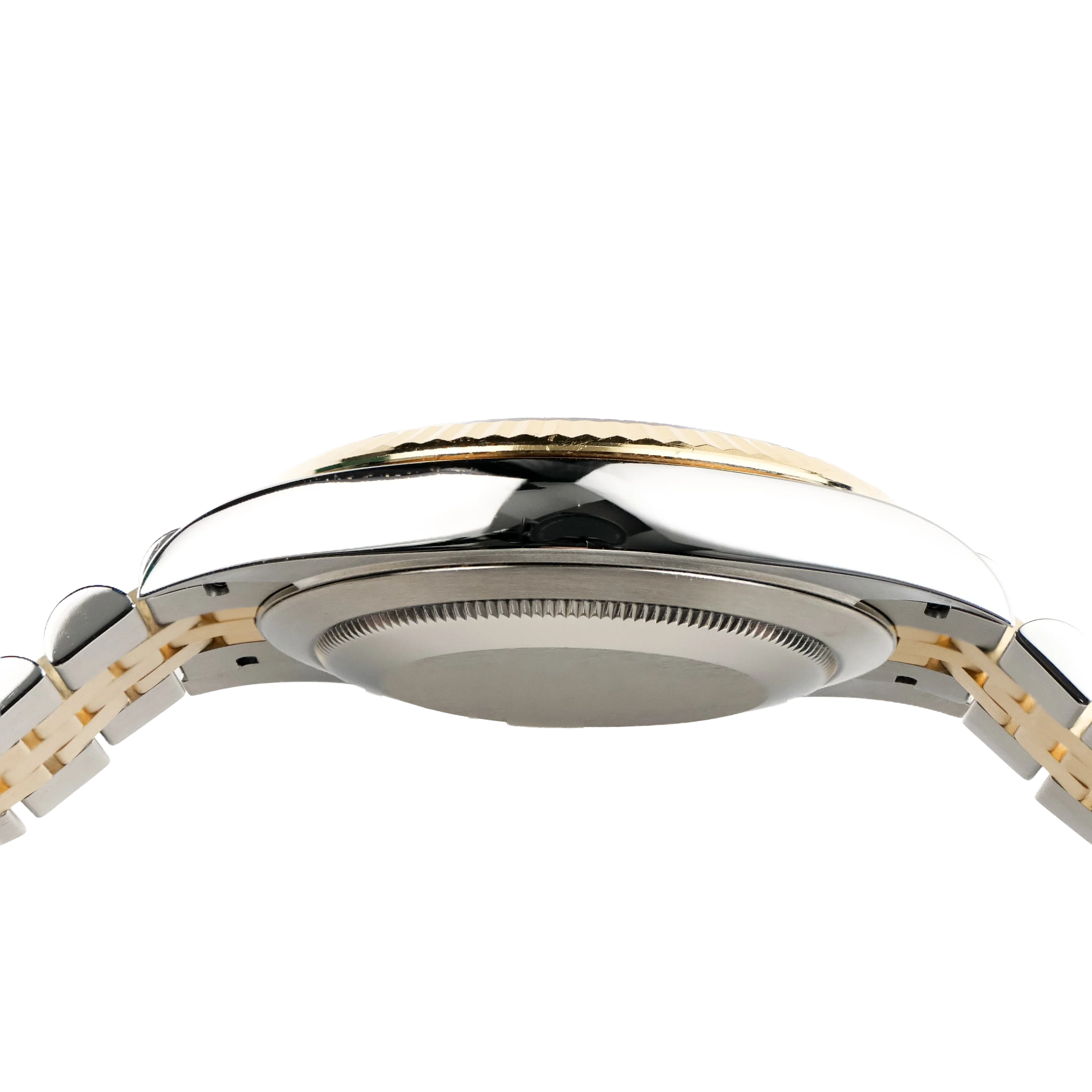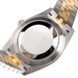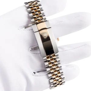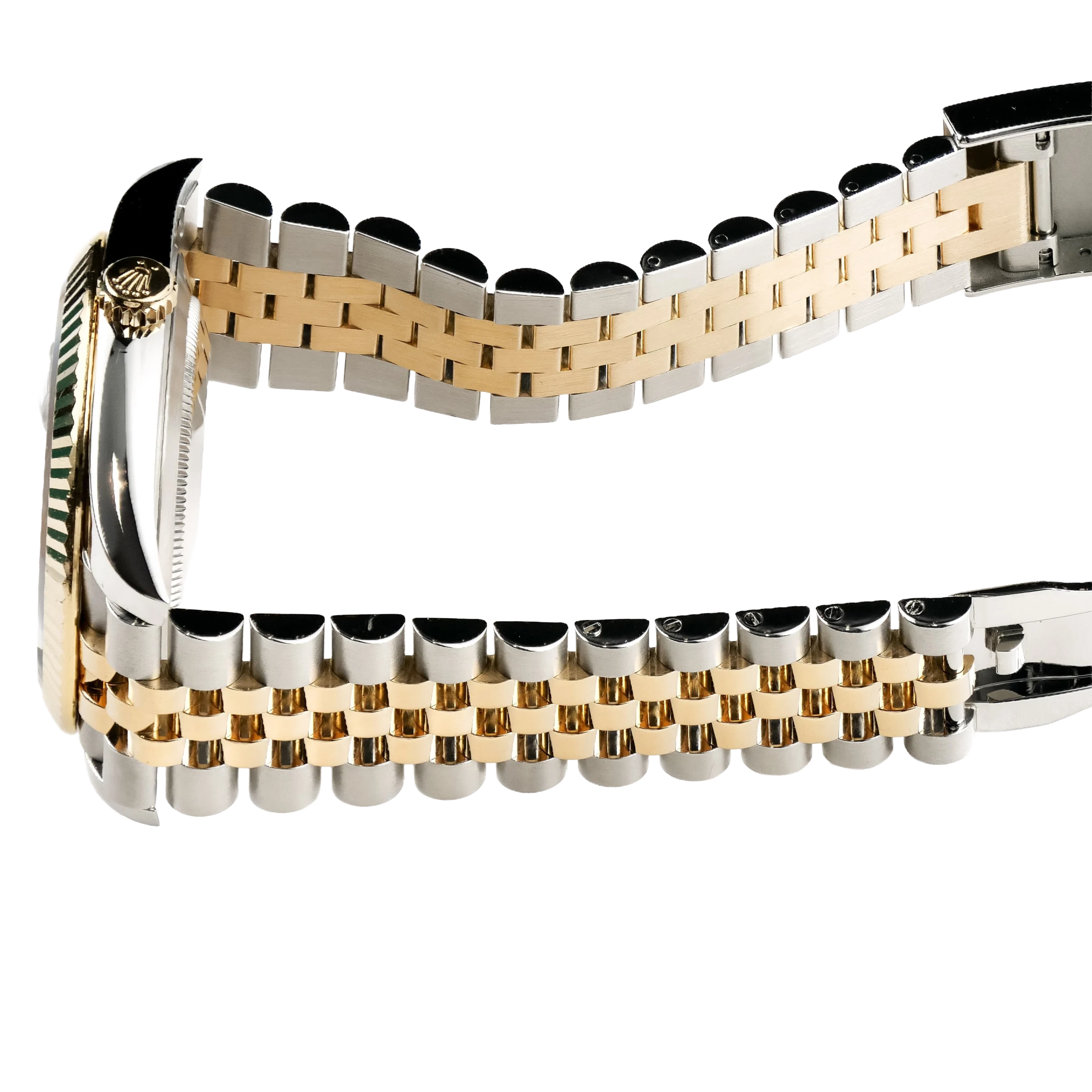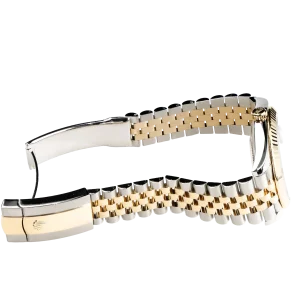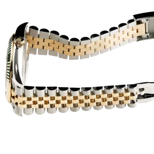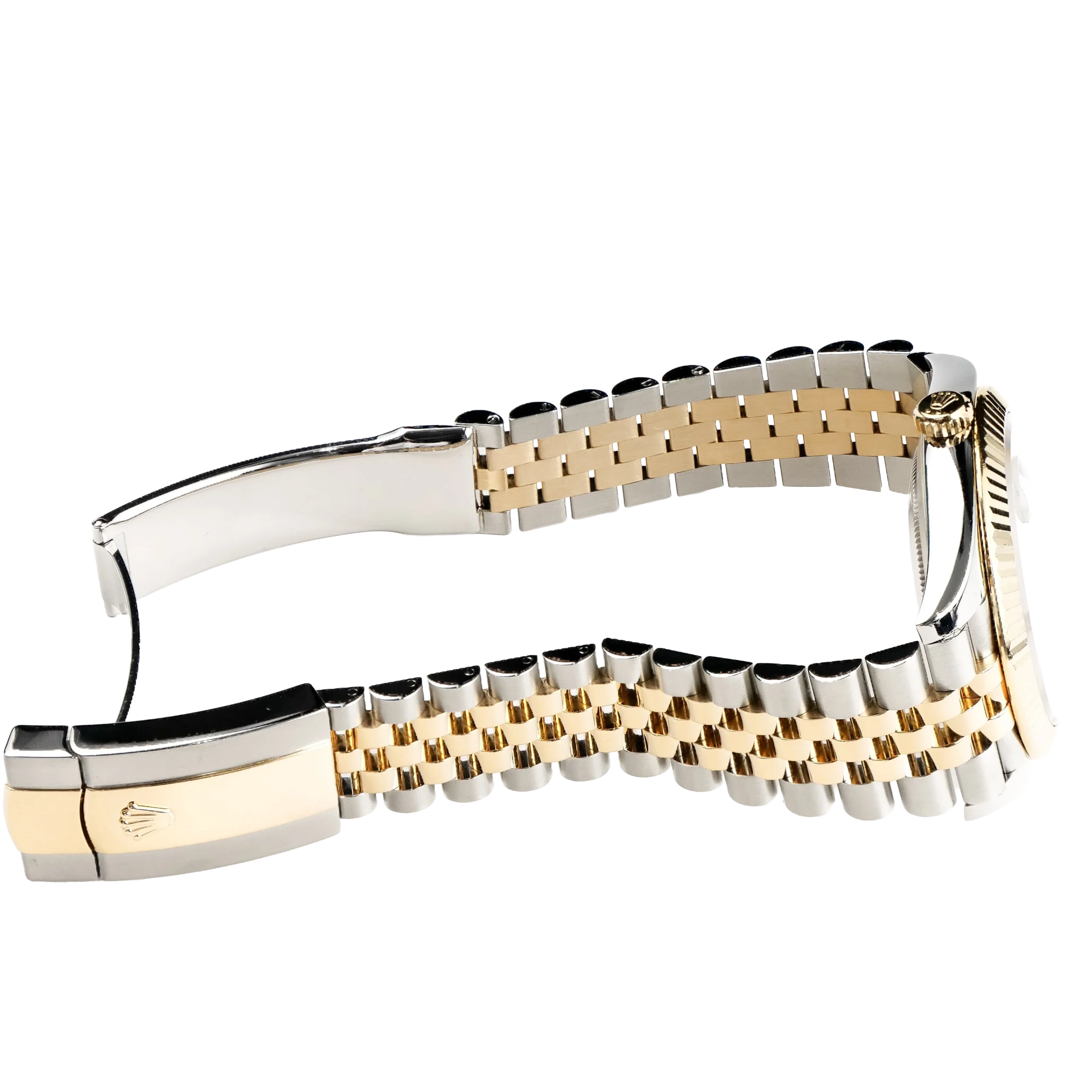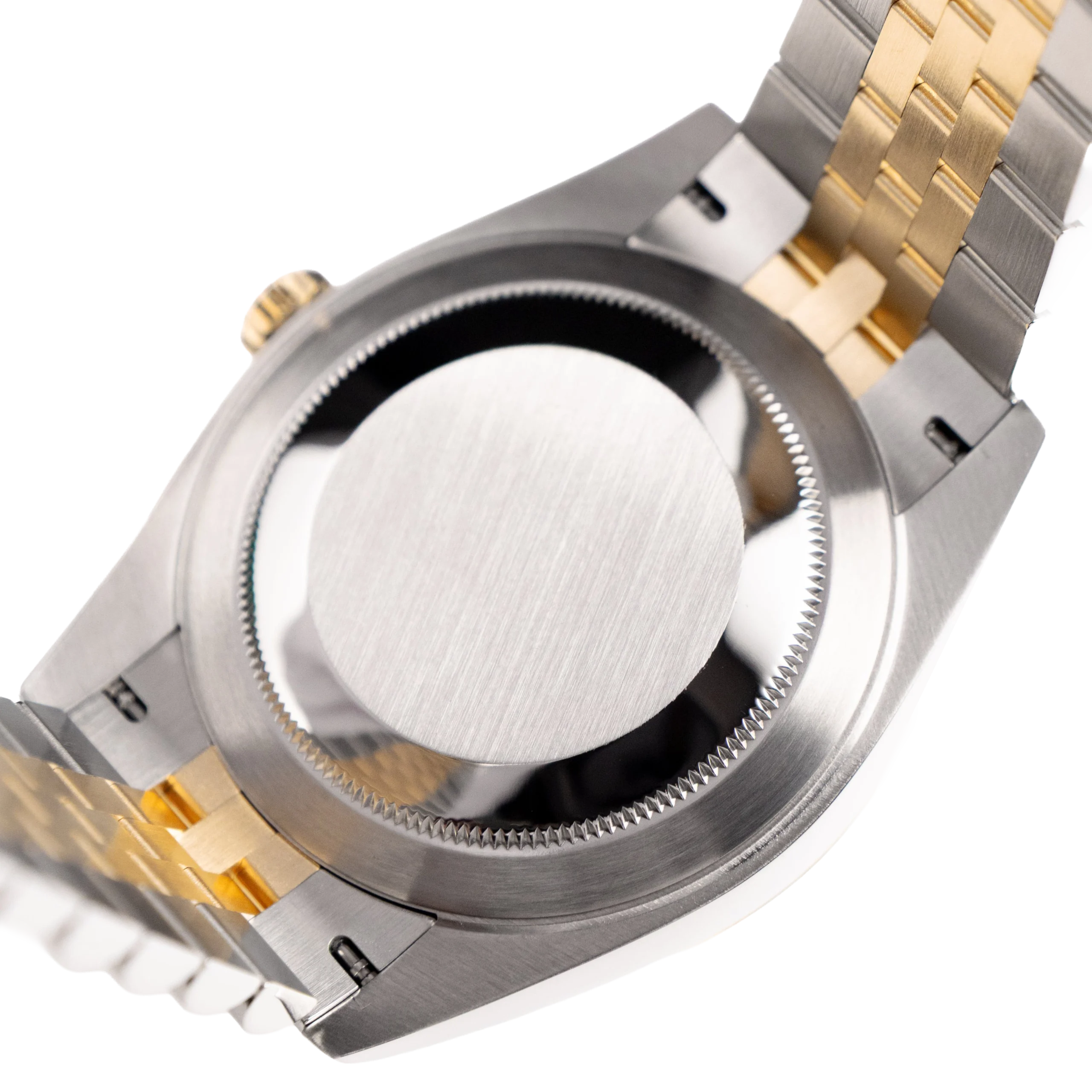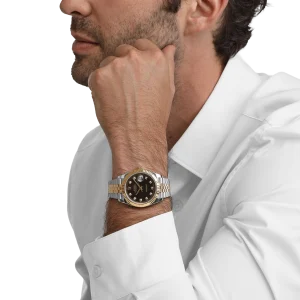 The Rolex Datejust 126333 in its 41 mm stainless steel case features a faceted yellow gold fluted bezel that frames a deep black dial set with brilliant-cut diamond hour markers. The Cyclops lens magnifies the date at 3 o’clock for practicality, while gold hands and accents maintain seamless visual symmetry. Affixed to the Jubilee bracelet—known for its blend of comfort and polish—this reference marries everyday reliability with elevated aesthetics.