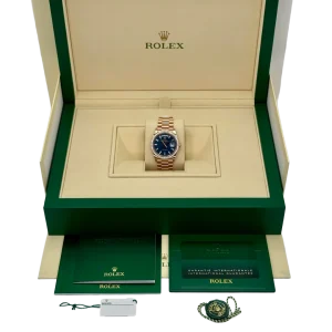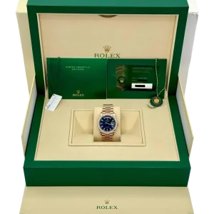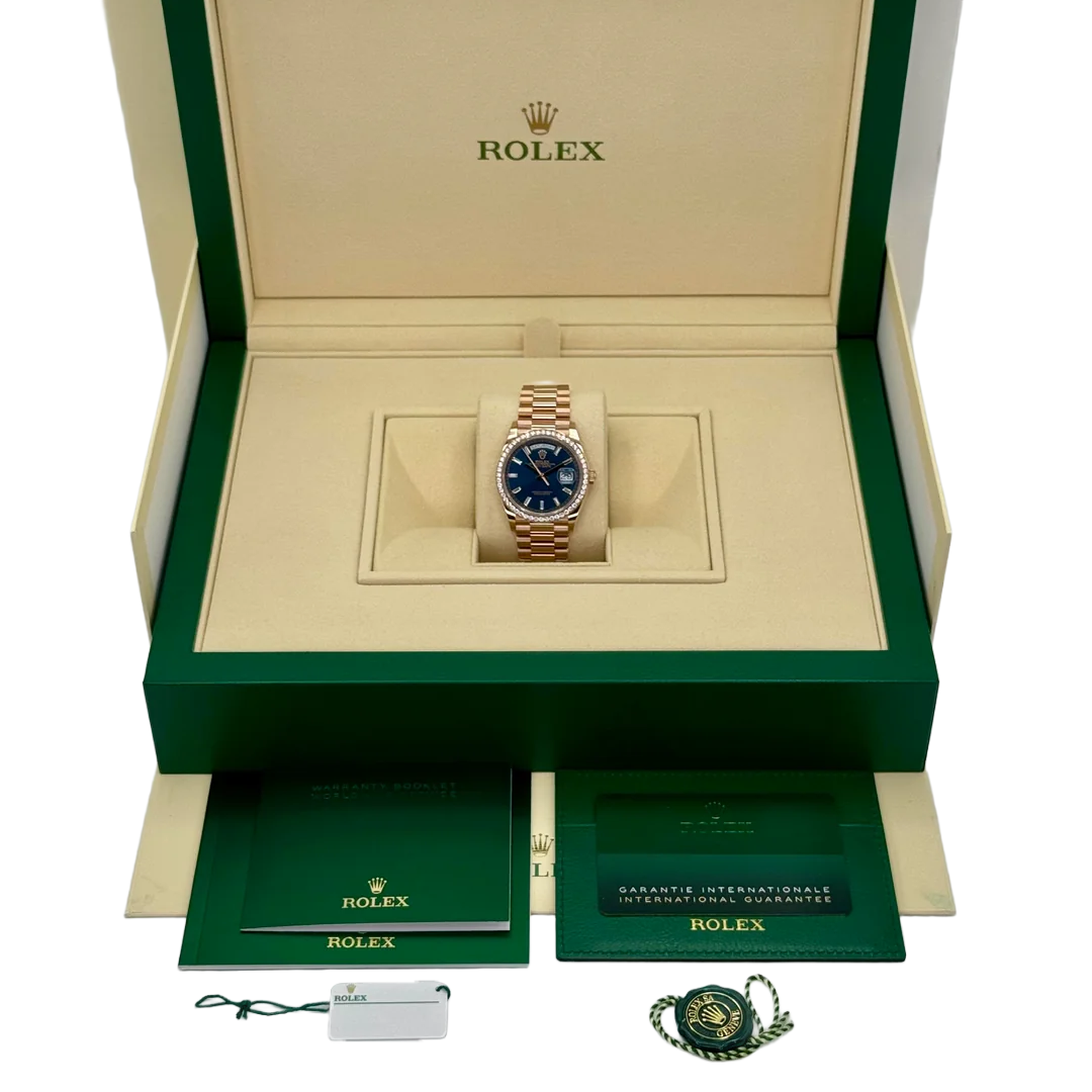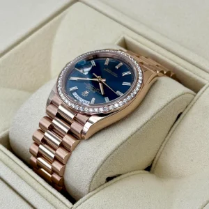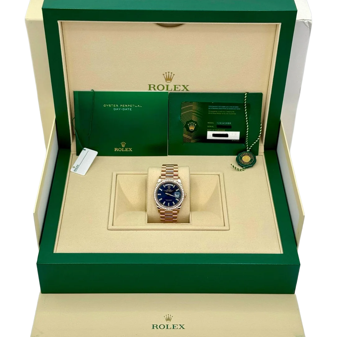 Equipped with the iconic day and date windows at 12 and 3 o’clock and fitted with Rolex’s renowned President bracelet, the 128345RBR combines elegance with comfort. This Day-Date 36 is perfect for collectors seeking a watch that balances traditional Rolex design with a luxurious, modern edge.