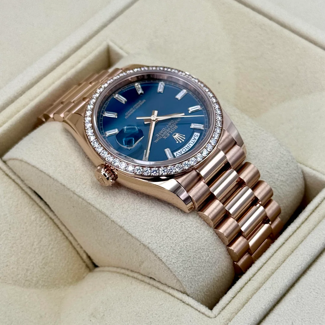The Rolex Day-Date 36 reference 128345RBR is a luxurious take on a classic, crafted from Rolex’s proprietary 18k Everose gold for a warm, enduring finish. This model features a sophisticated sundust dial that pairs elegantly with the Everose gold case, while diamond hour markers add a touch of brilliance. Framing the dial is a diamond-set bezel, bringing a level of refinement and radiance to the timepiece.