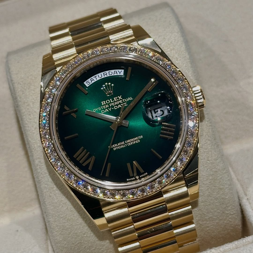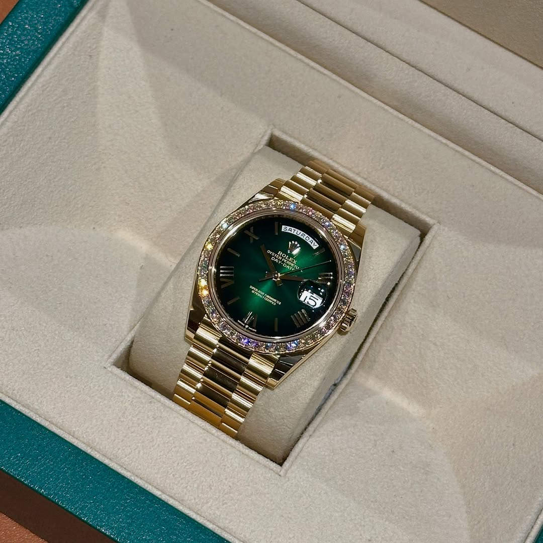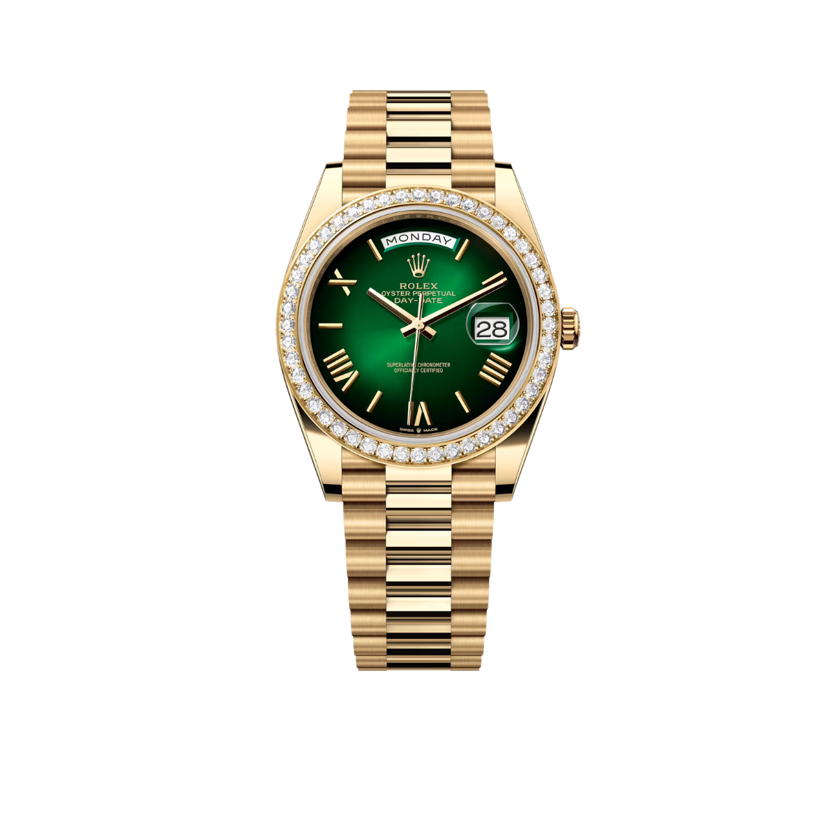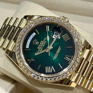 Rolex Day Date 40 mm | 18k yellow gold President bracelet | Green ombré dial Diamond bezel | Men’s Watch 228398TBR Reference Number 228398TBR Case Size 40mm Face Color Green ombré Hour Markers Index Case Material 18k yellow gold Movement Perpetual, mechanical, self-winding Bracelet Material 18k yellow gold Clasp Type Concealed folding Crownclasp Glass Scratch-resistant sapphire, Cyclops lens over the date Model Day Date Water Resistance Rating 100 m (10 ATM) Box/Papers Original Rolex Box and Papers Warranty Rolex Warranty card Country/Region of Manufacture Switzerland Display Analog