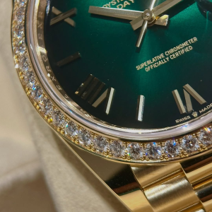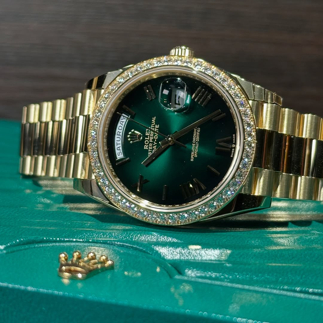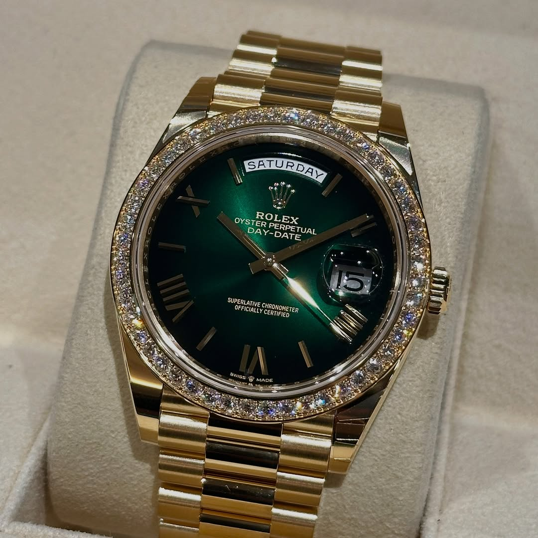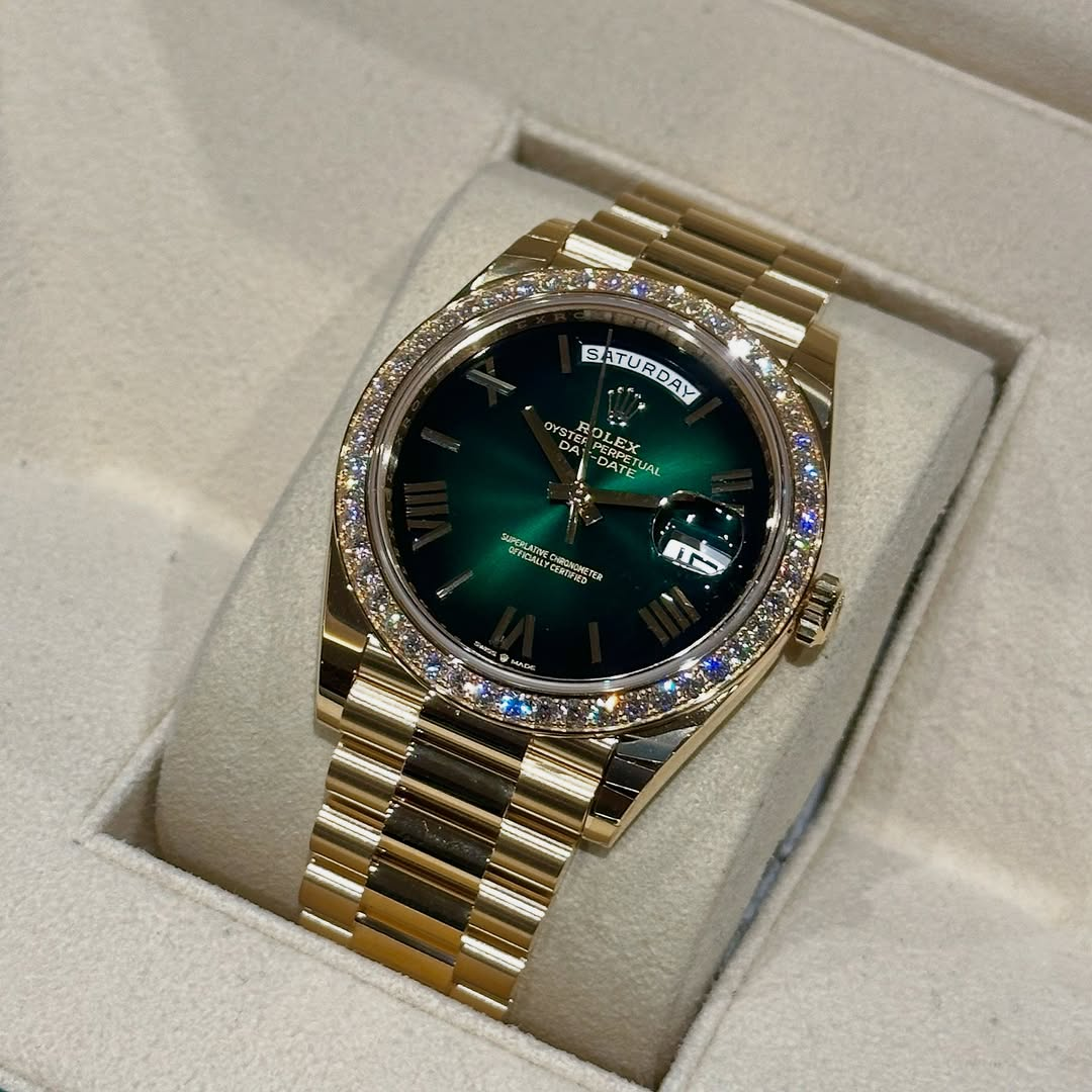 Rolex Day Date 40 mm | 18k yellow gold President bracelet | Green ombré dial Diamond bezel | Men’s Watch 228398TBR Reference Number 228398TBR Case Size 40mm Face Color Green ombré Hour Markers Index Case Material 18k yellow gold Movement Perpetual, mechanical, self-winding Bracelet Material 18k yellow gold Clasp Type Concealed folding Crownclasp Glass Scratch-resistant sapphire, Cyclops lens over the date Model Day Date Water Resistance Rating 100 m (10 ATM) Box/Papers Original Rolex Box and Papers Warranty Rolex Warranty card Country/Region of Manufacture Switzerland Display Analog