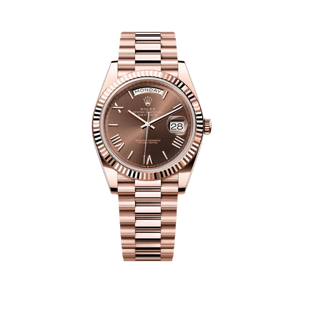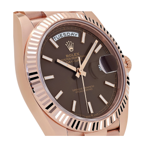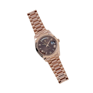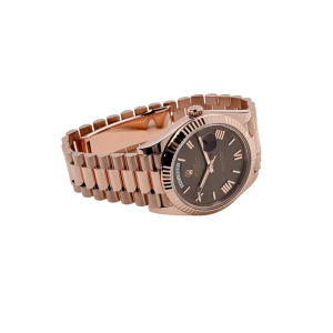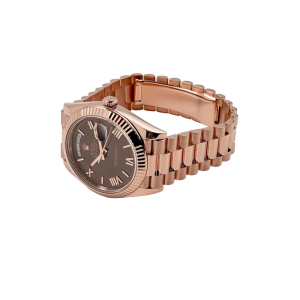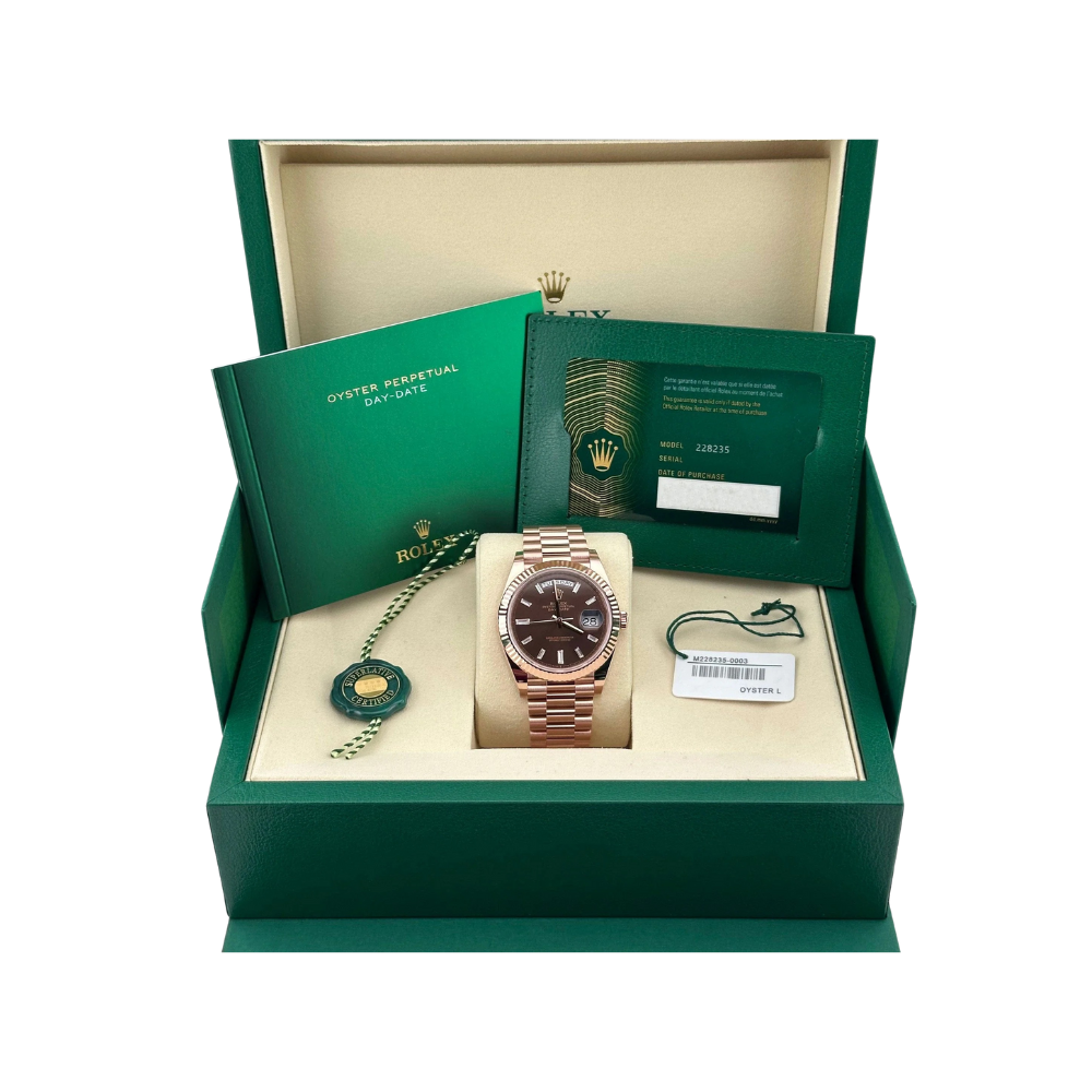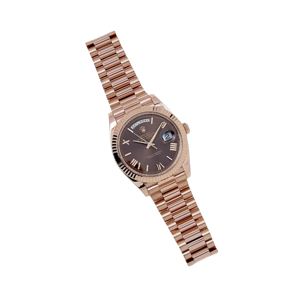 The Rolex Day-Date 228235 is a timeless masterpiece, crafted in 18k rose gold for a warm and sophisticated presence. Its 40mm case is complemented by a signature fluted bezel, adding a classic touch to the design. The rich chocolate brown dial serves as the focal point, featuring bold Roman numeral hour markers in matching rose gold, offering an elegant contrast and refined aesthetic.