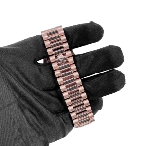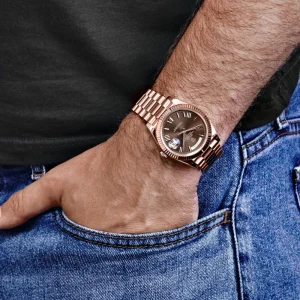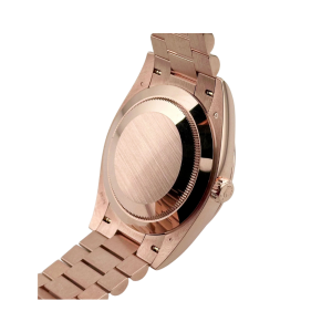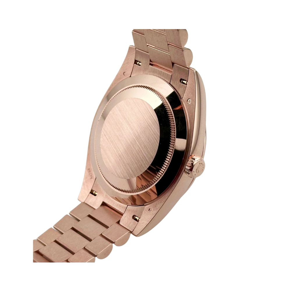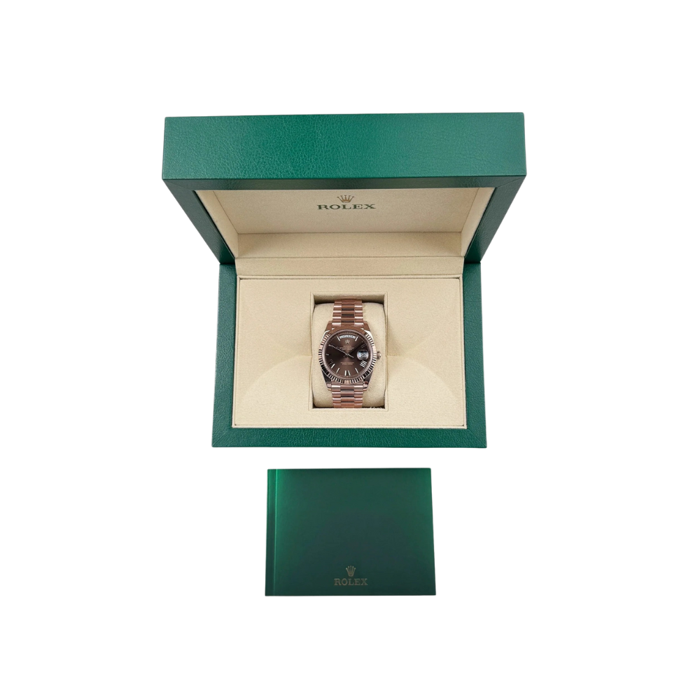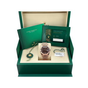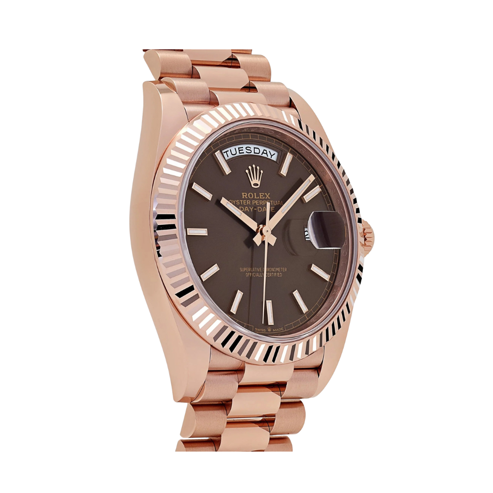 The Rolex Day-Date 228235 is a timeless masterpiece, crafted in 18k rose gold for a warm and sophisticated presence. Its 40mm case is complemented by a signature fluted bezel, adding a classic touch to the design. The rich chocolate brown dial serves as the focal point, featuring bold Roman numeral hour markers in matching rose gold, offering an elegant contrast and refined aesthetic.