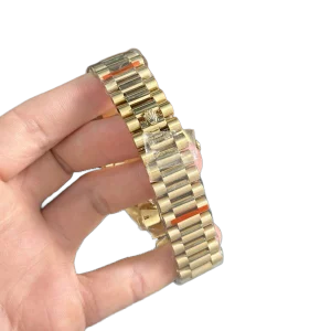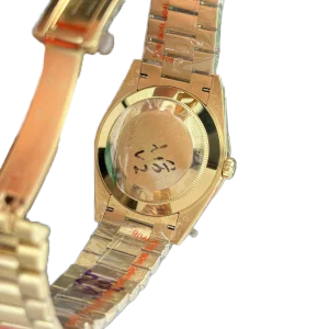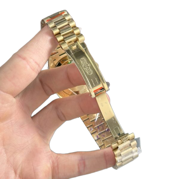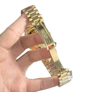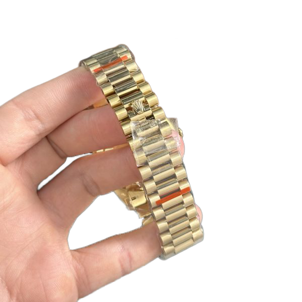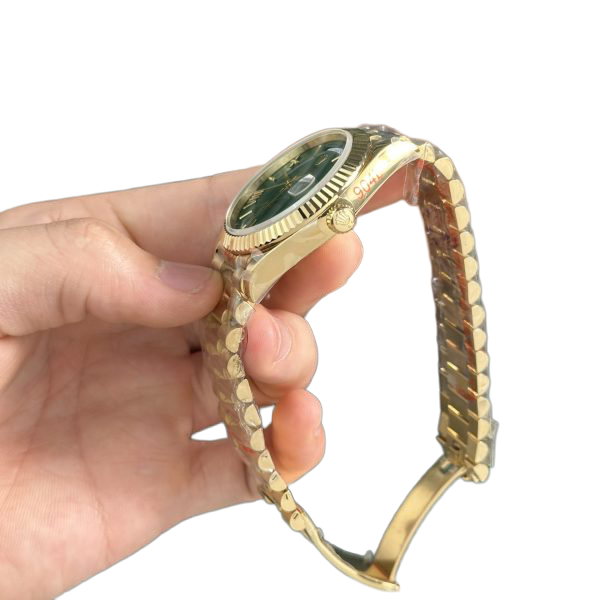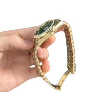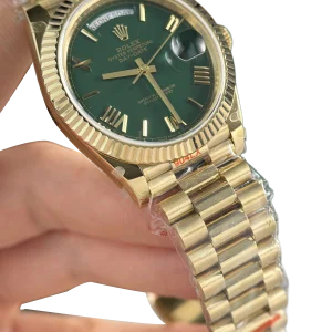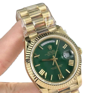 The Rolex Day-Date Green Roman Dial in Yellow Gold (reference 228238) is a stunning blend of classic elegance and bold design. This 40mm timepiece commands attention with its vibrant green dial, featuring bold Roman numeral hour markers that add a timeless touch. The signature fluted bezel and President bracelet enhance its luxurious aesthetic. Powered by the Rolex caliber 3255, this watch delivers precise timekeeping and robust performance. With the day display at 12 o’clock and date at 3 o’clock, it offers both practicality and refined style. This Day-Date 40 in yellow gold is a statement of prestige and sophistication, perfect for those who appreciate fine craftsmanship.
