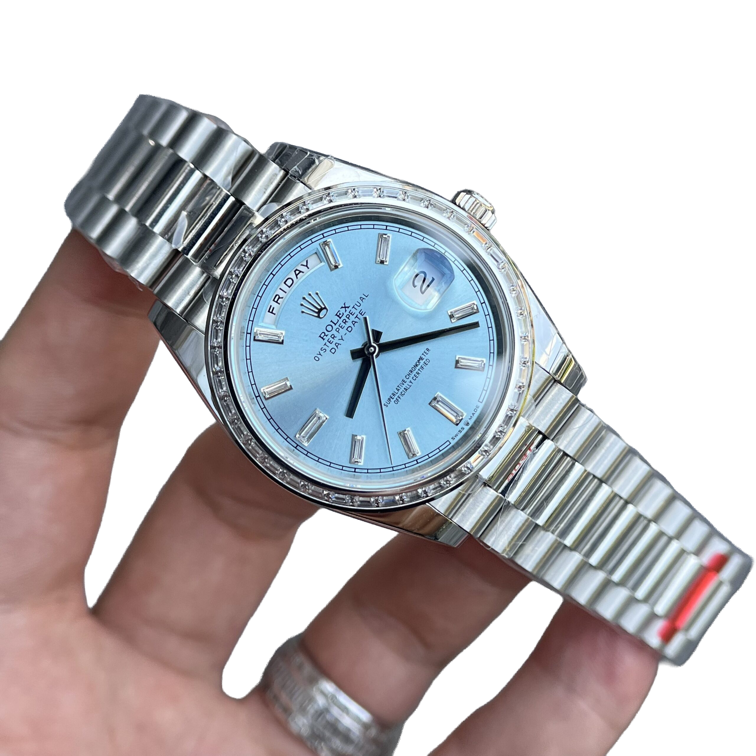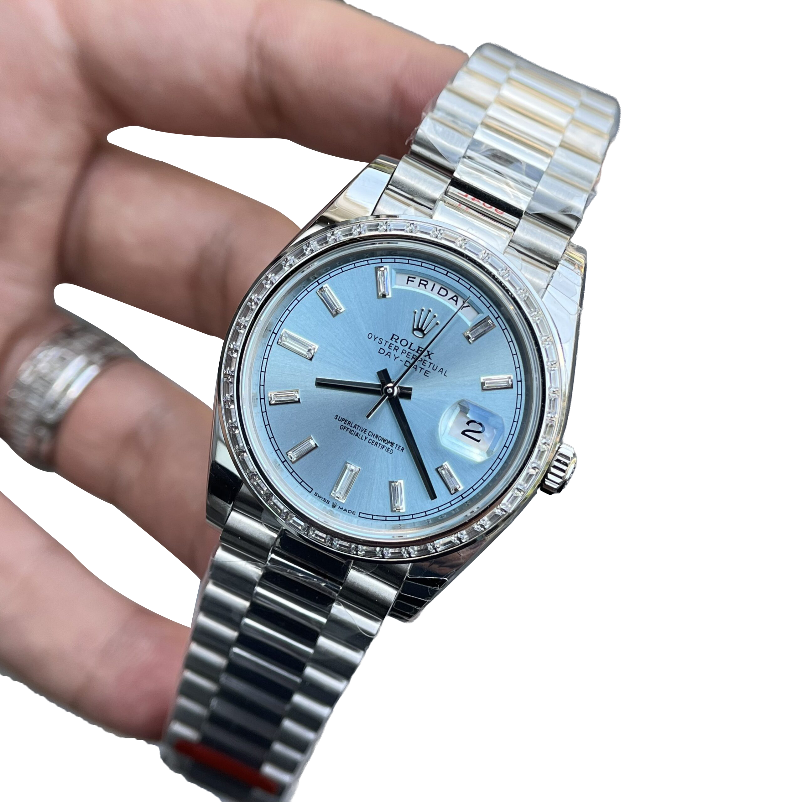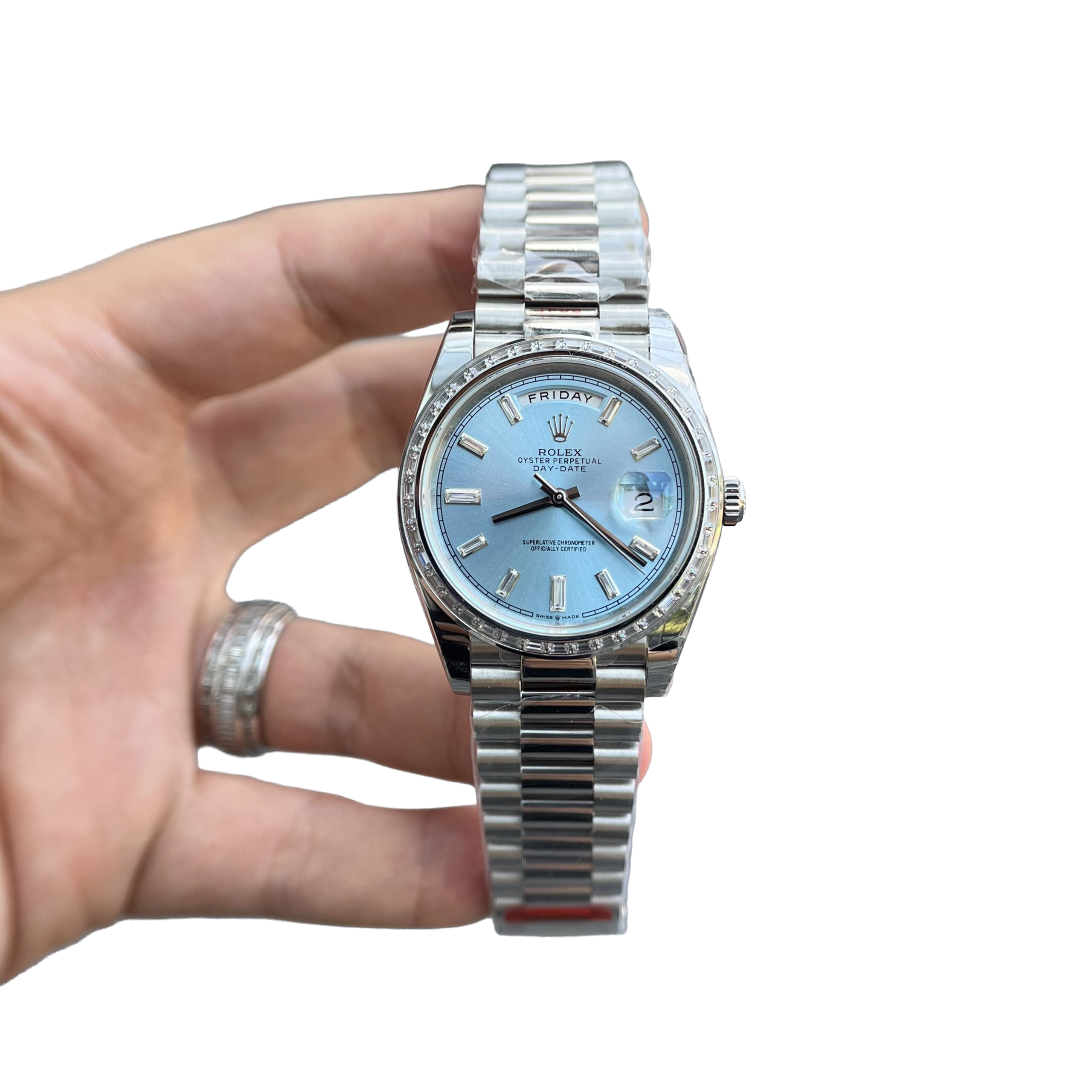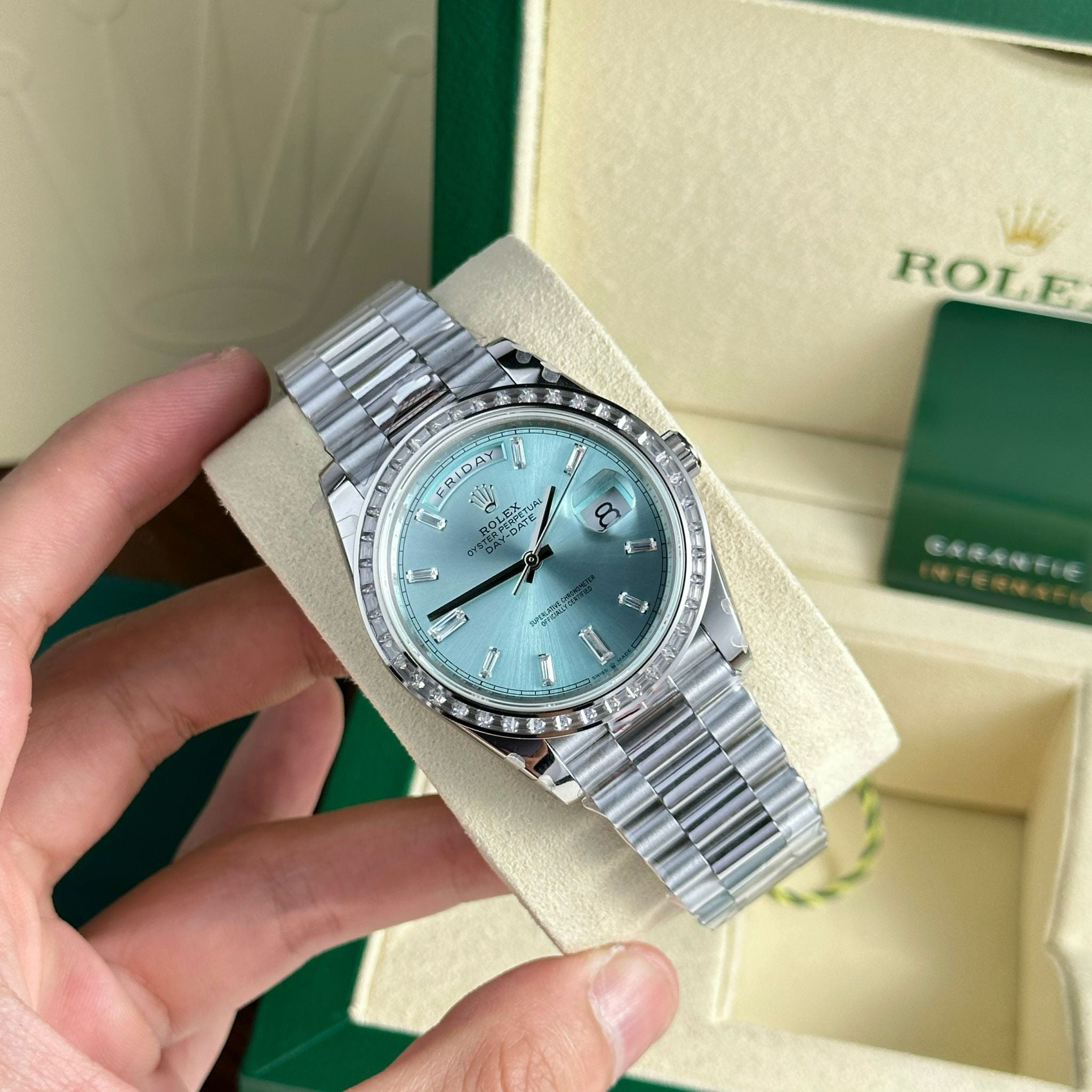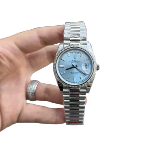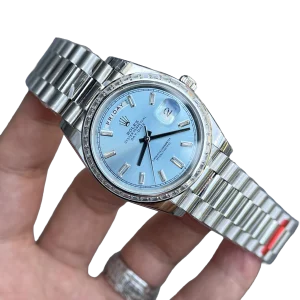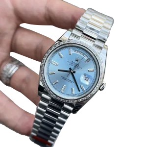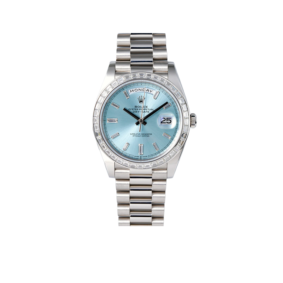 The Rolex Day-Date 40 228396TBR is the pinnacle of elegance and prestige. Its 40mm case crafted from 950 platinum pairs with Rolex’s signature ice-blue dial—an exclusive hue reserved for its most noble metal creations. The watch is strikingly elevated by a baguette-cut diamond bezel and matching diamond hour markers, adding refined brilliance. Fitted with the iconic President bracelet, this Day-Date is powered by the in-house caliber 3255, offering a 70-hour power reserve, instant day and date display, and Superlative Chronometer precision. A timeless embodiment of luxury, rarity, and horological excellence.