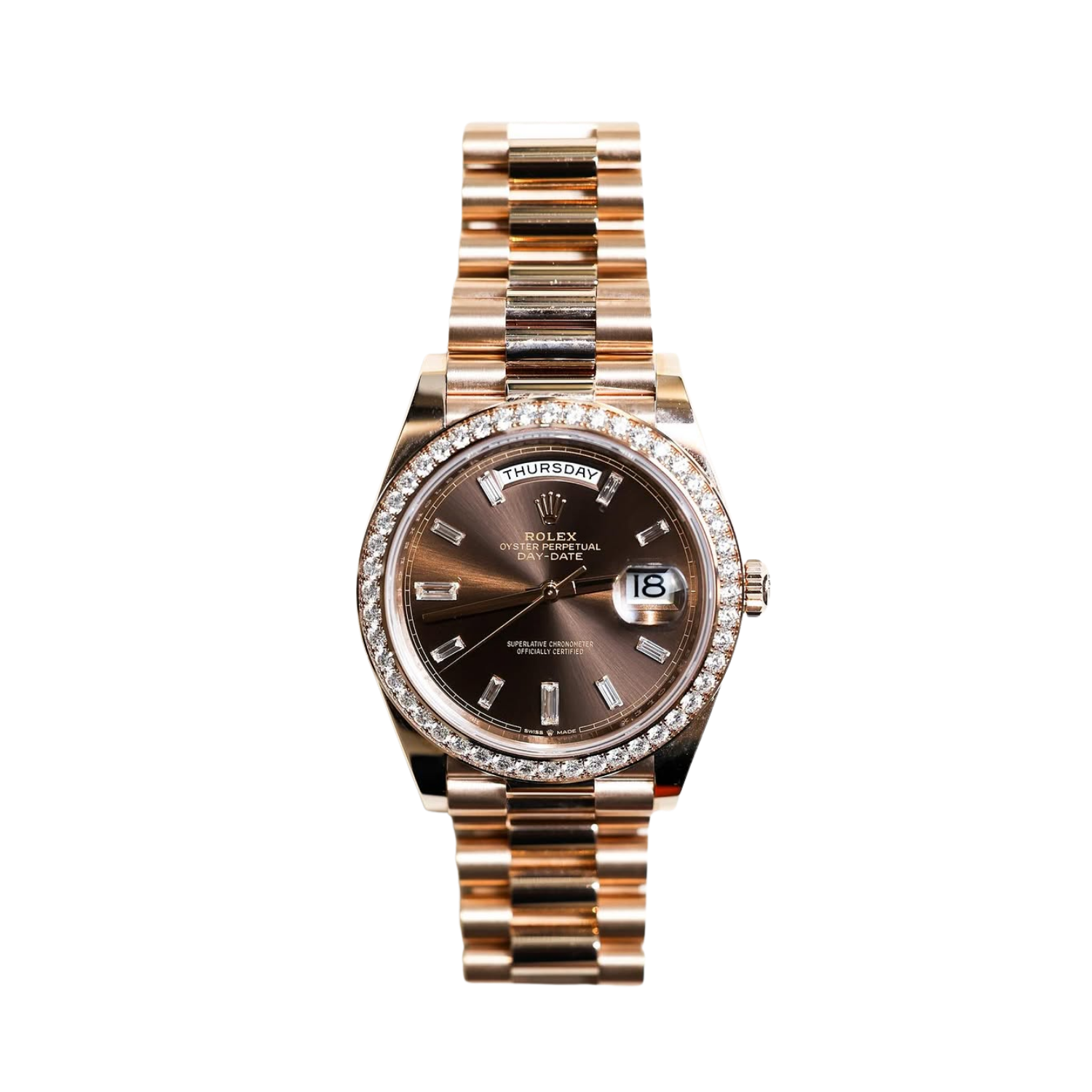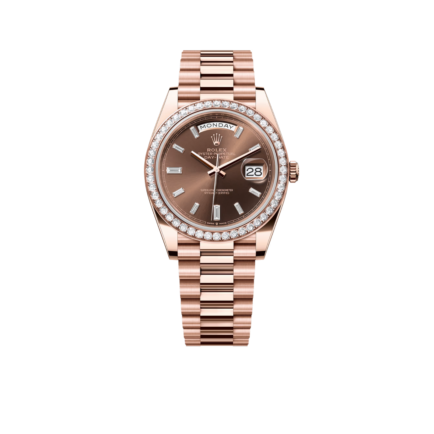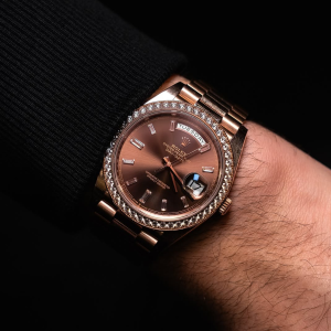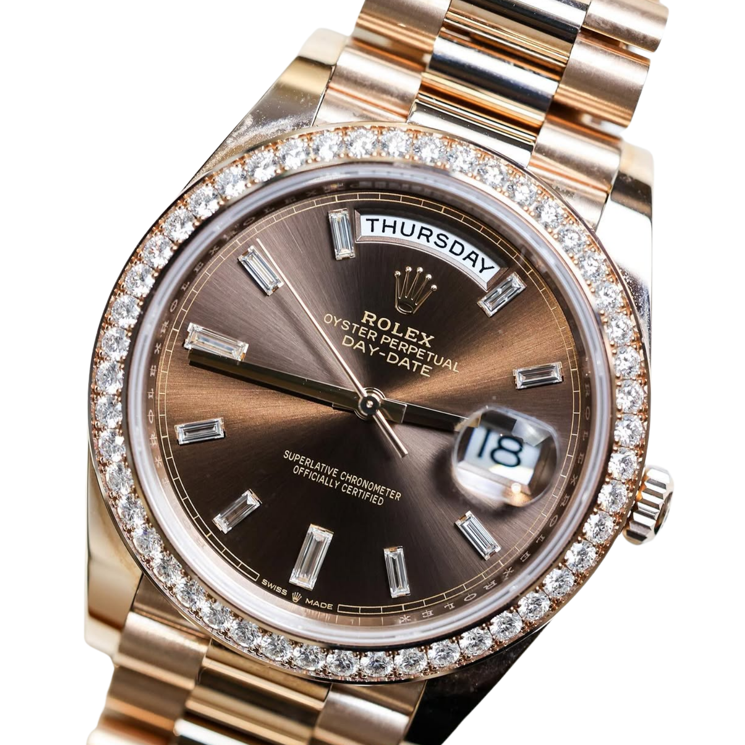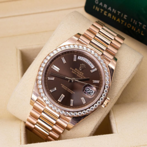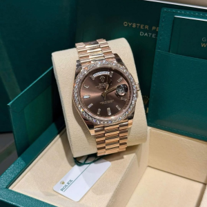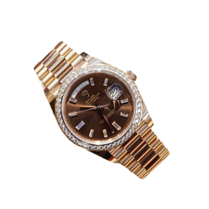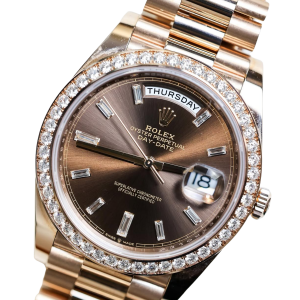 The rich chocolate dial enhances the watch’s elegant character, complemented by baguette-style diamond hour markers that create depth and sophistication. Signature Day-Date elements include the weekday display at 12 o’clock and the date window at 3 o’clock, preserving the model’s instantly recognizable identity.