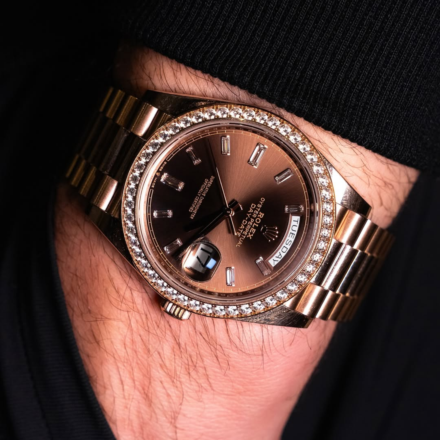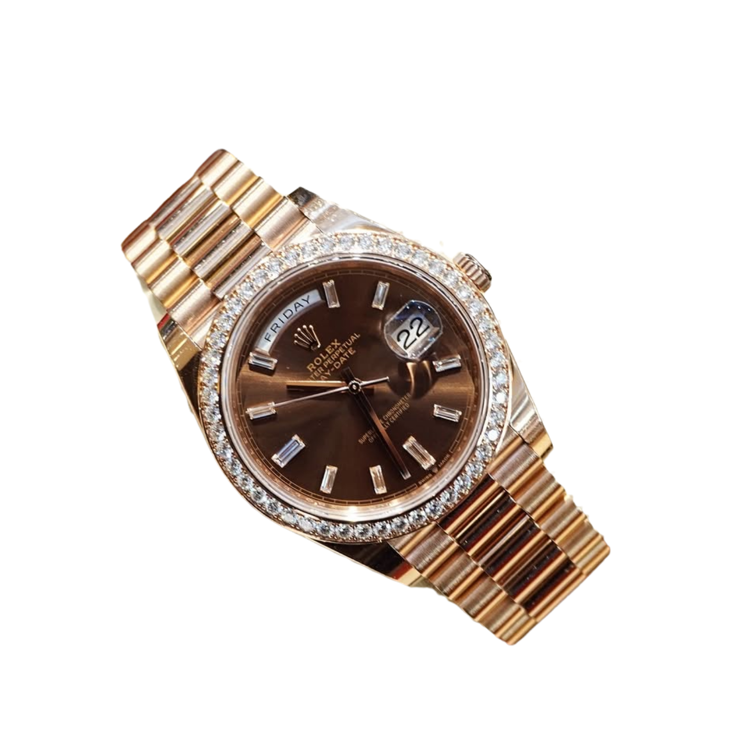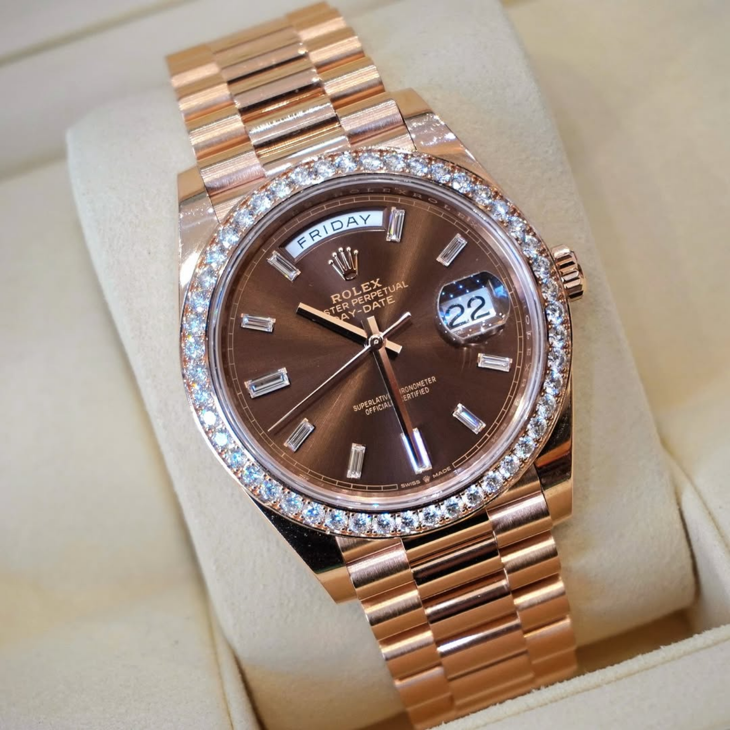 The rich chocolate dial enhances the watch’s elegant character, complemented by baguette-style diamond hour markers that create depth and sophistication. Signature Day-Date elements include the weekday display at 12 o’clock and the date window at 3 o’clock, preserving the model’s instantly recognizable identity.