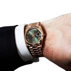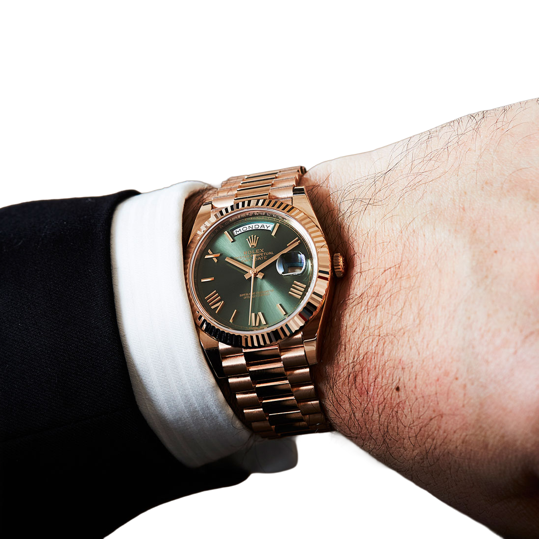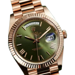 Rolex Day-Date 40 Ref. 228235 Green Olive is crafted entirely from 18k Everose gold, Rolex’s exclusive rose gold alloy known for its enduring color and luxury appeal.