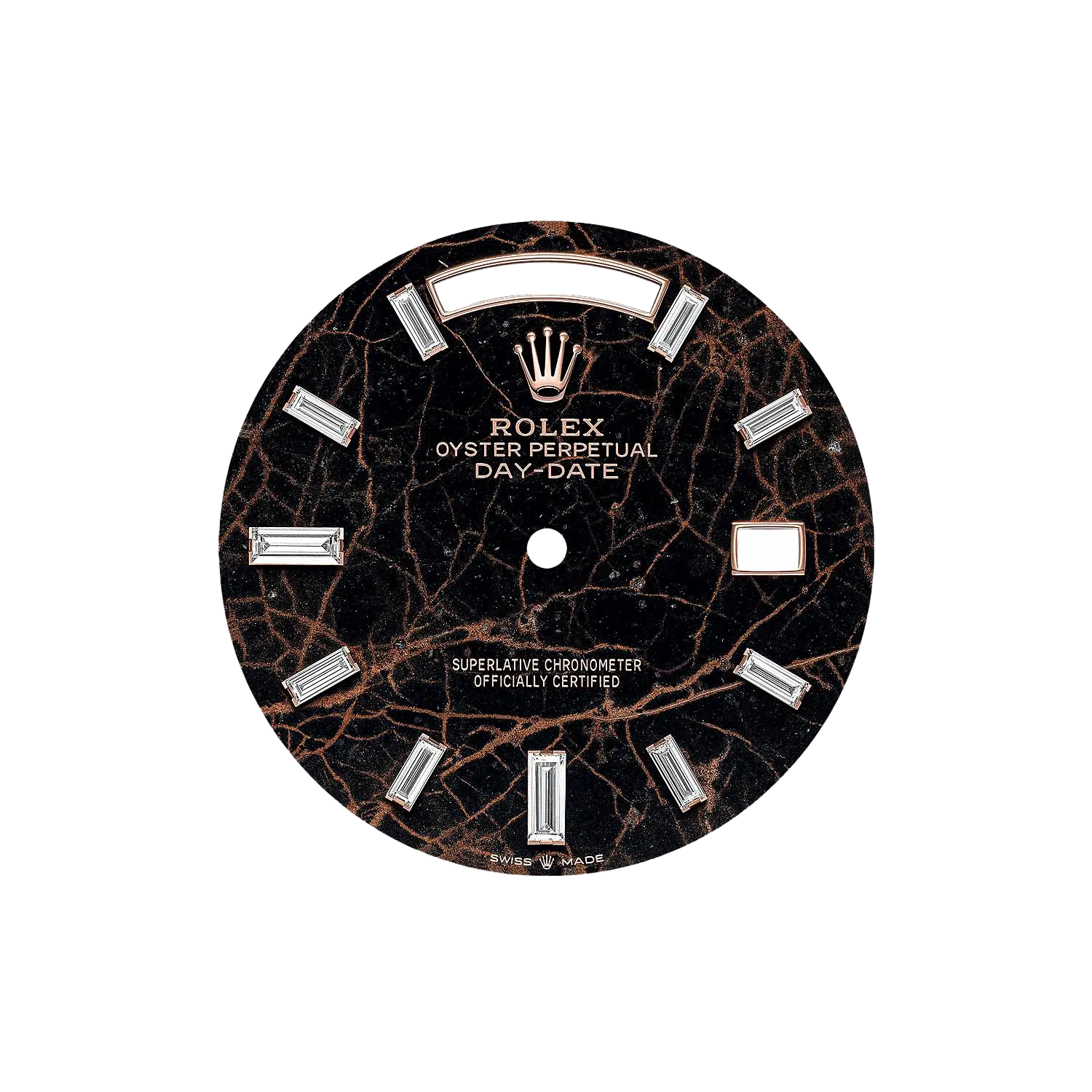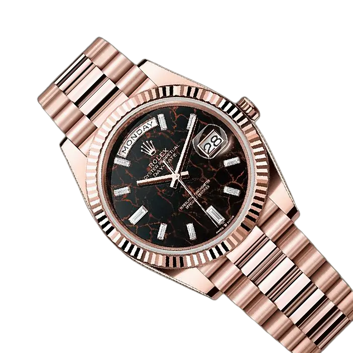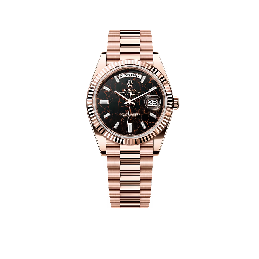 A masterpiece of elegance and precision, this 40 mm watch is crafted in 18 kt Everose Gold, radiating warmth and refined sophistication. The Eisenkiesel dial, set with ten baguette-cut diamonds, reflects understated luxury, while the Caliber 3255 movement delivers exceptional performance with a 70-hour power reserve. Finished with a President bracelet and concealed Crownclasp, it is a timeless statement of prestige—perfect for every moment, from boardroom to ballroom.