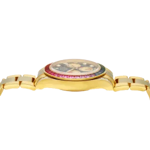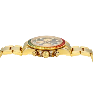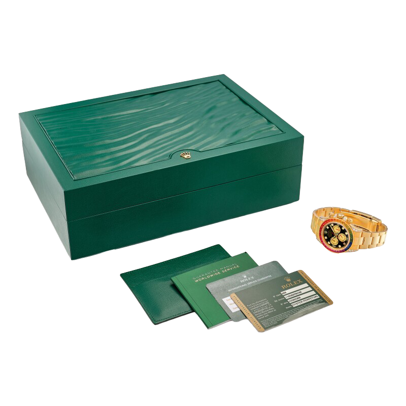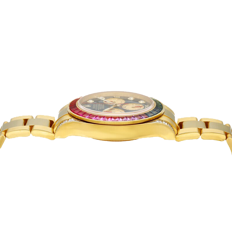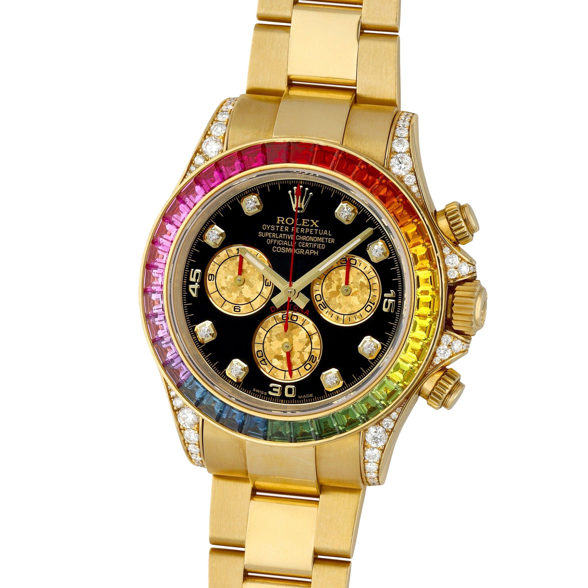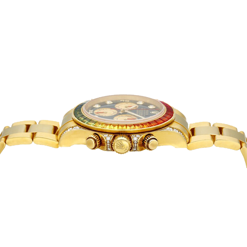 The Rolex Daytona 116598RBOW, known as the “Rainbow Daytona,” is an extraordinary expression of luxury and artistry, crafted in 18k yellow gold. Its 40mm case is adorned with a breathtaking sapphire-set bezel featuring a gradient of rainbow hues, meticulously arranged to create a vibrant and seamless spectrum. The lugs and crown guards are further embellished with factory-set diamonds, adding to its dazzling appeal.