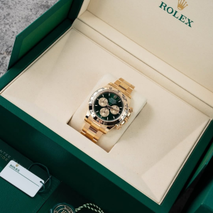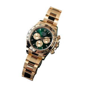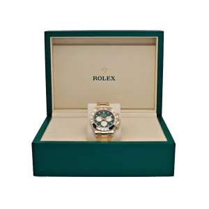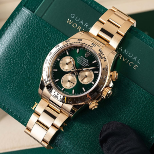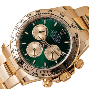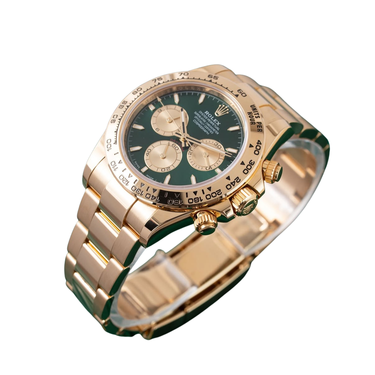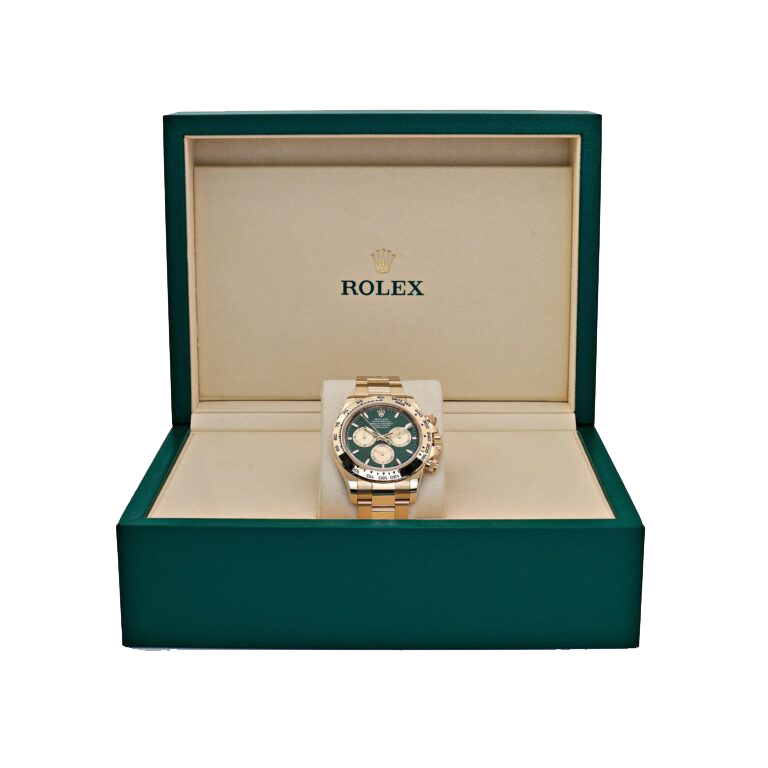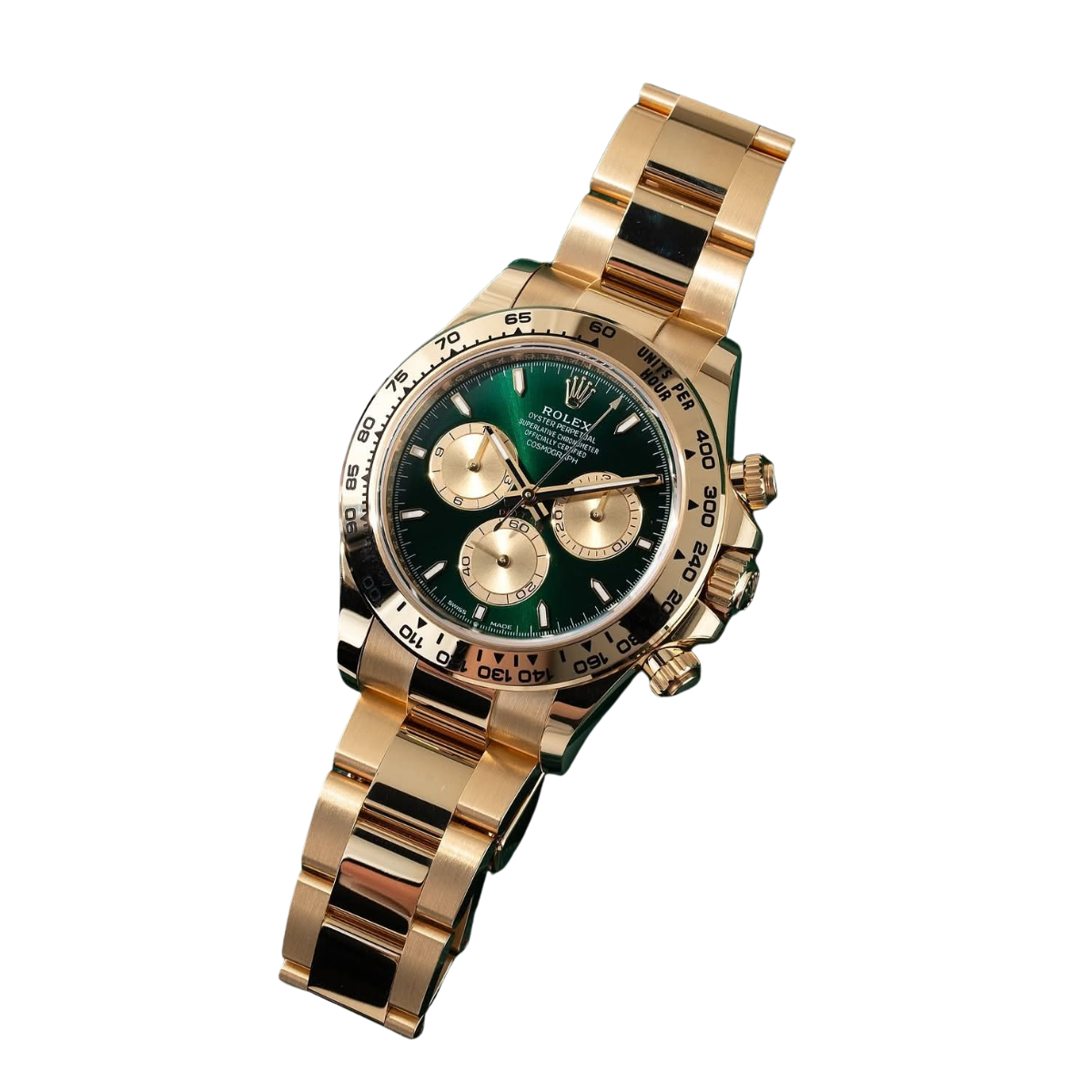 Paired with an Oyster bracelet in matching yellow gold and equipped with the Easylink comfort extension, the watch blends sporting functionality with elegant luxury. Revered by collectors and enthusiasts alike, the Daytona 126508 Green Dial remains a modern classic—now made even more compelling with Rolex’s latest technical advancements.