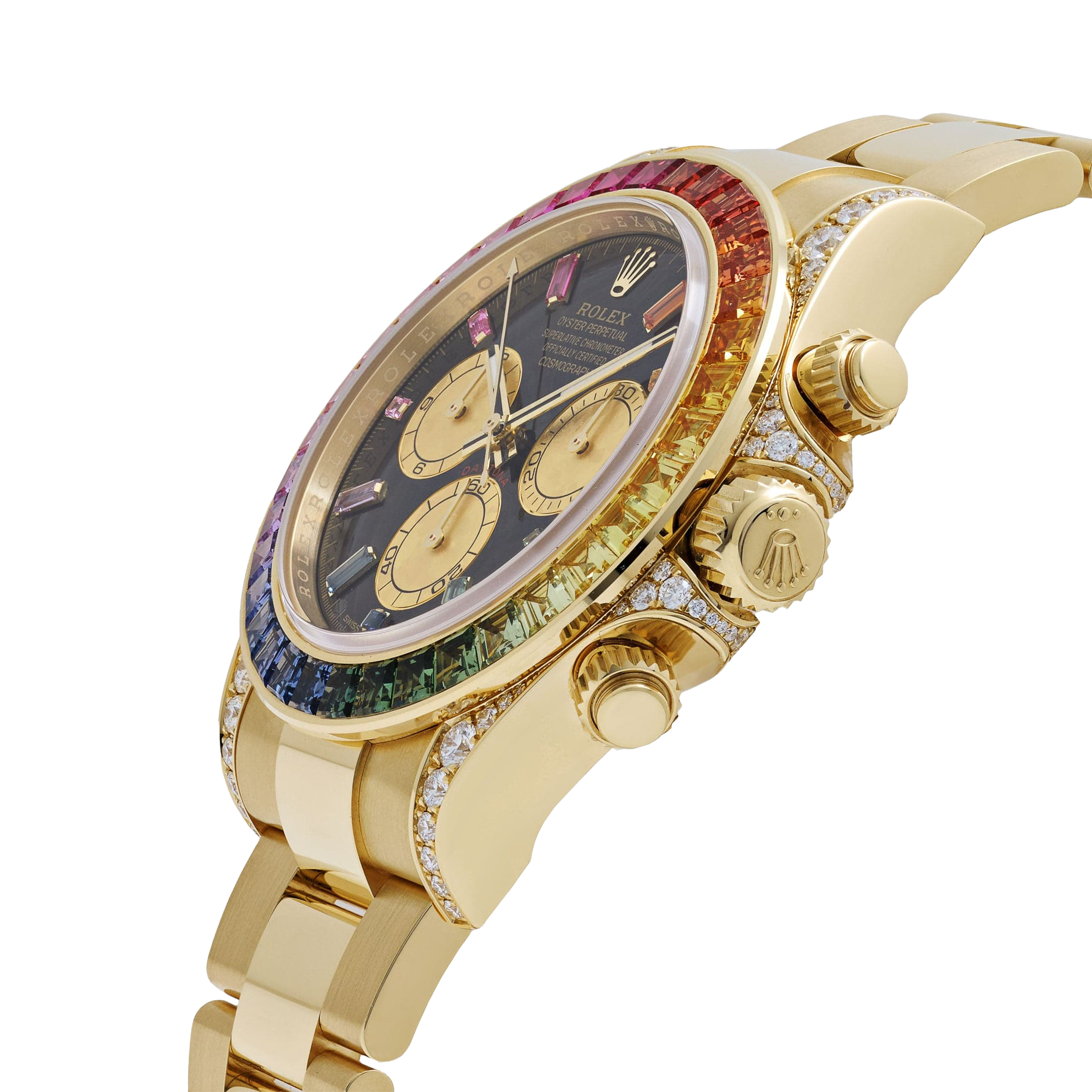 The Rolex Daytona 126598RBOW ‘Rainbow’ returns in 2025 with its most opulent execution yet. Crafted in yellow gold, this model is defined by its iconic rainbow sapphire bezel, which transitions seamlessly across a gradient of colors. The black lacquer dial is punctuated by sapphire hour markers in matching hues, while the lugs and crown guards are fully diamond-set, adding even more brilliance to the case.