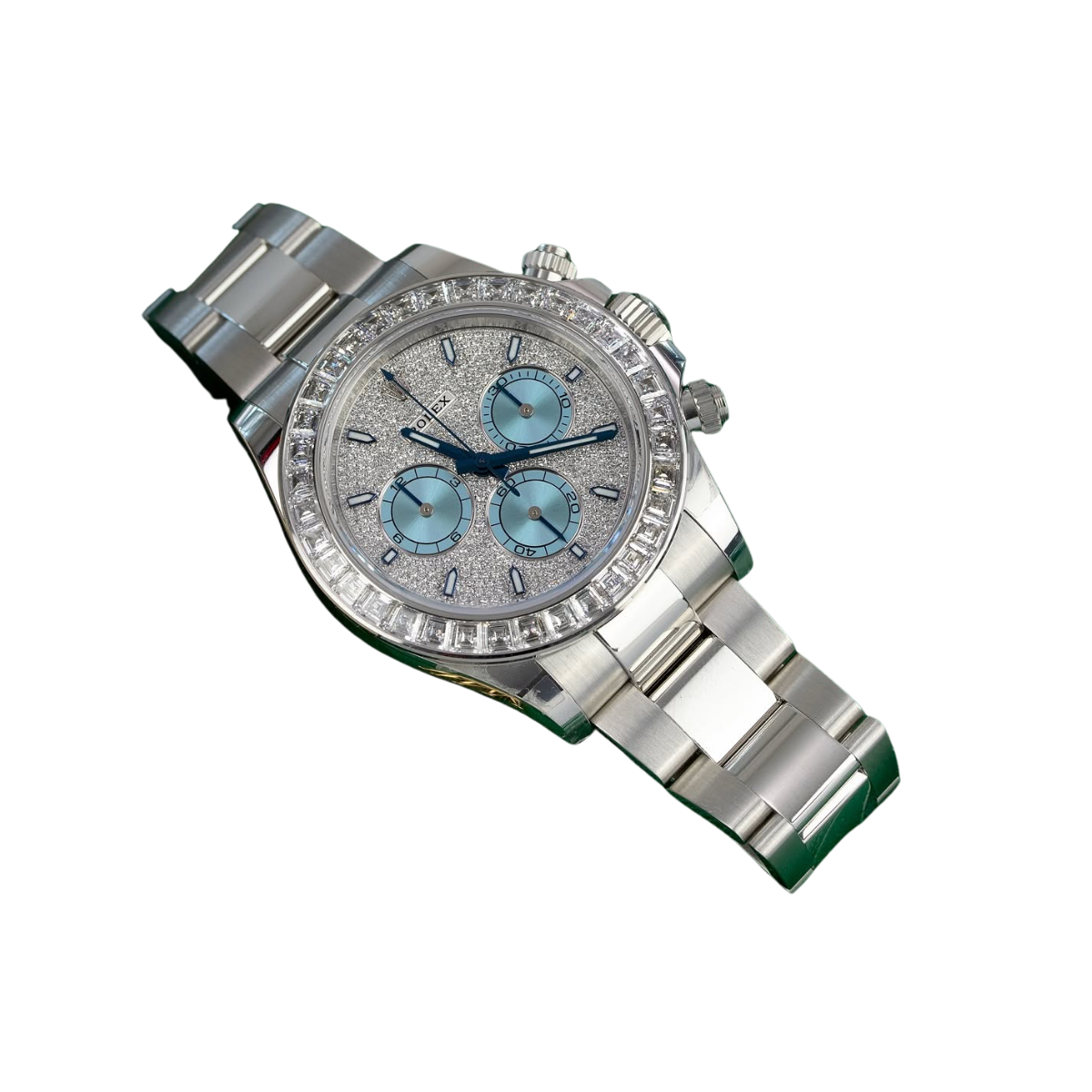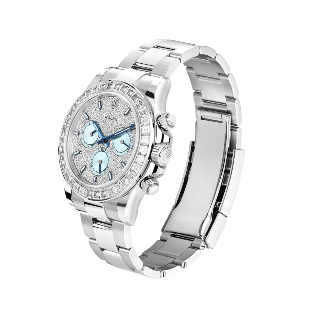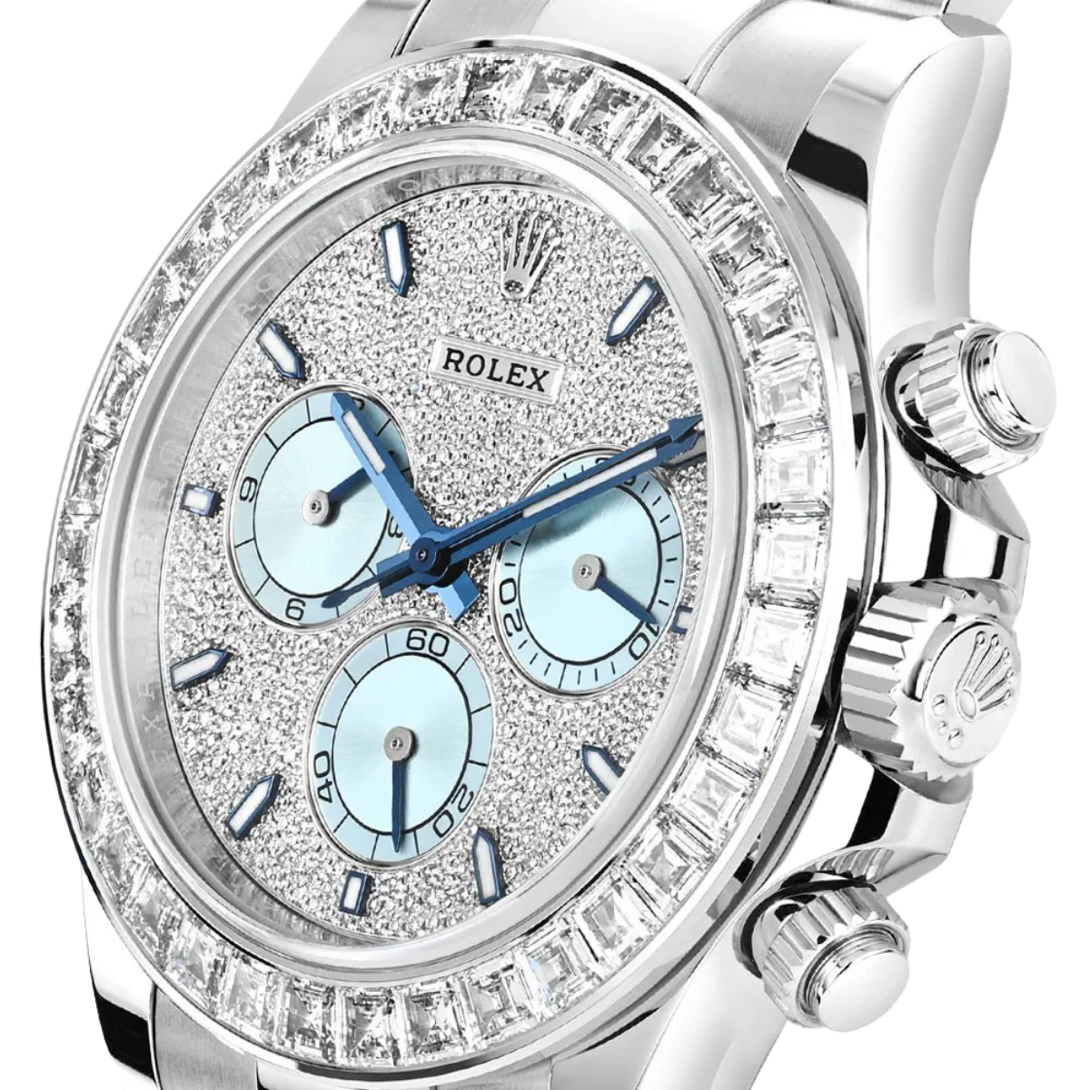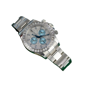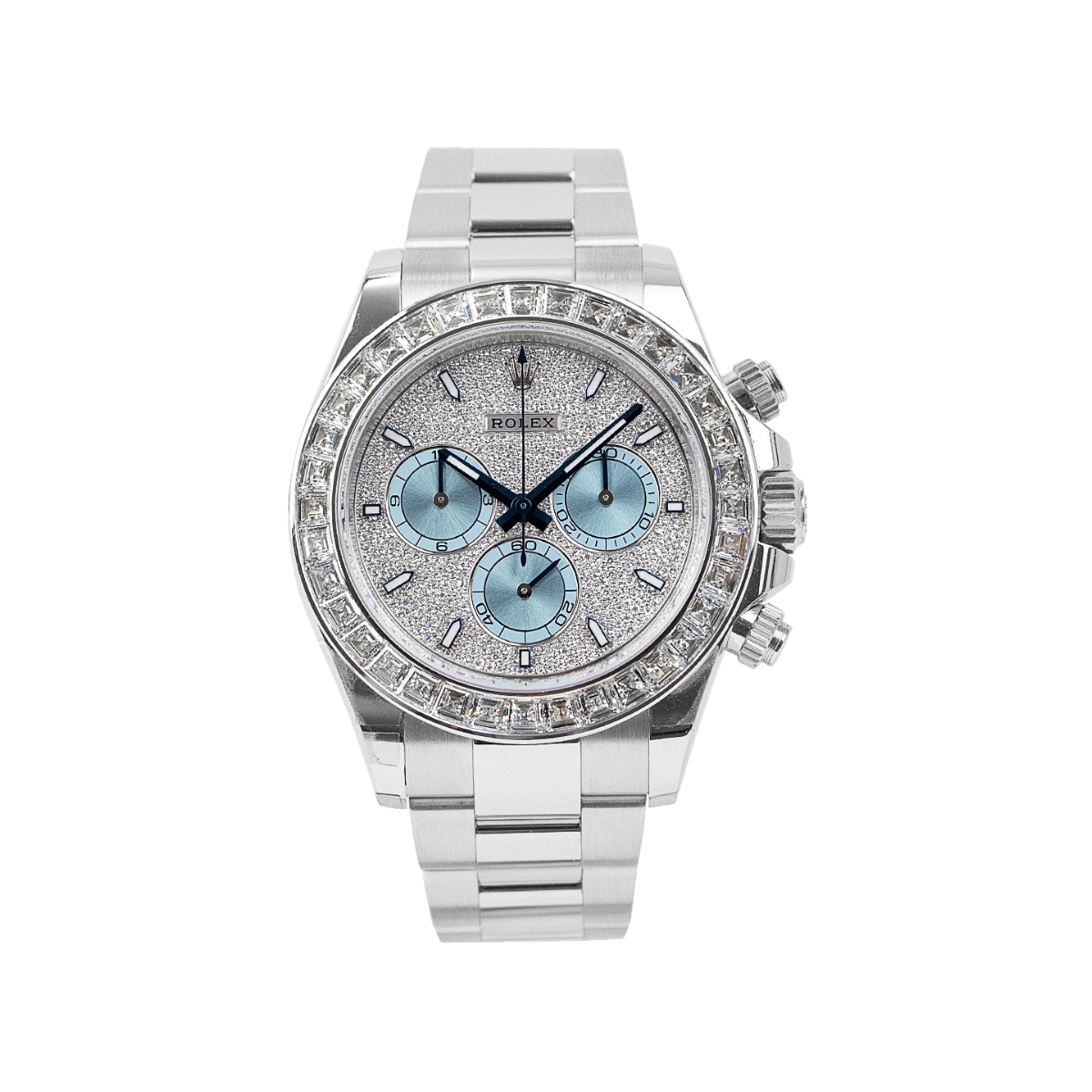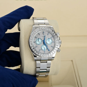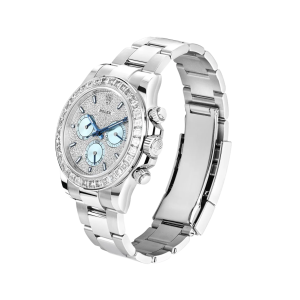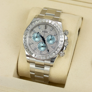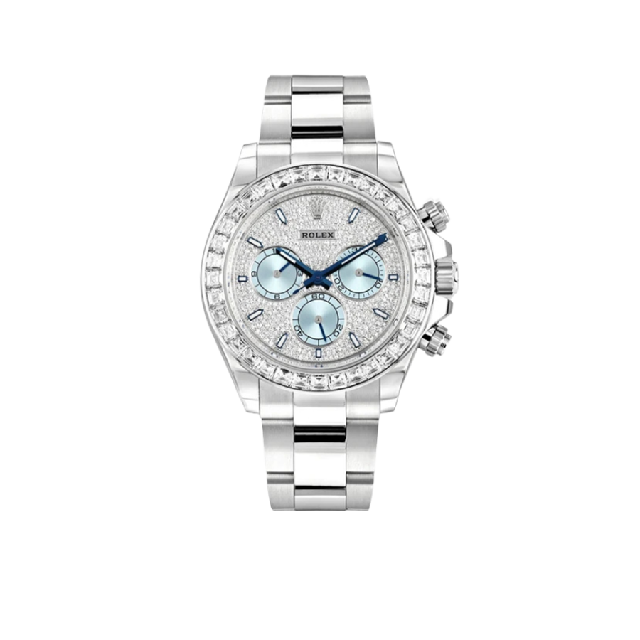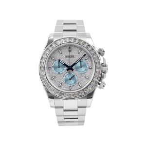 A true standout in the Rolex lineup, this diamond-studded Daytona ref. 116576TBR makes a bold statement in noble platinum. The 40mm case showcases a cool-toned platinum sheen, enhanced by the diamond-set bezel with 36 baguette diamonds and the diamond-paved dial finished with ice blue sub-dials. This Rolex platinum watch is powered by the Rolex in-house caliber 4130, a certified Swiss chronometer that offers a power reserve of up to 72 hours.