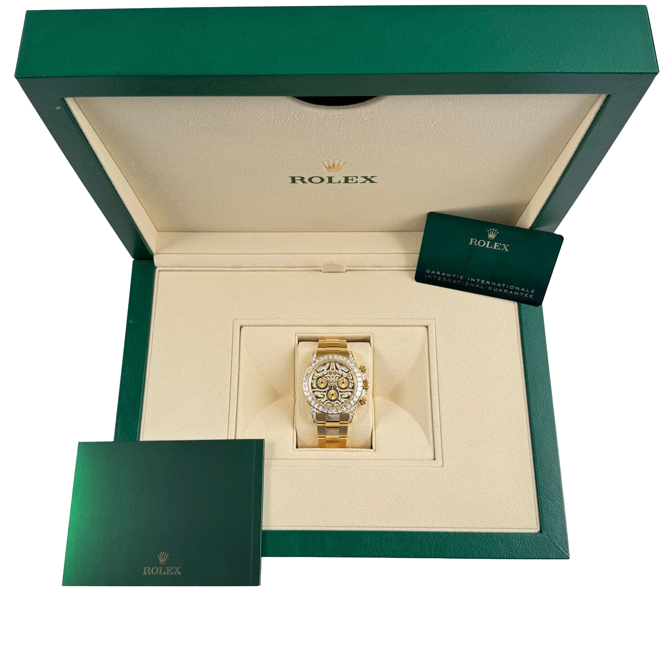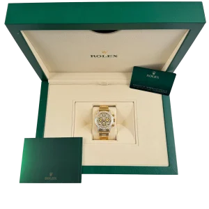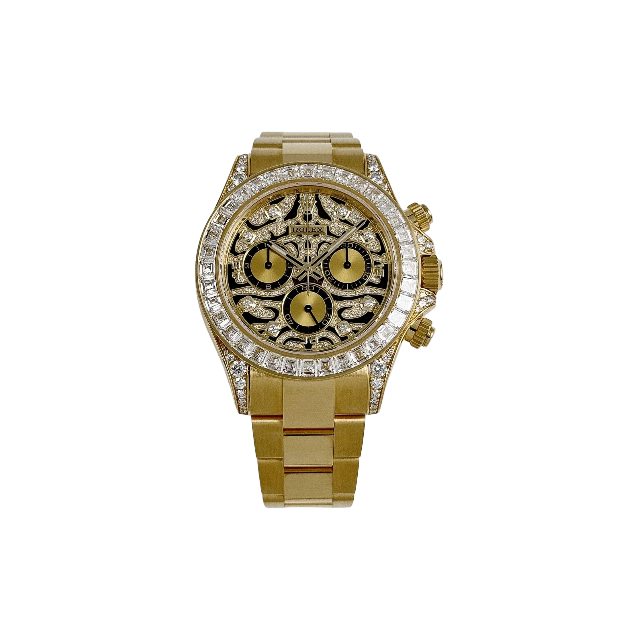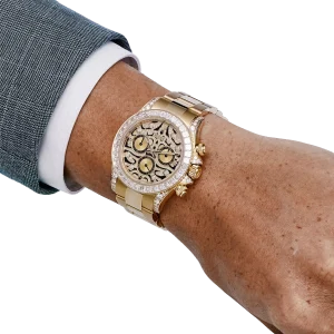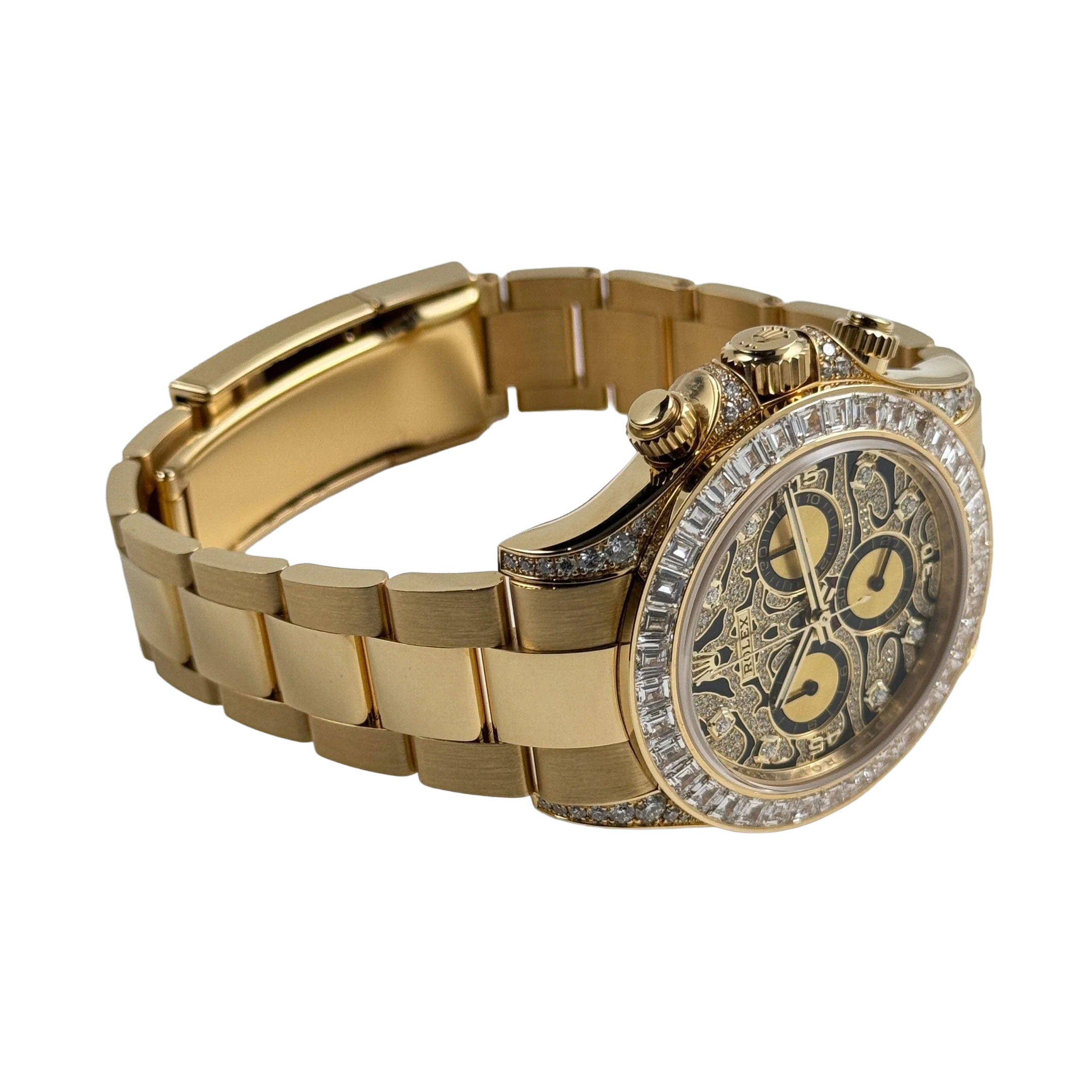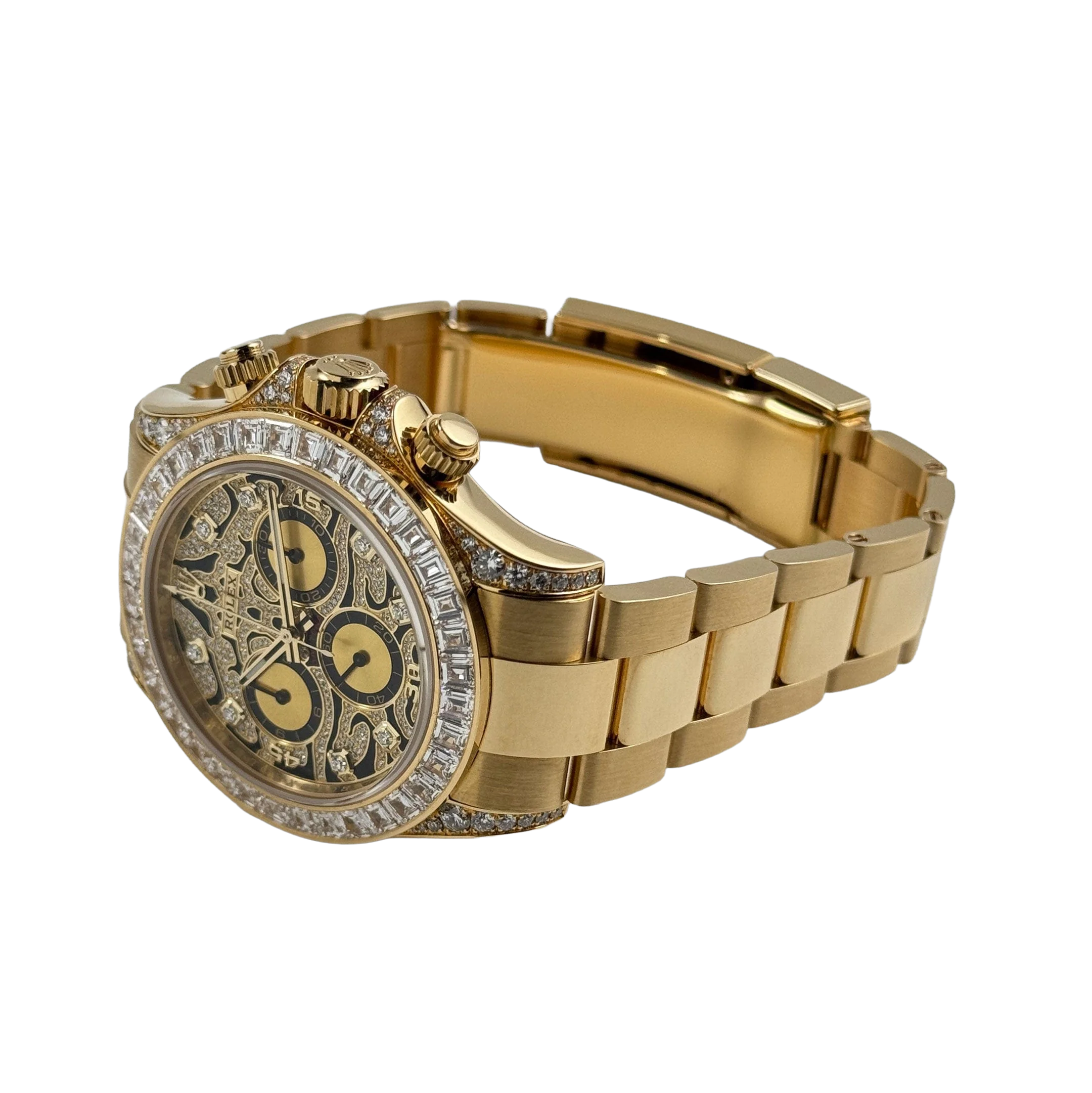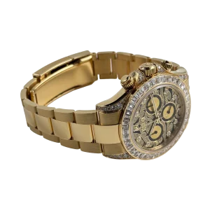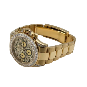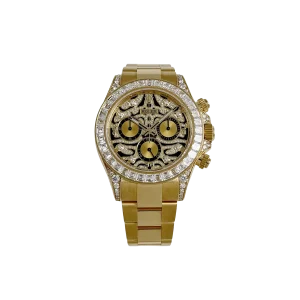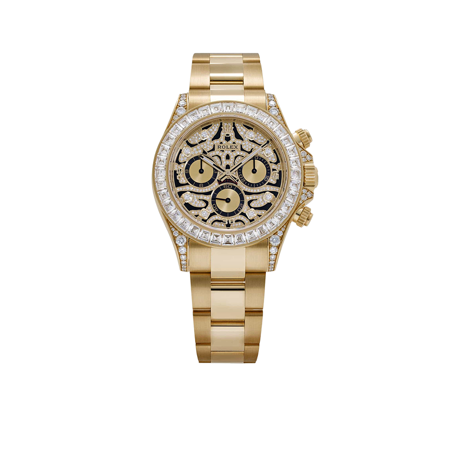 The Rolex Daytona “Eye of the Tiger” is an audacious interpretation of the brand’s iconic Daytona chronograph—a 40 mm case in 18k yellow gold paired with a striking black-and-gold tiger-pattern dial, baguette and brilliant-cut diamonds around the bezel, and diamond-set lugs elements. The combination of full-gold construction, tiger motif dial, and top-tier gem-setting has made it among the most sought-after modern Daytonas.