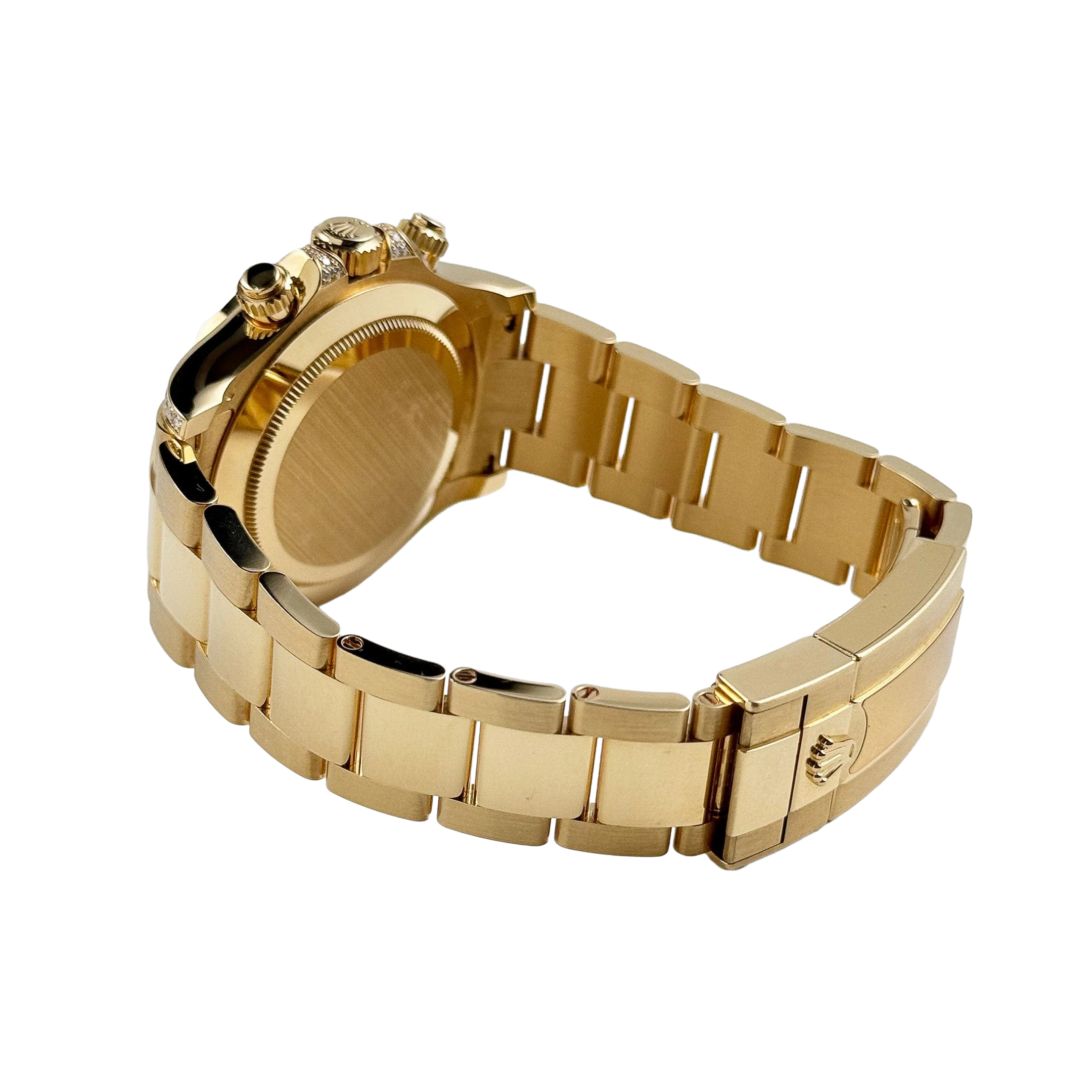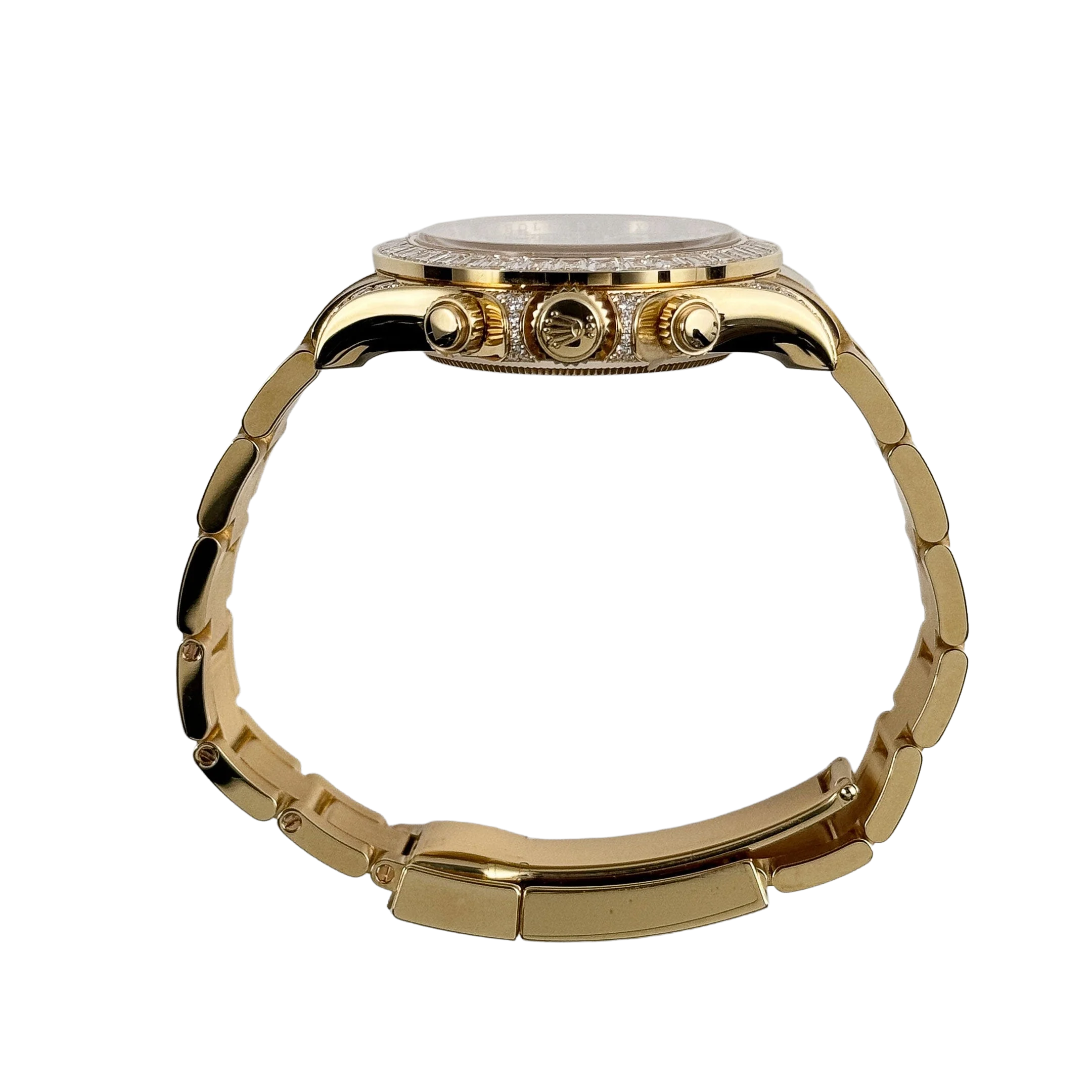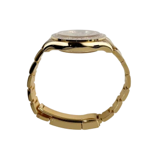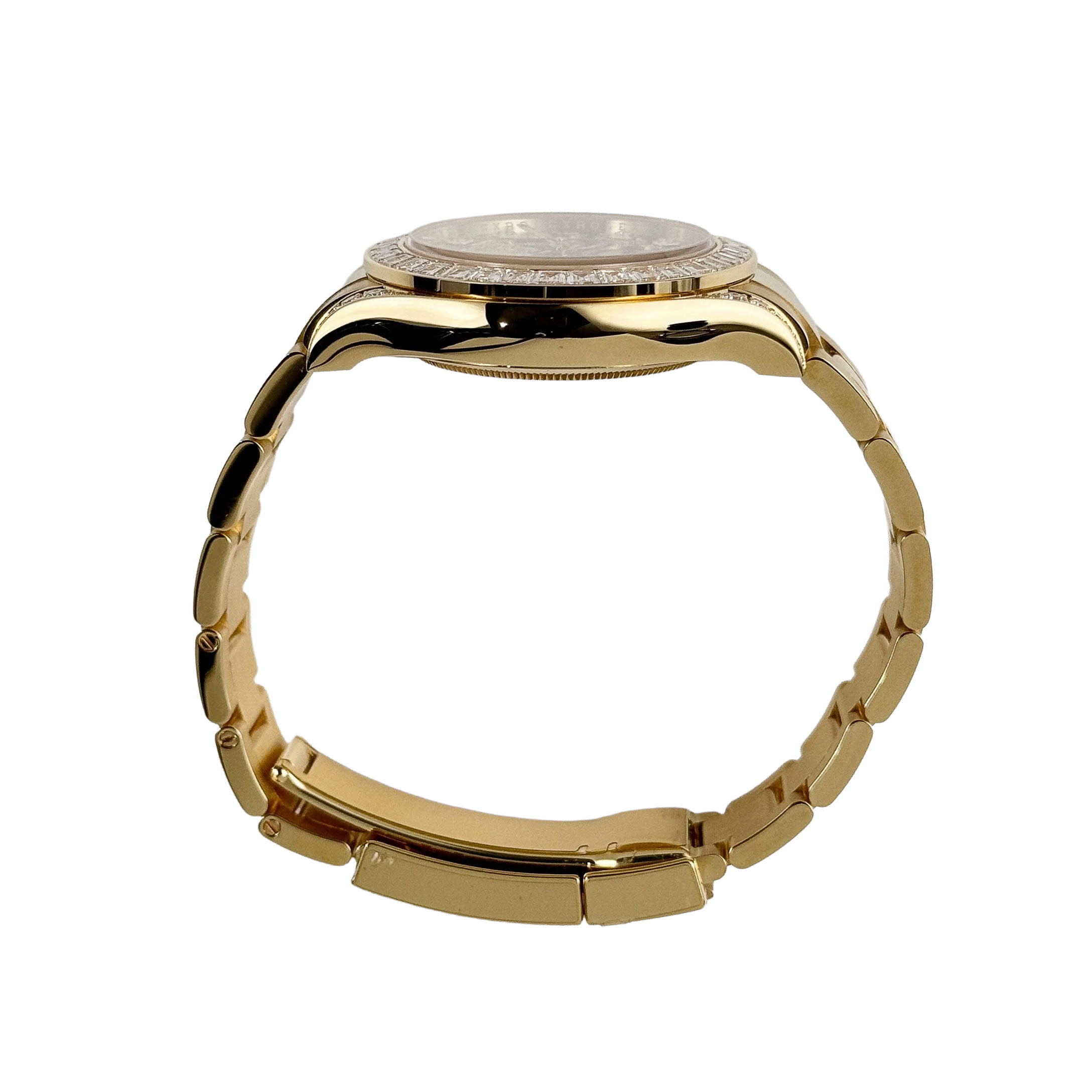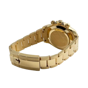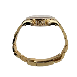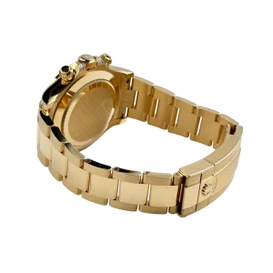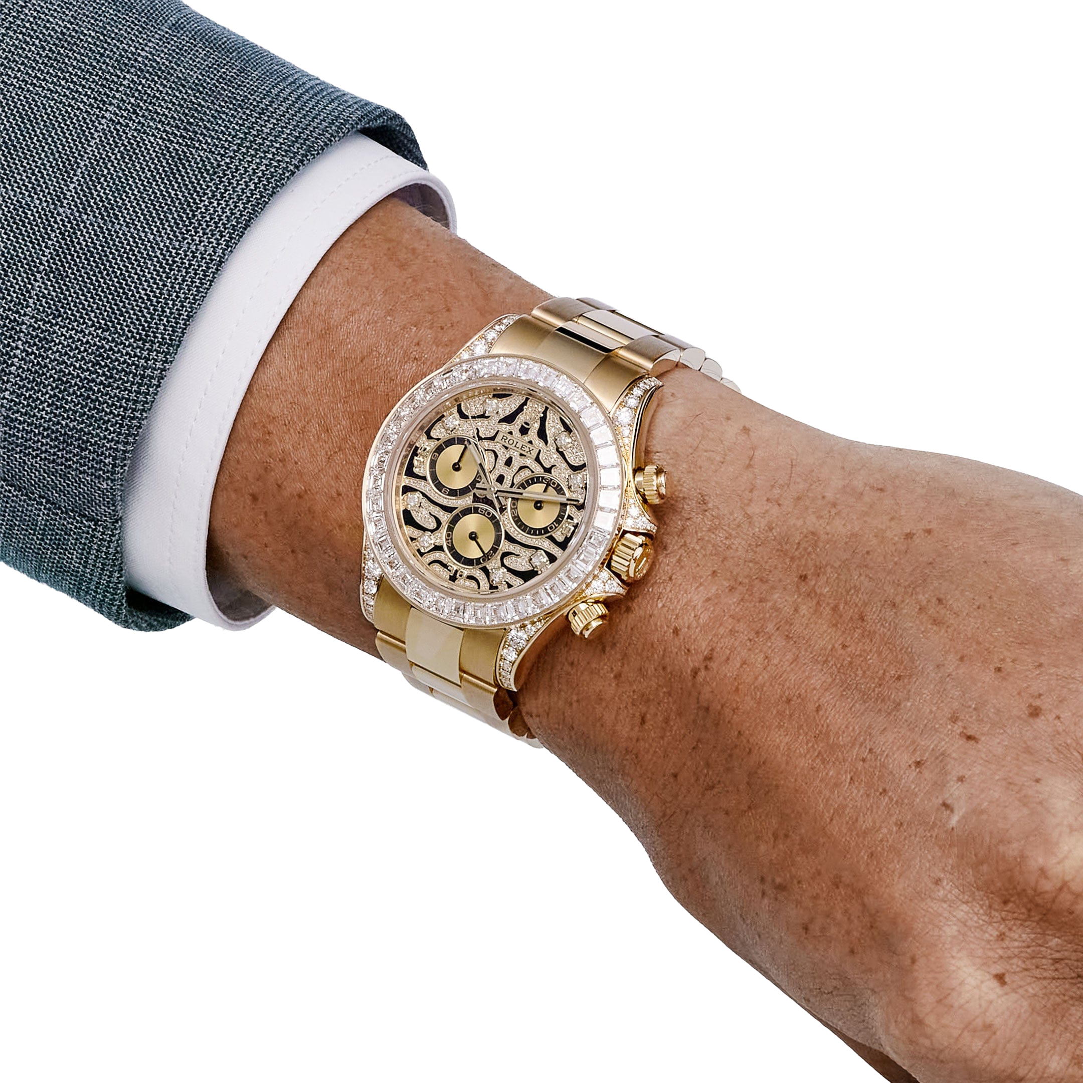The Rolex Daytona “Eye of the Tiger” is an audacious interpretation of the brand’s iconic Daytona chronograph—a 40 mm case in 18k yellow gold paired with a striking black-and-gold tiger-pattern dial, baguette and brilliant-cut diamonds around the bezel, and diamond-set lugs elements. The combination of full-gold construction, tiger motif dial, and top-tier gem-setting has made it among the most sought-after modern Daytonas.