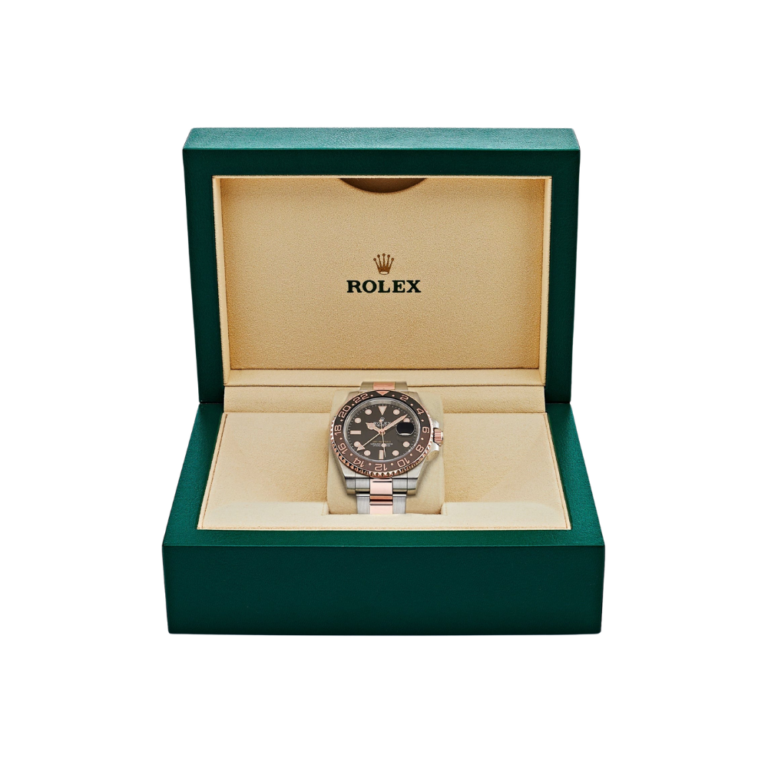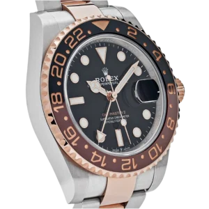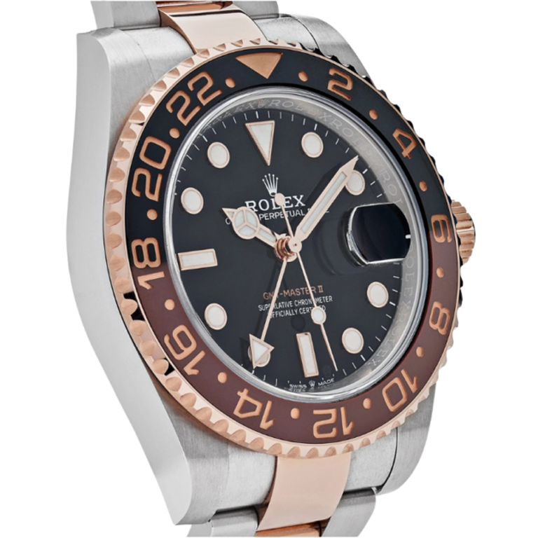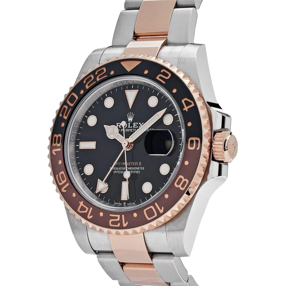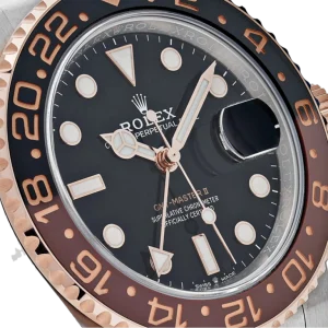 The Rolex GMT-Master II 126711CHNR, affectionately known as the ‘Root Beer,’ offers a sophisticated blend of luxury and practicality for modern travelers. Its 40mm stainless steel case is accented with 18k Everose gold on the bidirectional rotatable Cerachrom bezel, featuring a brown and black two-tone design. This signature bezel allows easy tracking of a second time zone, a hallmark of the GMT-Master II.
