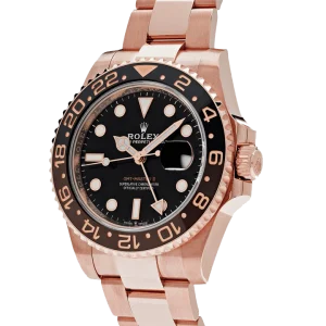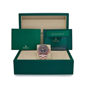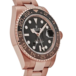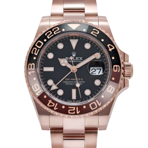 The Rolex GMT-Master II 126715CHNR, known as the “Root Beer,” is an exquisite reinterpretation of a legendary design, now presented in full 18k Everose gold. This modern iteration pays homage to the vintage two-tone Root Beer models while offering a completely elevated aesthetic with a black and brown Cerachrom bezel that exudes warmth and refinement. The Everose gold case and Oyster bracelet add a level of sophistication that sets this model apart from its steel and two-tone counterparts, making it a truly distinctive piece in the GMT-Master II lineup.
