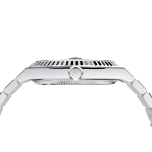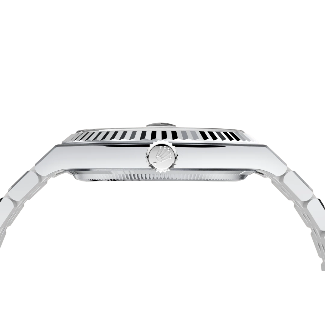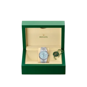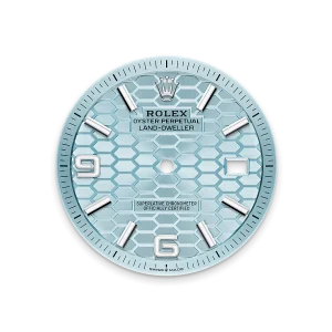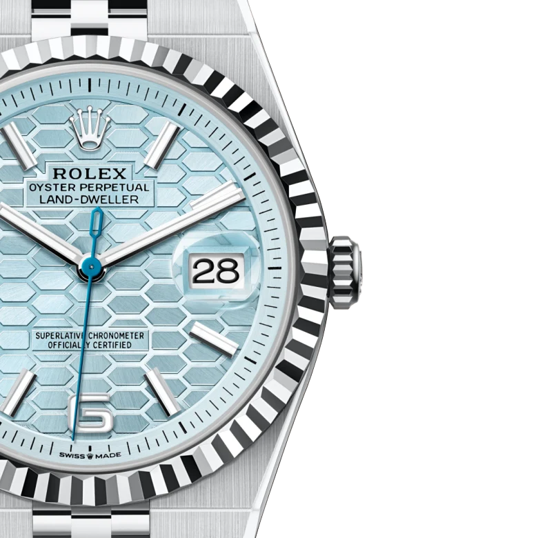 Its standout feature is the Ice Blue dial with a honeycomb relief pattern, a design language reserved exclusively for Rolex platinum models. White gold hands and hour markers coated with Chromalight ensure exceptional legibility and a clean, crisp look even in low light.