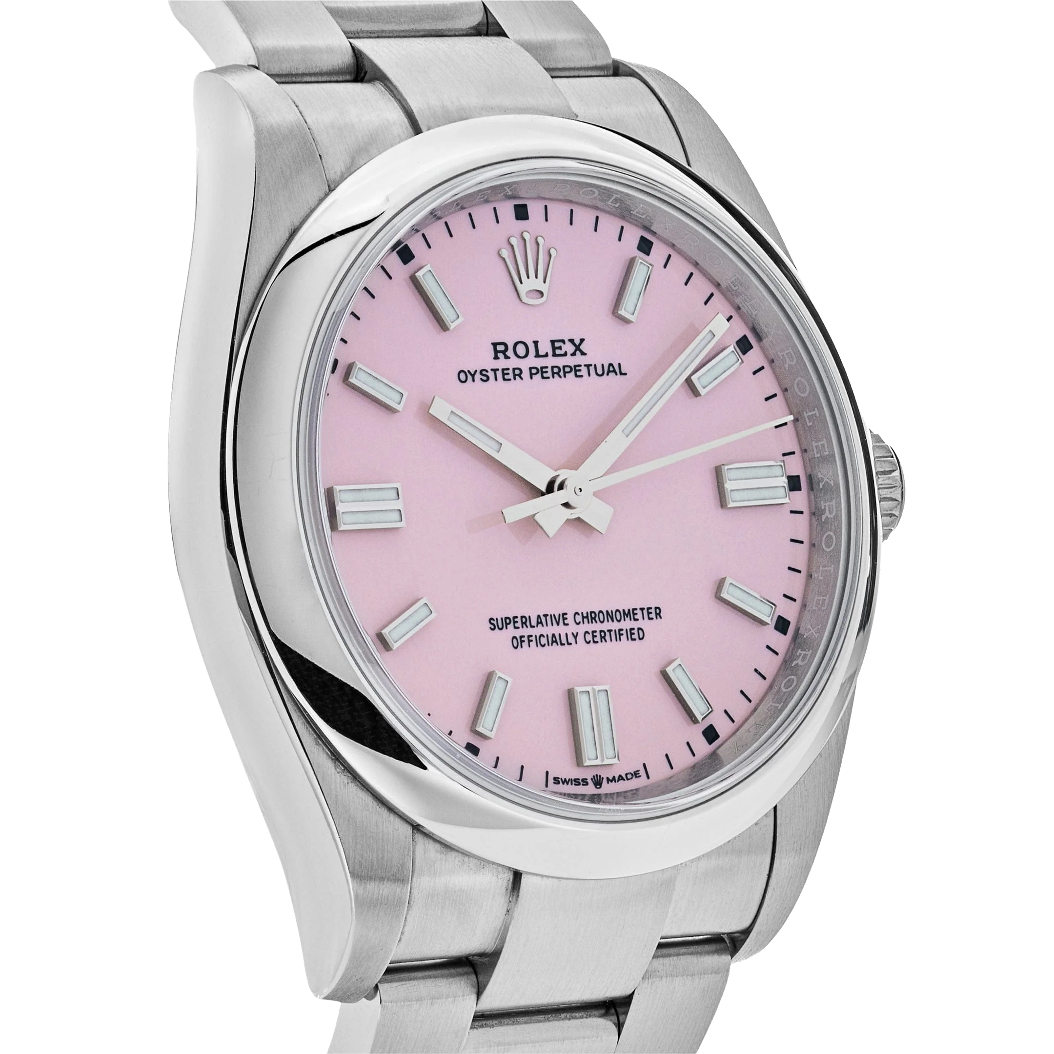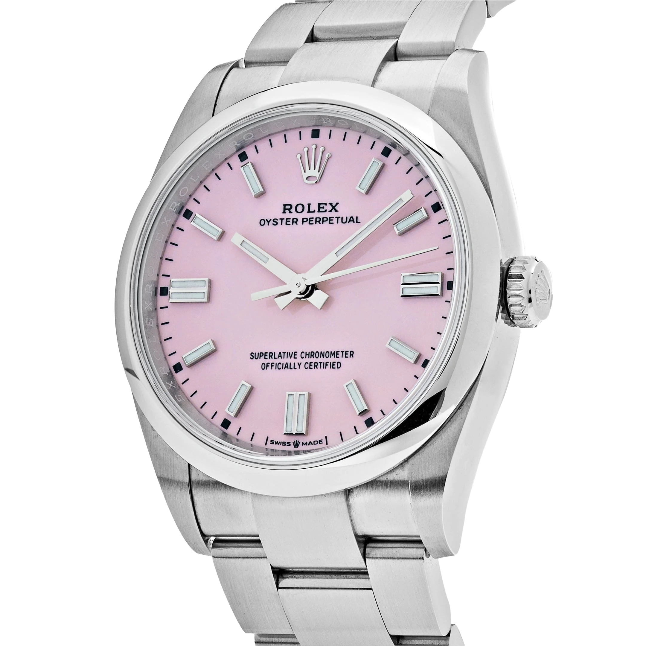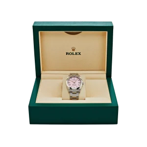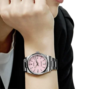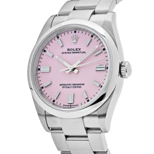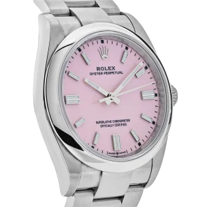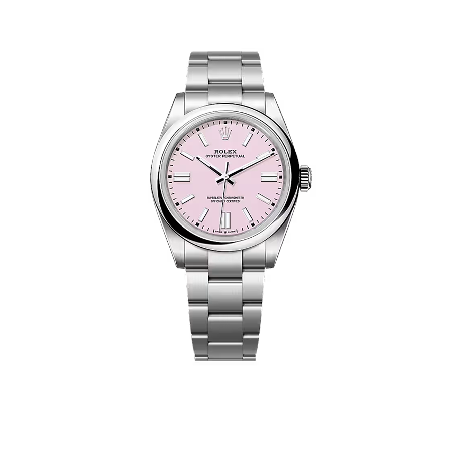 The Rolex Oyster Perpetual 41 ref. 134300-0013 Candy Pink is a perfect blend of timeless classic design and modern sophistication, highlighted by its vibrant candy pink dial. Crafted from corrosion-resistant Oystersteel, the watch is powered by the self-winding Calibre 3230 movement with approximately 70 hours of power reserve and 100-meter water resistance, ensuring exceptional durability and performance. The lacquered candy pink dial, paired with luminous hour markers and hands, creates a bold and stylish look that is equally suited for everyday wear and special occasions.