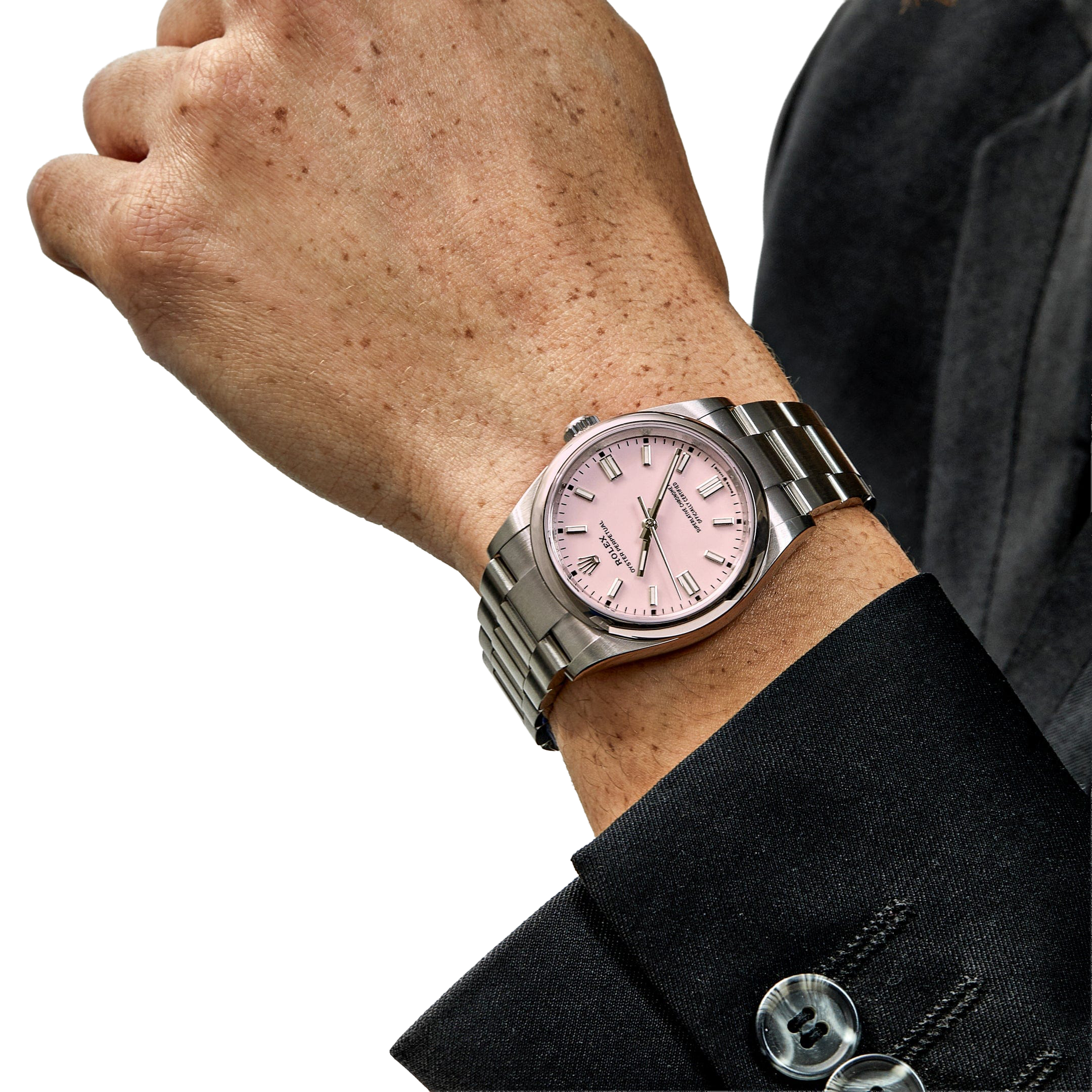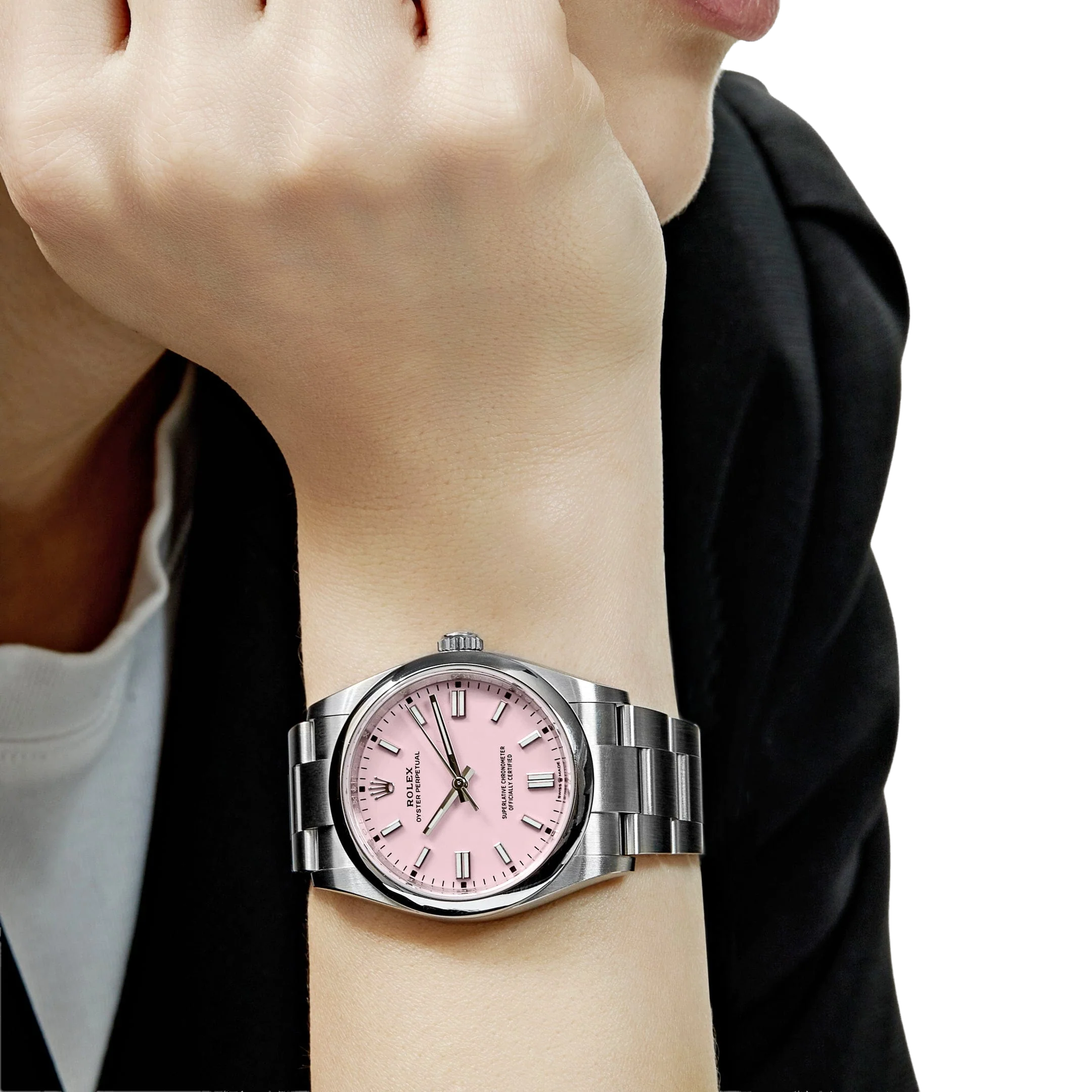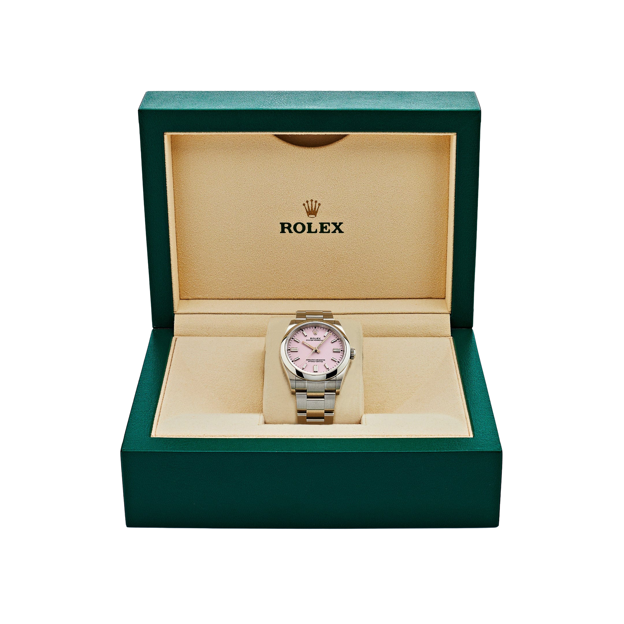 The Rolex Oyster Perpetual 41 ref. 134300-0013 Candy Pink is a perfect blend of timeless classic design and modern sophistication, highlighted by its vibrant candy pink dial. Crafted from corrosion-resistant Oystersteel, the watch is powered by the self-winding Calibre 3230 movement with approximately 70 hours of power reserve and 100-meter water resistance, ensuring exceptional durability and performance. The lacquered candy pink dial, paired with luminous hour markers and hands, creates a bold and stylish look that is equally suited for everyday wear and special occasions.
