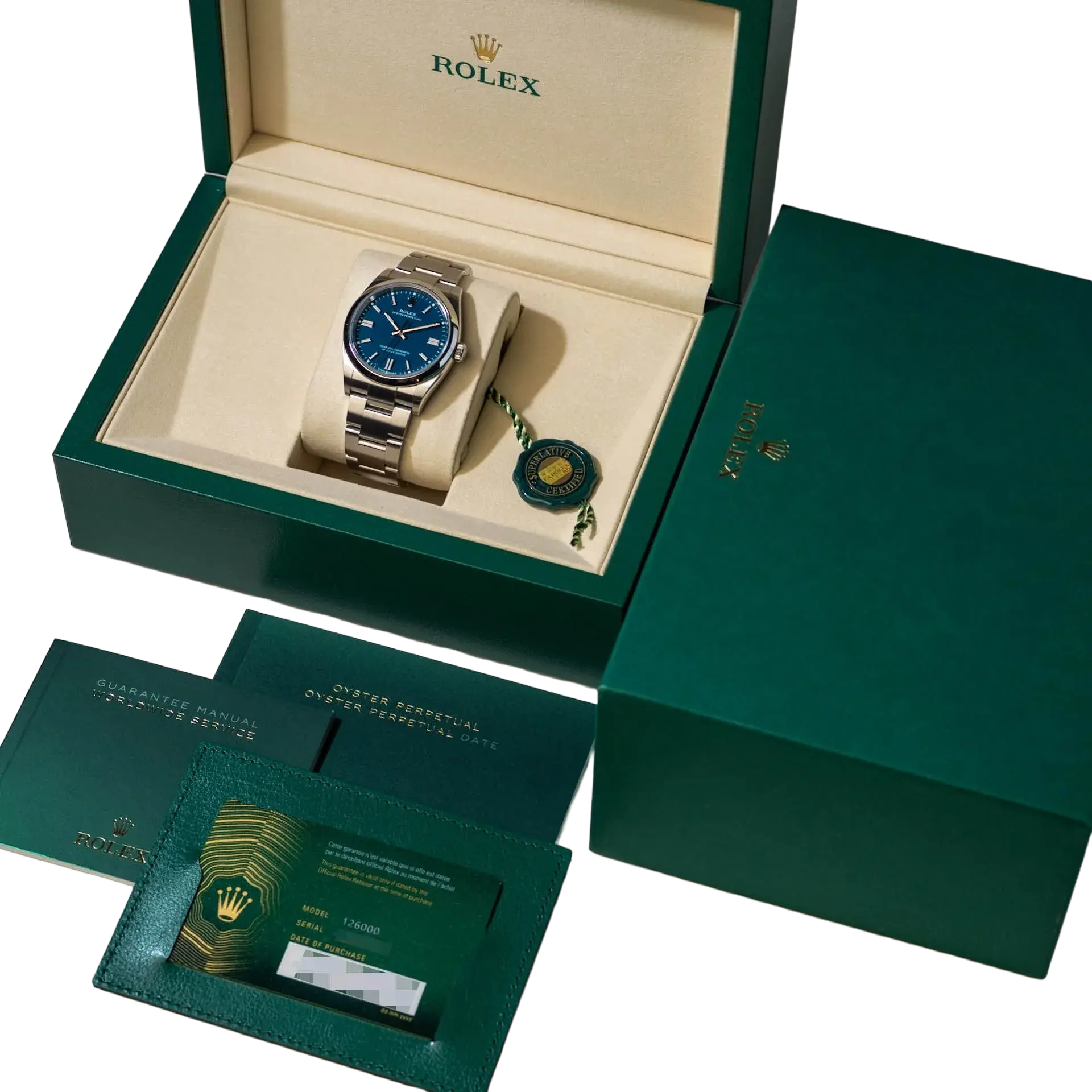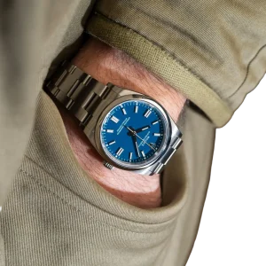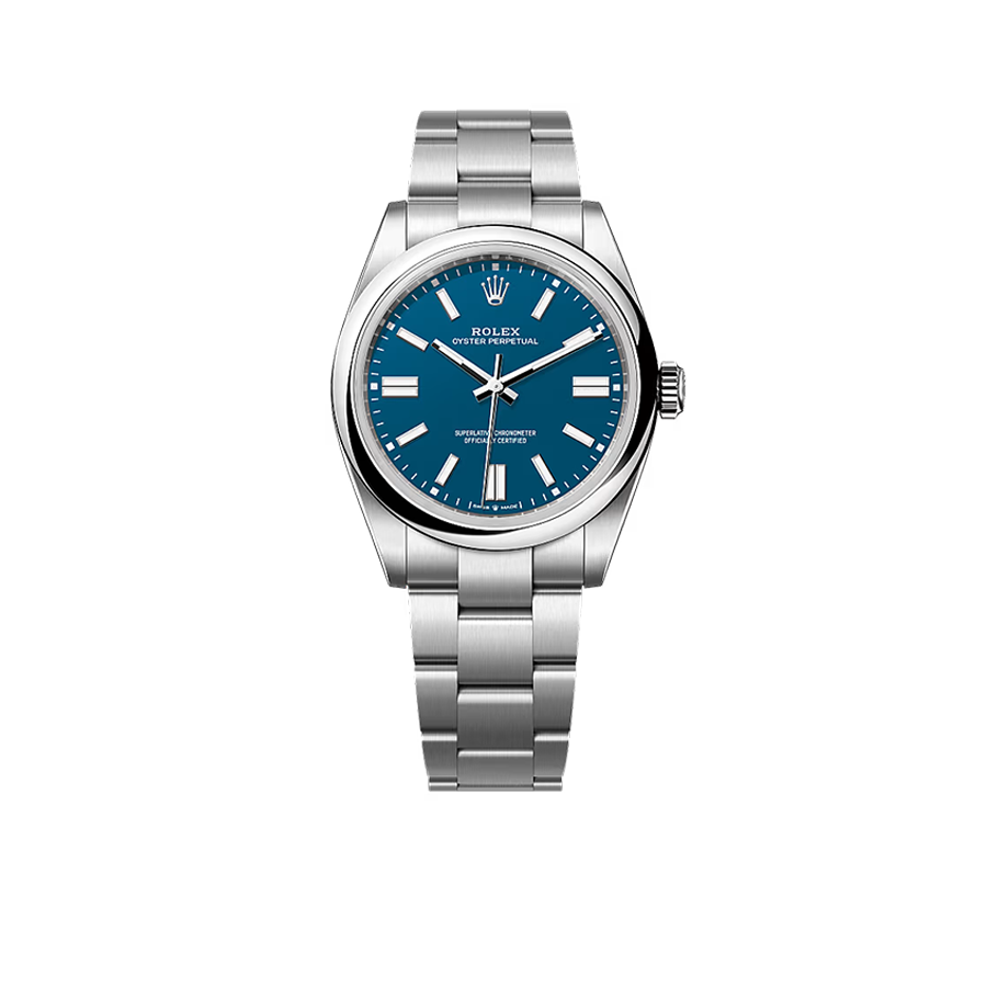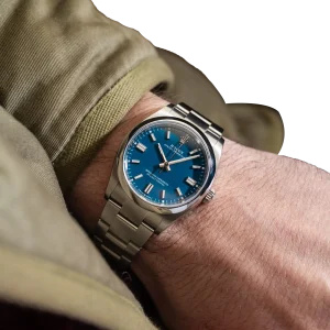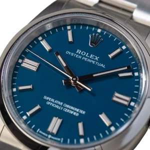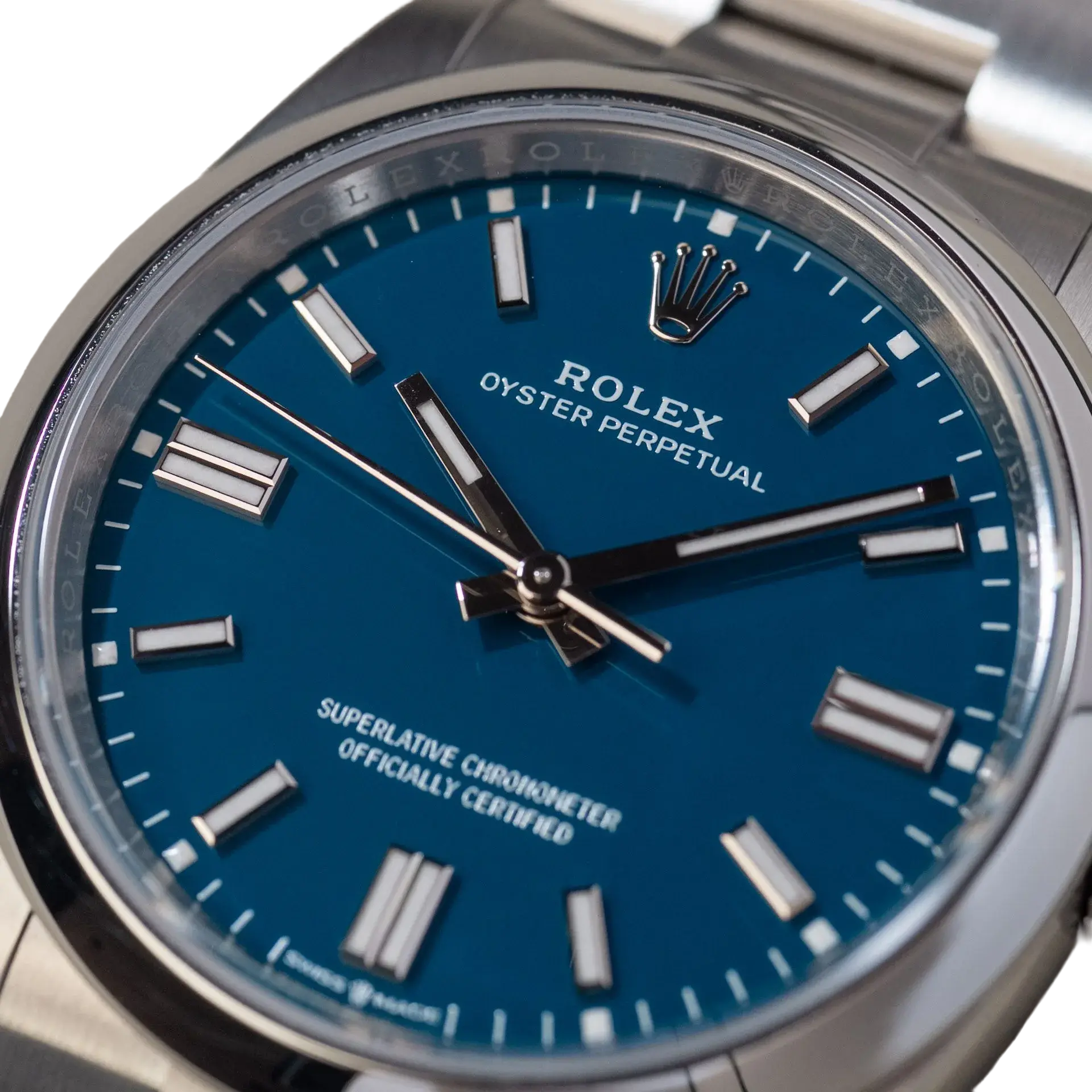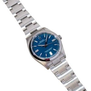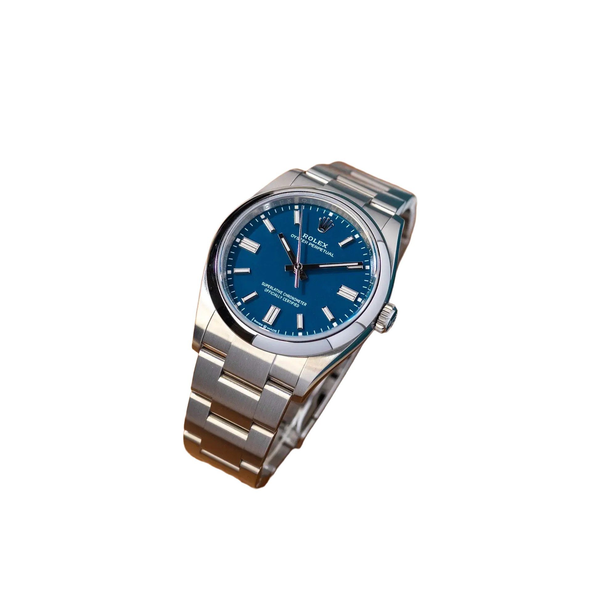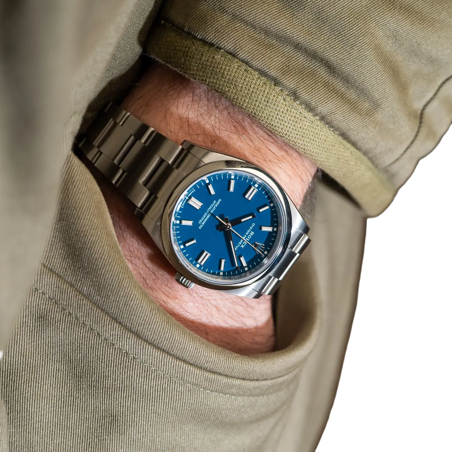 The Rolex Oyster Perpetual 41 ref. 134300 Blue is a refined blend of timeless classic design and modern style, highlighted by its deep blue dial. The watch features a corrosion-resistant Oystersteel case, a self-winding Calibre 3230 movement with approximately 70 hours of power reserve, and 100-meter water resistance, ensuring outstanding performance and durability. The lacquered blue dial with luminous hour markers creates an elegant, versatile look that transitions effortlessly from everyday wear to formal occasions.